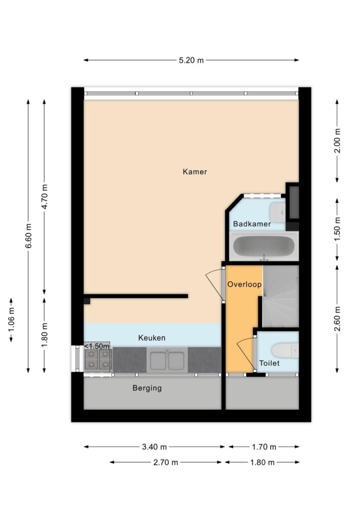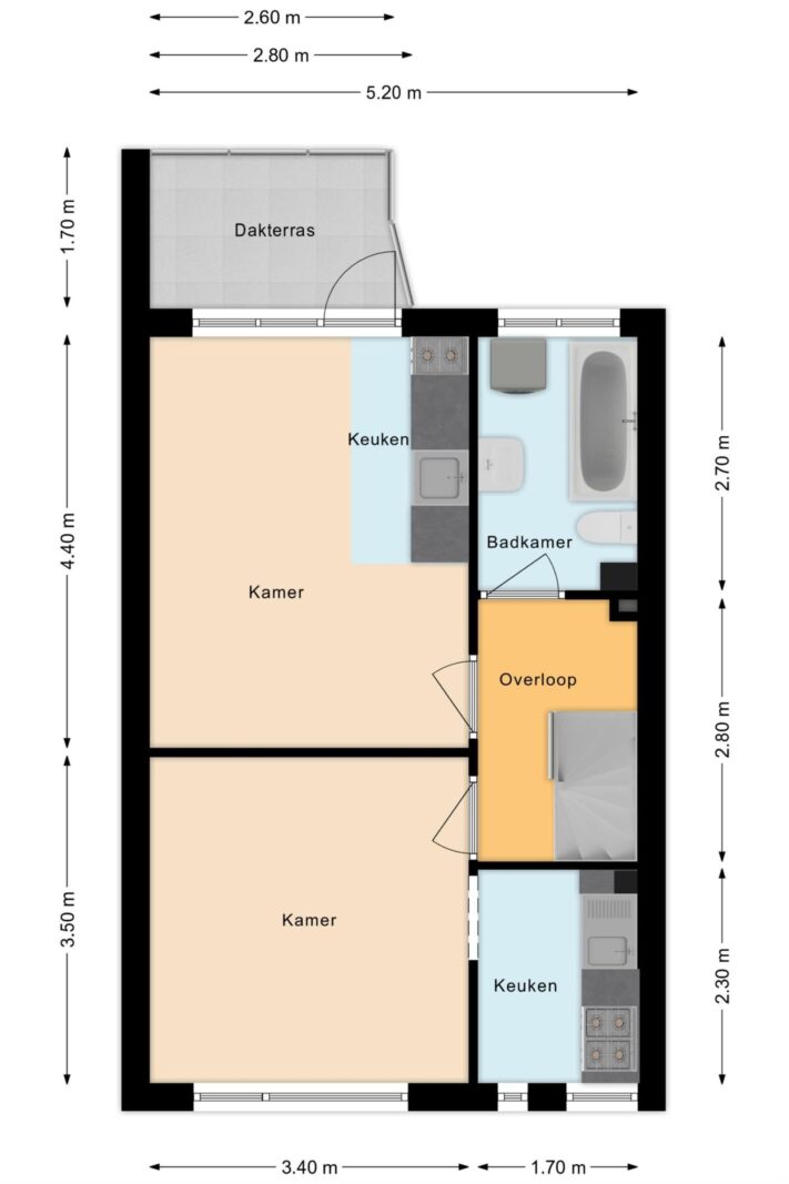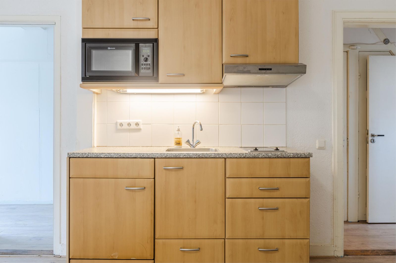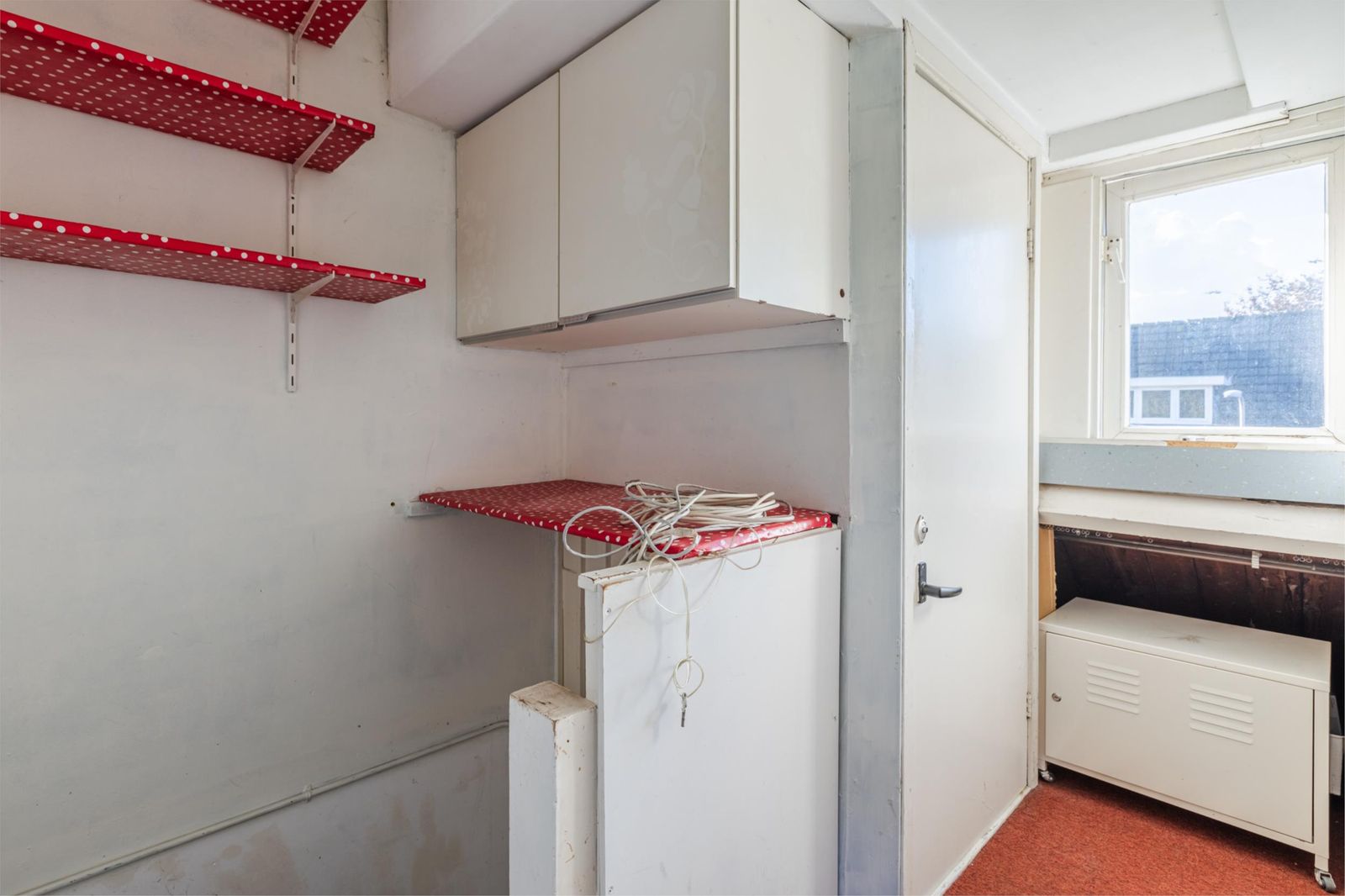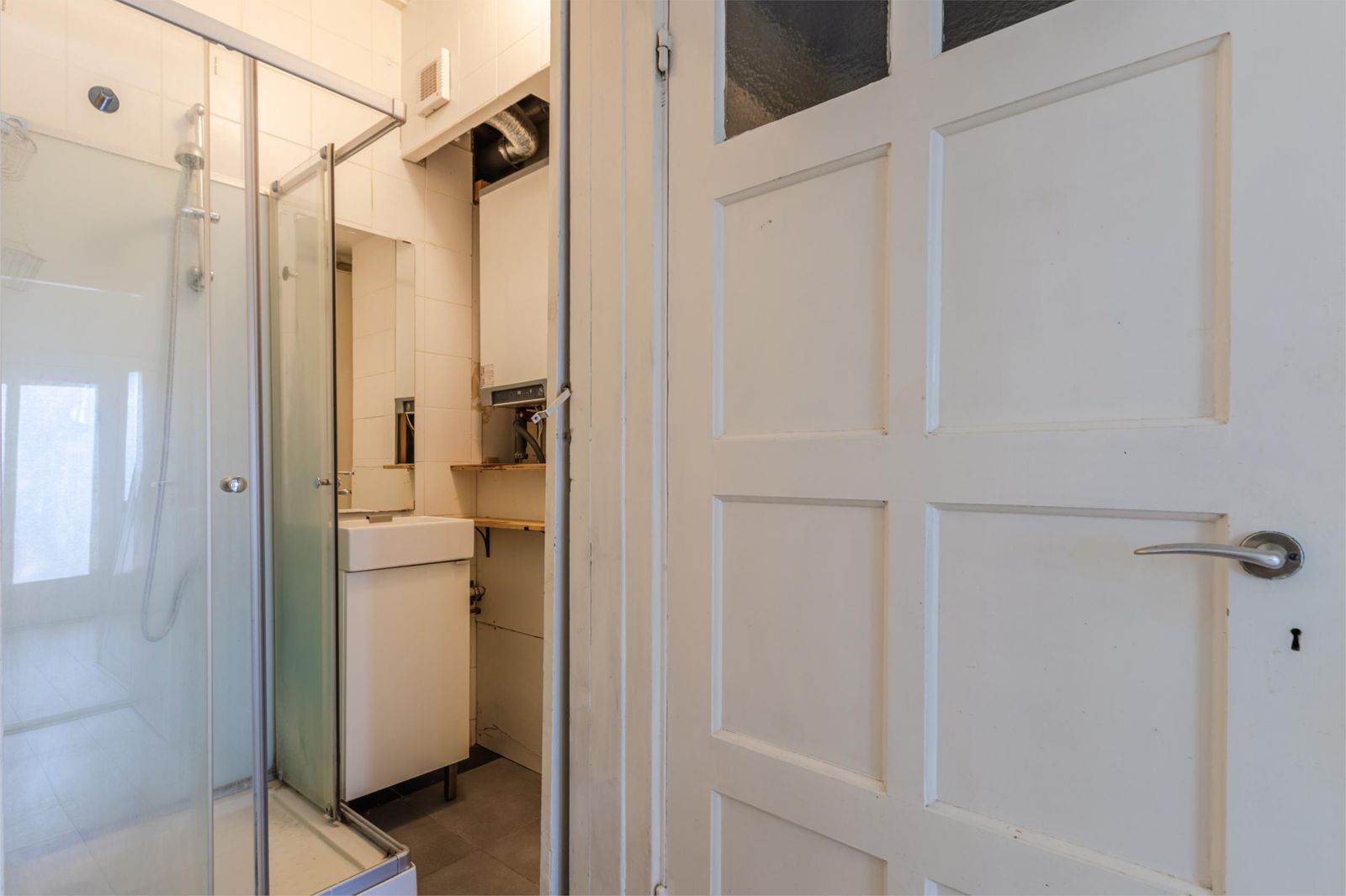 2e etage; toilet in de gang, deur naar een apartement met keuken en badkamer.