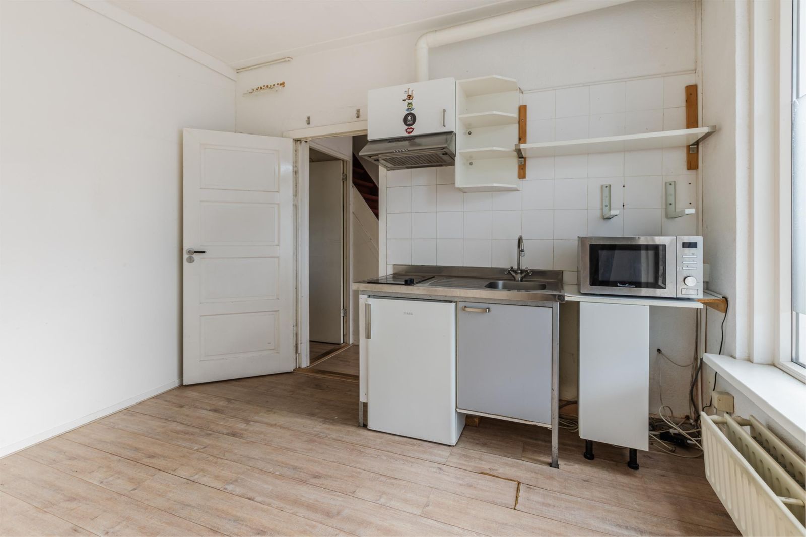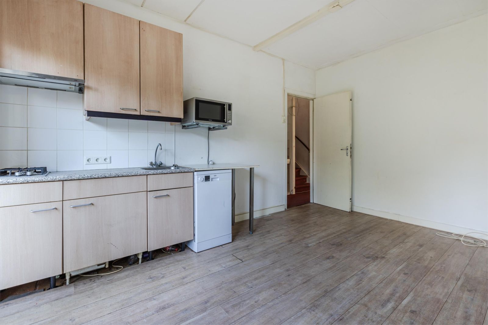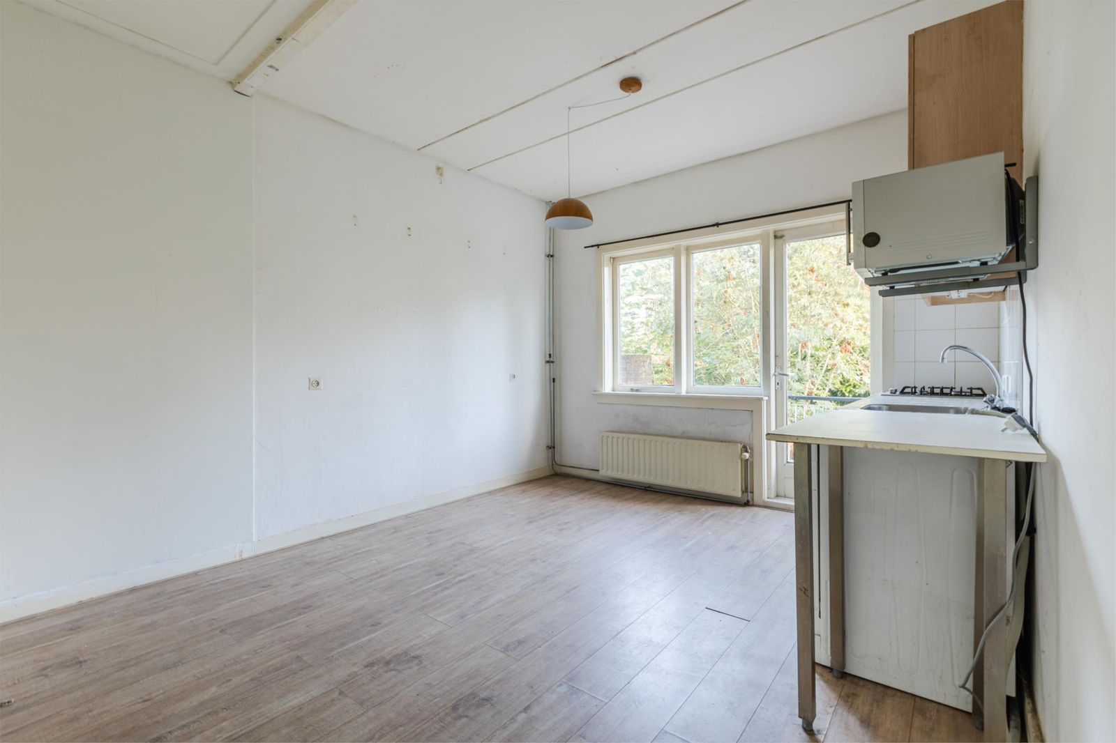 De woonkamer met openslaande deuren naar een grote tuin, verder een keukeunit en slaapkamer, de voorkamer is ook met keukenunit.