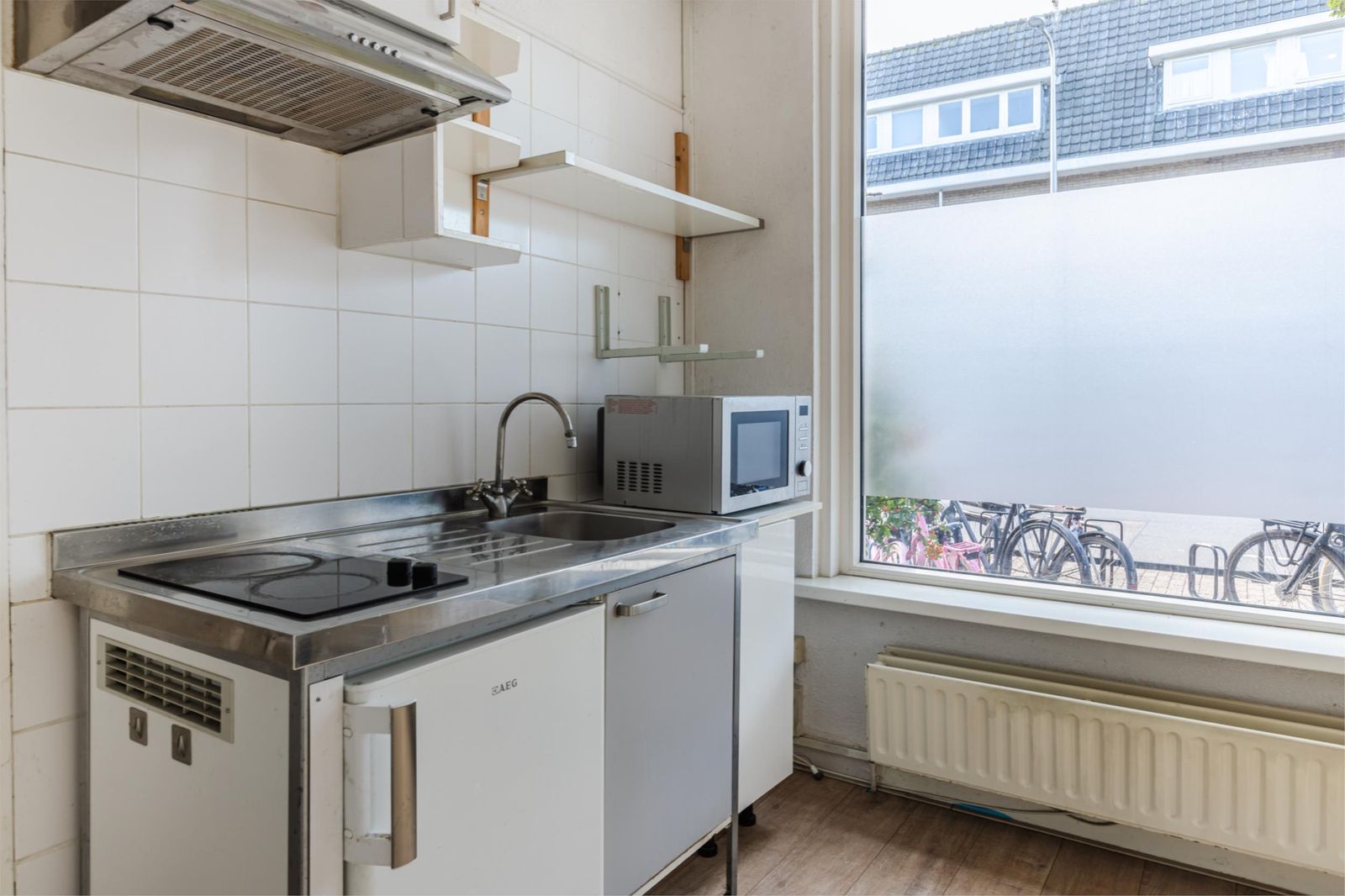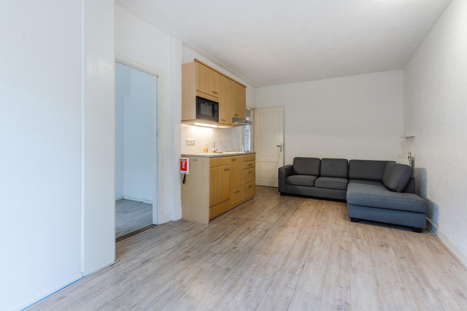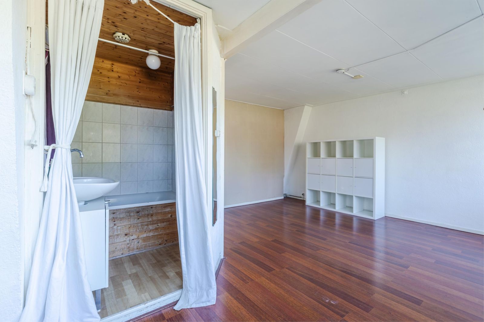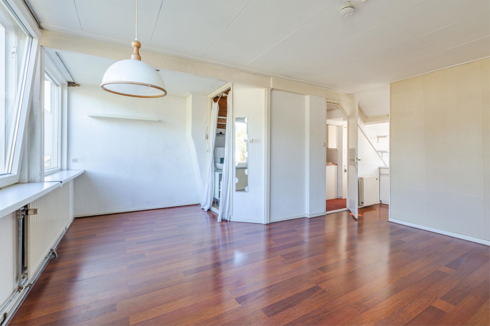 De woonkamer met openslaande deuren naar een grote tuin, verder een keukeunit en slaapkamer, de voorkamer is ook met keukenunit.
