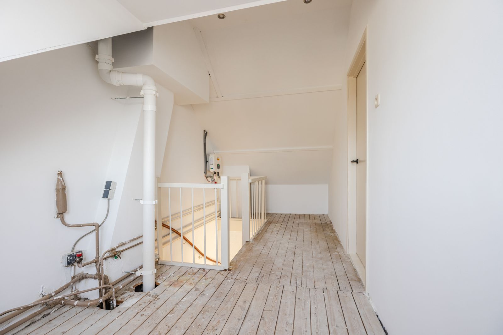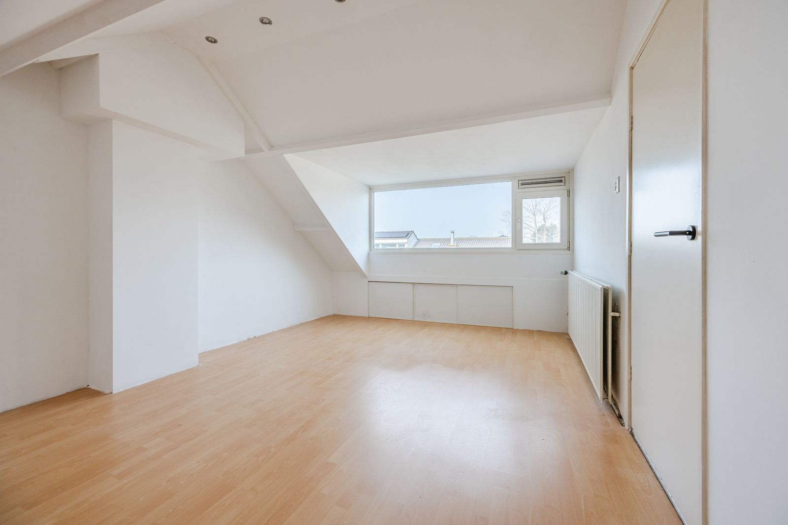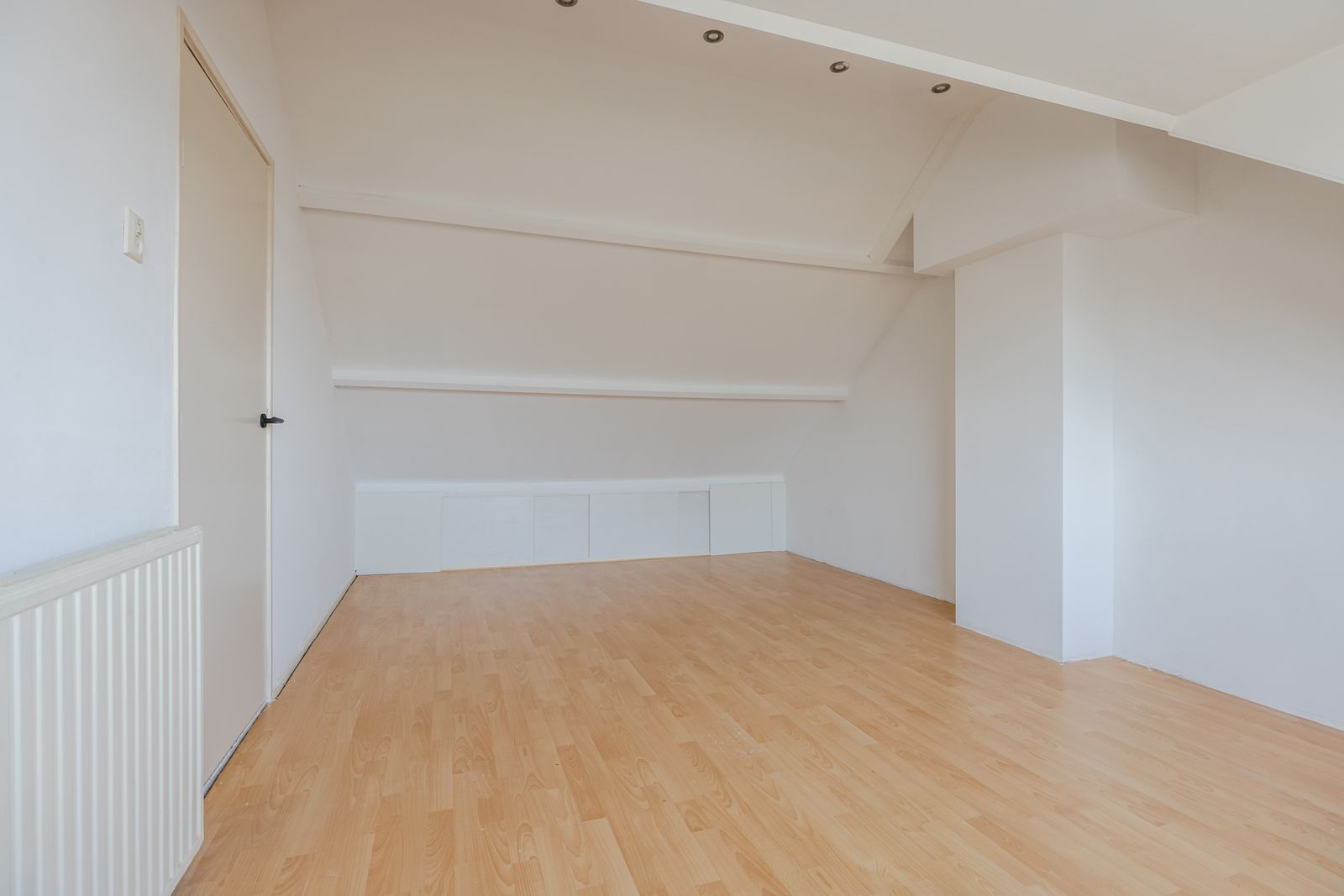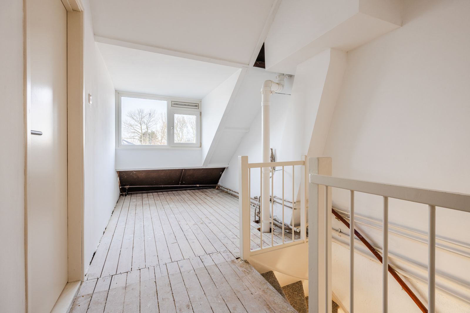 Voorzolder met dakkapel en ruimte voor opslag en techniek. Royale zolderkamer met kunststof dakkapel over de gehele breedte en veel bergruimte onder de schuine delen van het dak. Ideaal als slaapkamer, werkruimte of hobbykamer.
