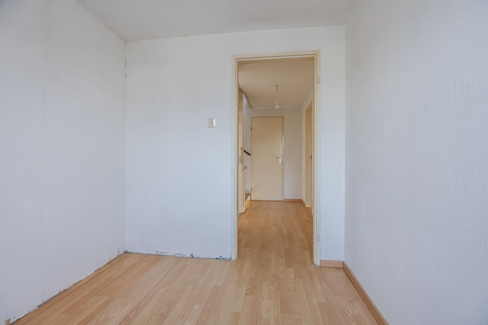 Drie slaapkamers, waarvan twee aan de achterzijde en één aan de voorzijde. De badkamer is voorzien van een toilet, wastafel en douche. Laminaatvloer en kunststof kozijnen met dubbel glas. Op de overloop een bergkast en trap naar de tweede verdieping.