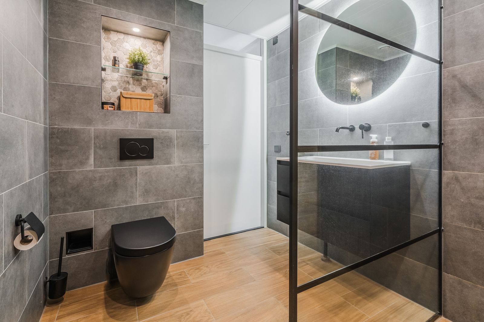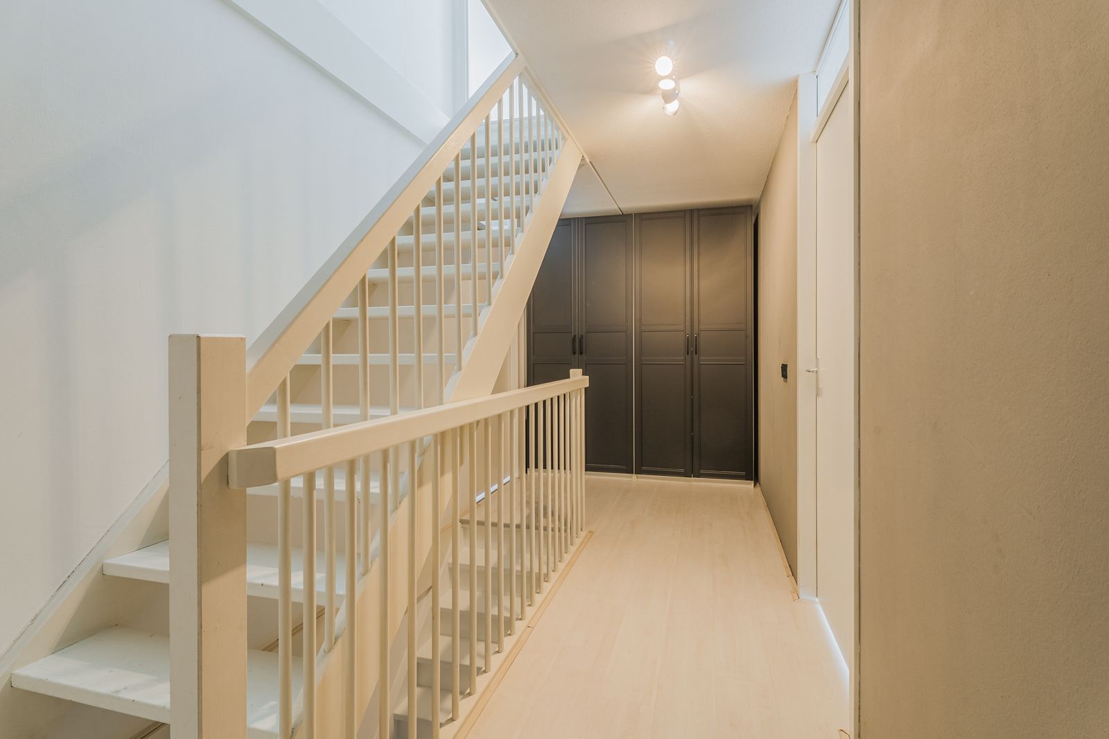 Daarnaast vind je op deze verdieping de moderne badkamer, voorzien van een inloopdouche, wastafelmeubel en toilet. Op de overloop is een grote kastenwand aanwezig met volop bergruimte.