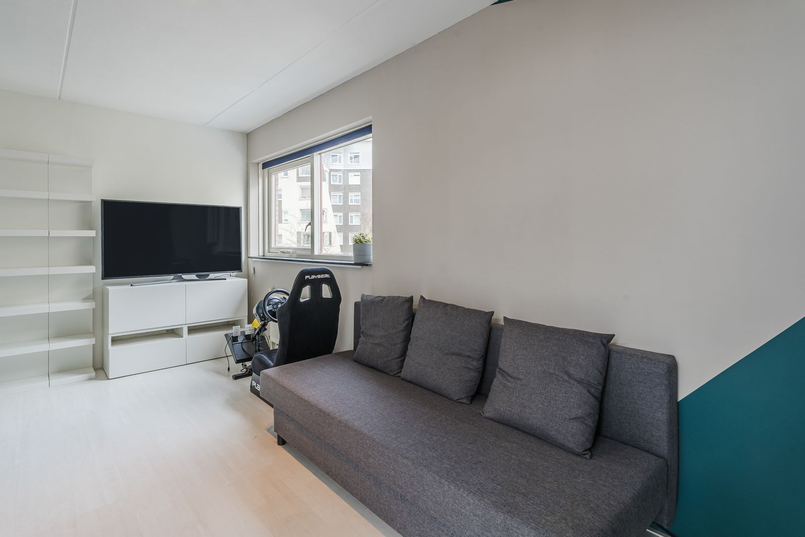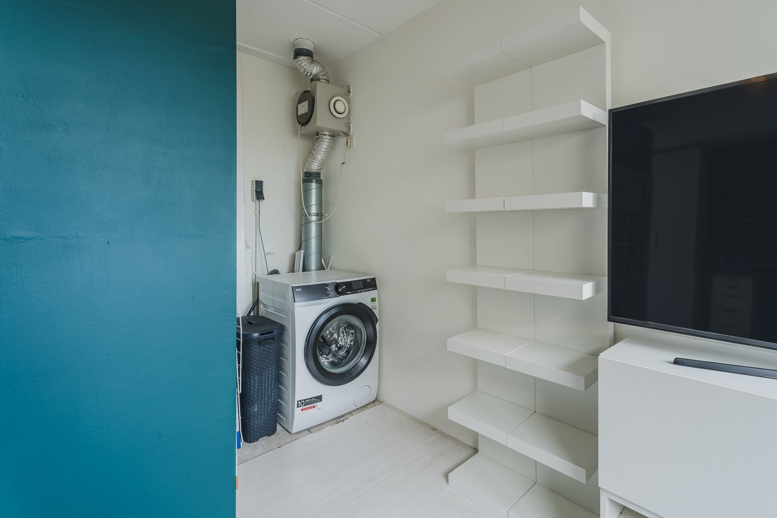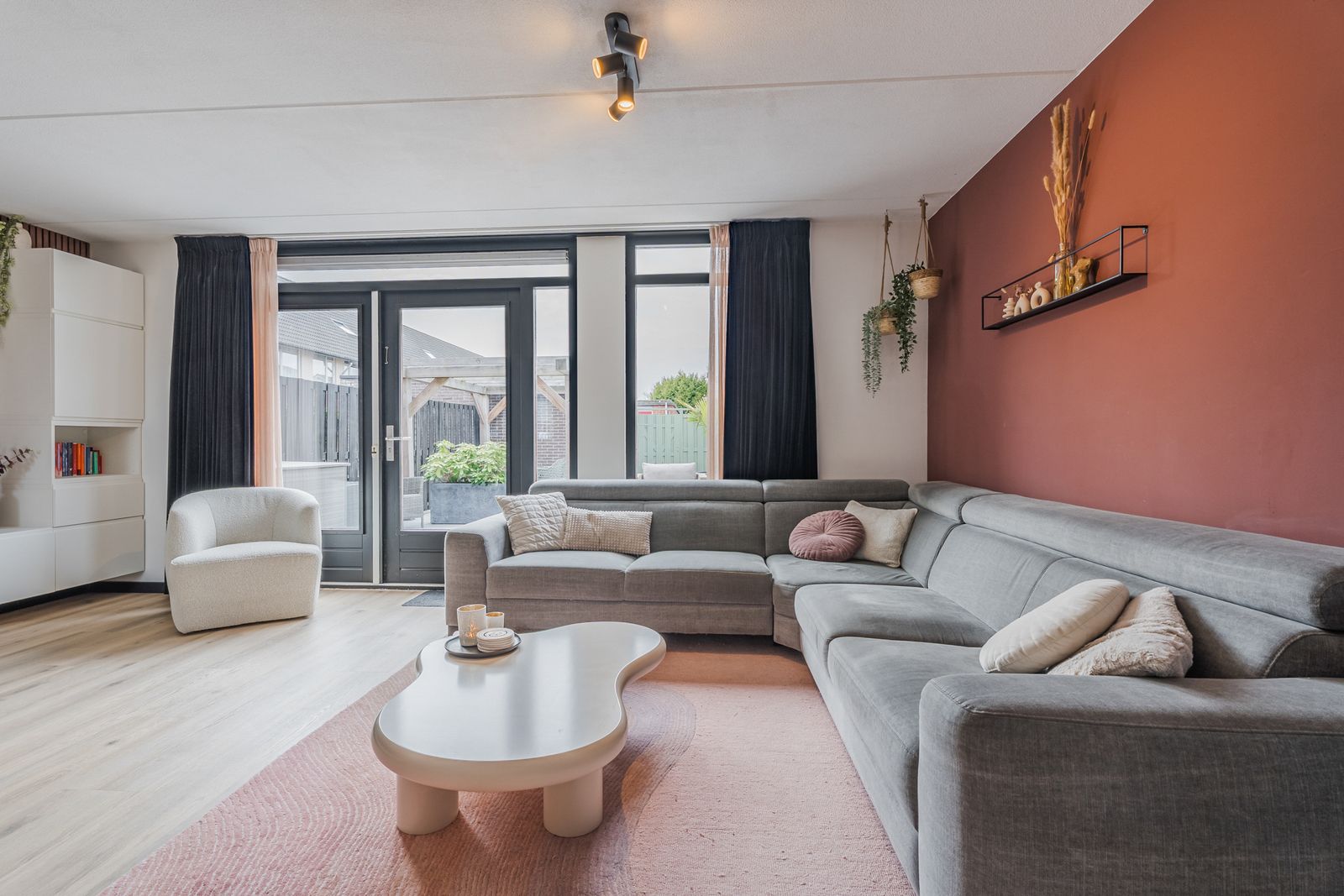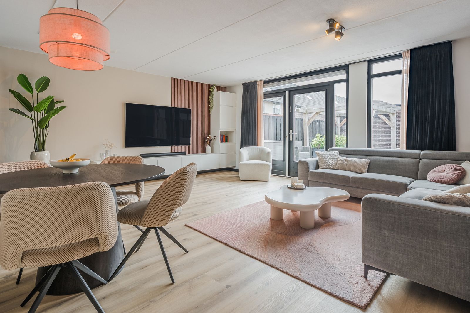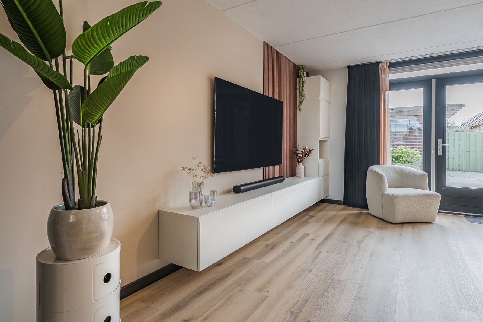 De woonkamer is voorzien van een moderne tv wand met wandmeubel, lattenwand en een 75 inch Samsung Neo QLED 8K televisie. Deze complete set is ter overname en kan bij een goed bod worden meegenomen in de verkoop.