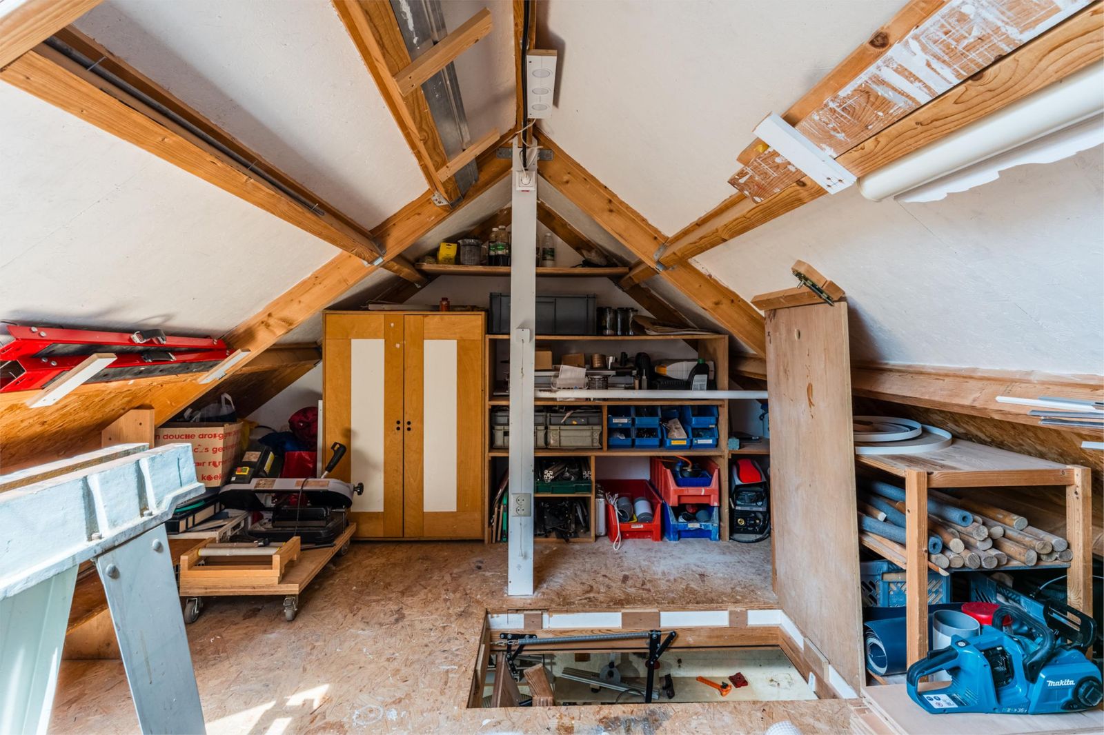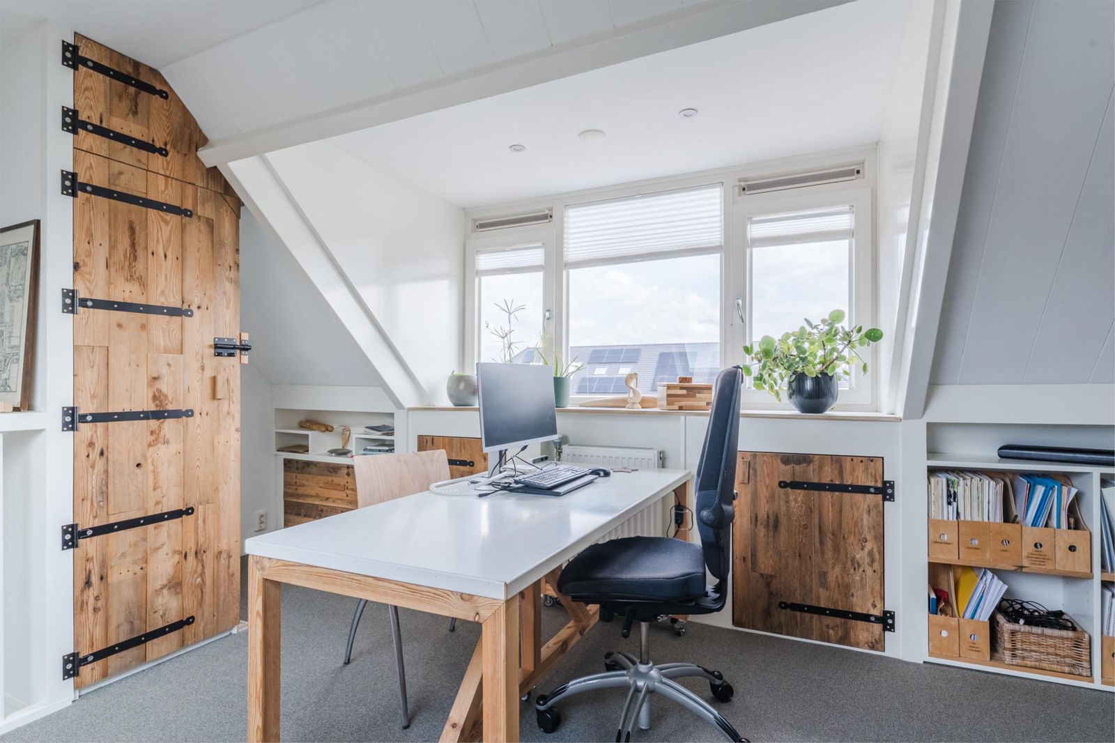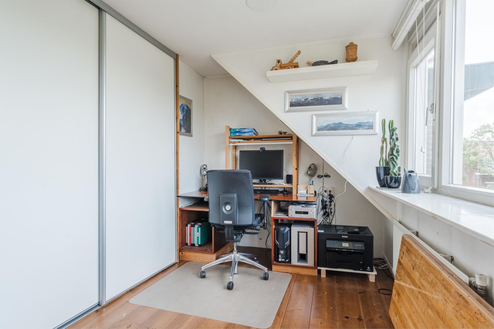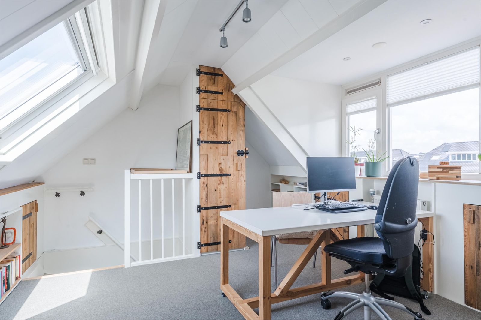 Deze zolderkamer is een open ruimte met vloerbedekking, een Velux-tuimelvenster met HR+-glas en van kunststof, en een dakkapel met HR+-glas en kunststof kozijnen. (Knieschot)kasten zorgen voor veel opbergruimte en er is een radiator. Deze kamer kan uitstekend als derde slaapkamer worden gebruikt.