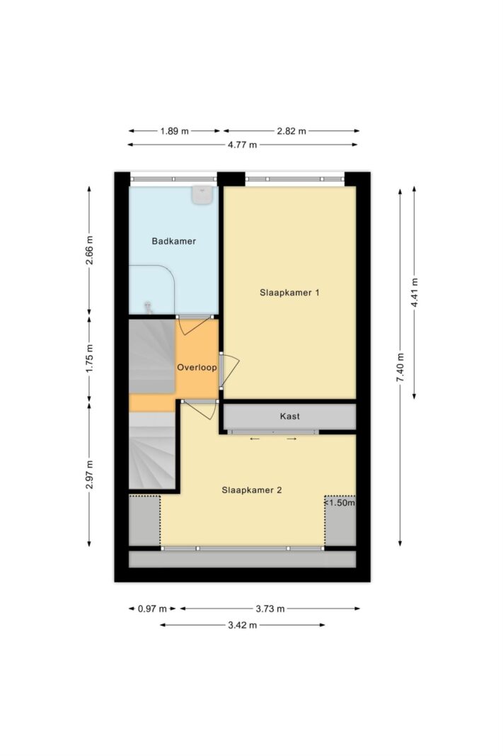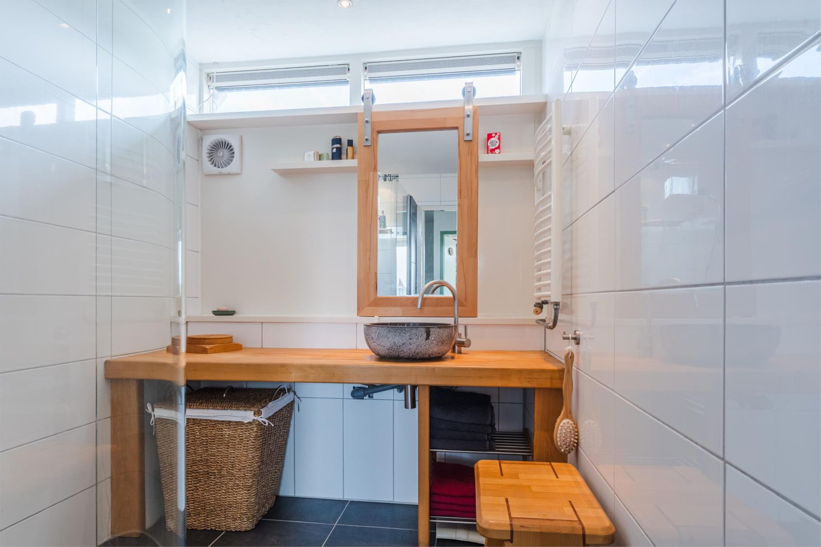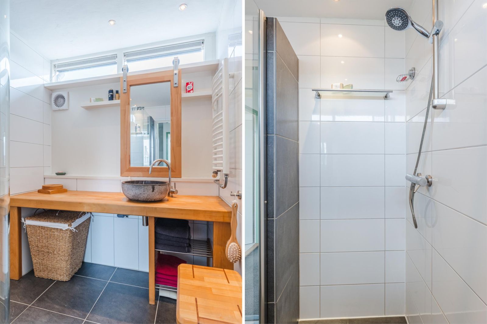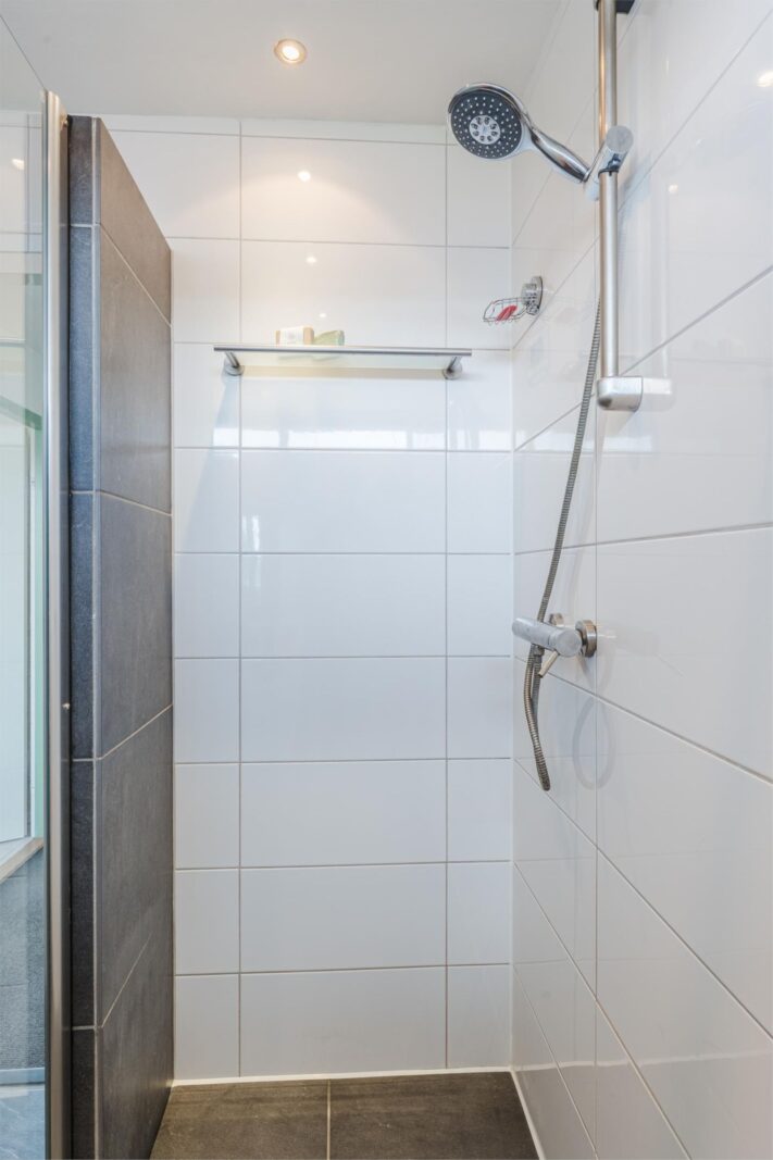 Vanaf de overloop - met een vaste trap naar de tweede verdieping - loop je de moderne, luxe badkamer in met inloopdouche, wastafelmeubel, natuurstenen waskom, radiator en mechanische ventilatie. Slaapkamer één heeft een grenenhouten vloer, een internetaansluiting en je kijkt uit op de achtertuin. Slaapkamer twee heeft ook een grenenhouten vloer, een inbouwkast, een dakkapel (HR+-glas en kunststof kozijnen) en een elektrisch bedienbare buiten-screen. De kamers zijn beide heerlijk licht dankzij de grote raampartijen.