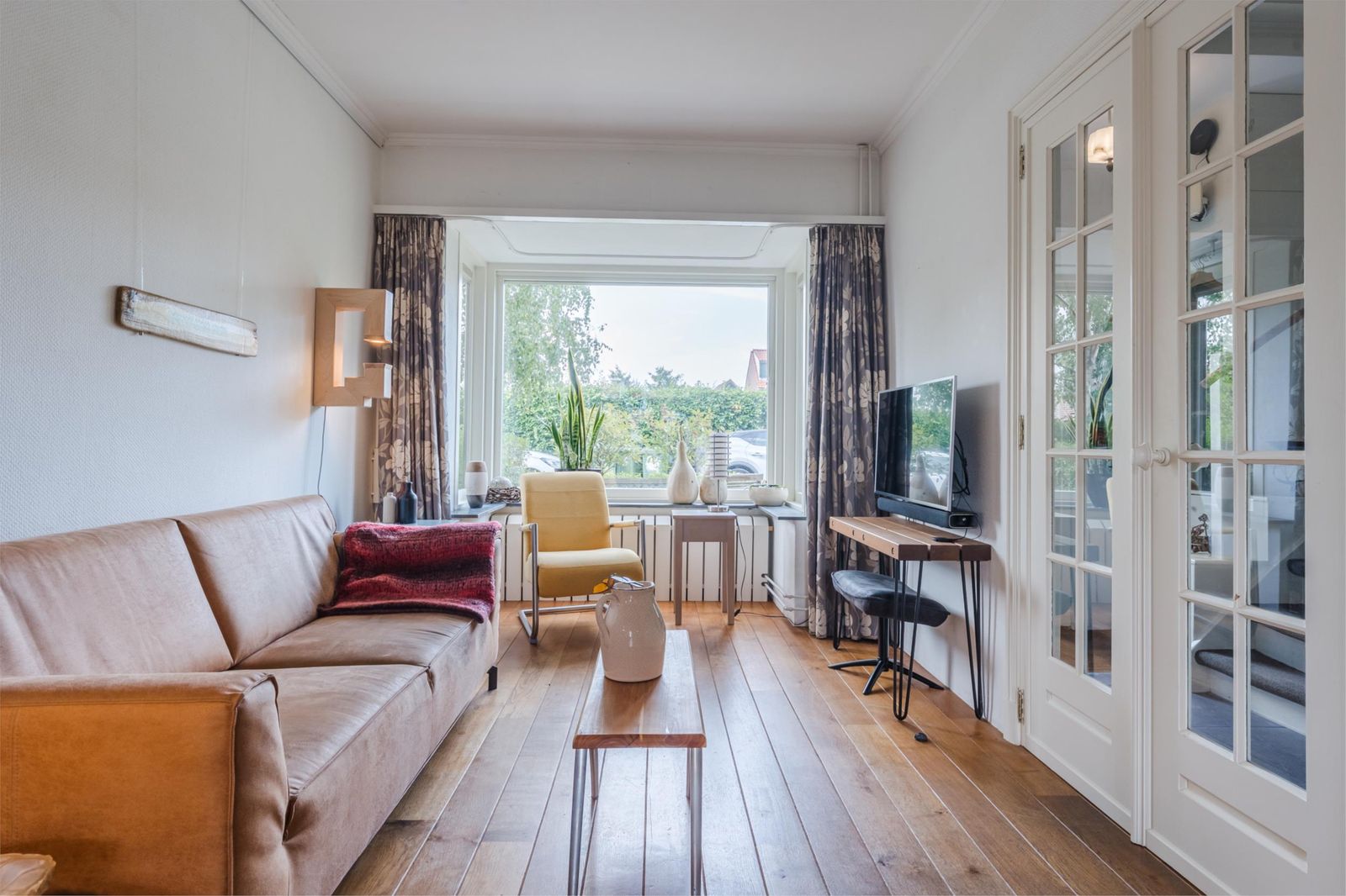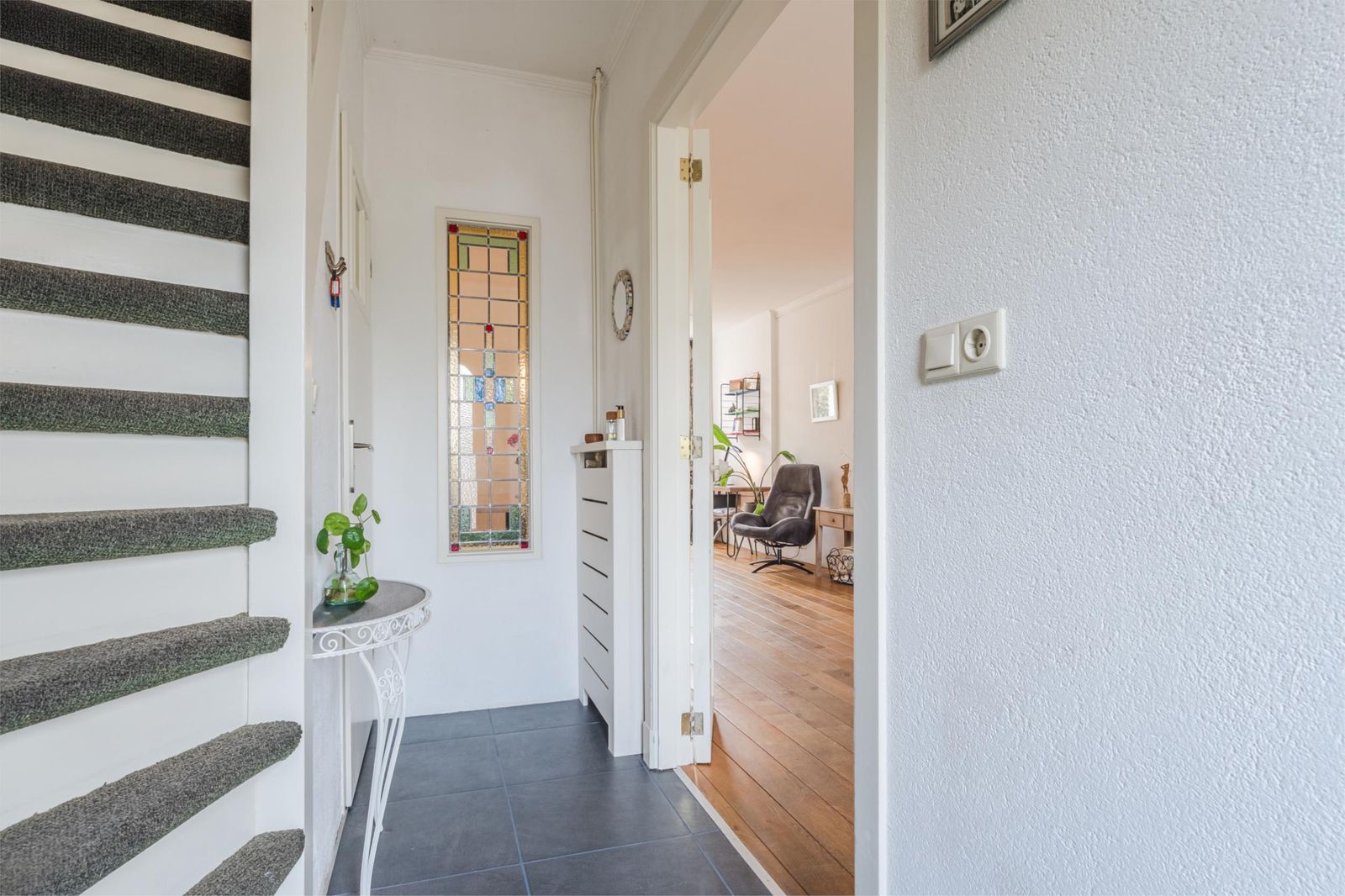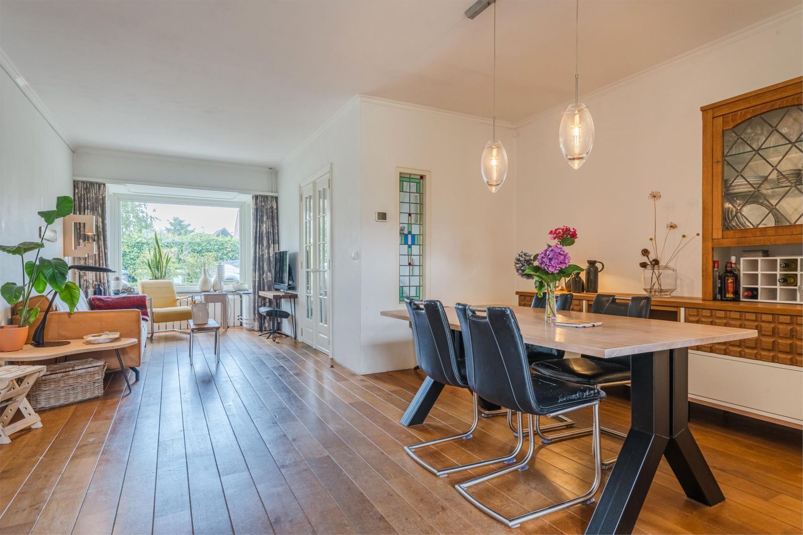 Via dubbele deuren kom je in de ruime en sfeervolle woonkamer, met eikenhouten vloer. De erker - met buitenscreen - én de doorkijkjes met eigentijds glas in lood naar de keuken en hal, zijn karakteristiek. De openslaande deuren naar de achtertuin geven je het gevoel de tuin naar binnen te halen.