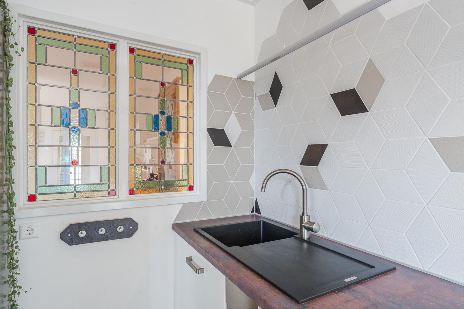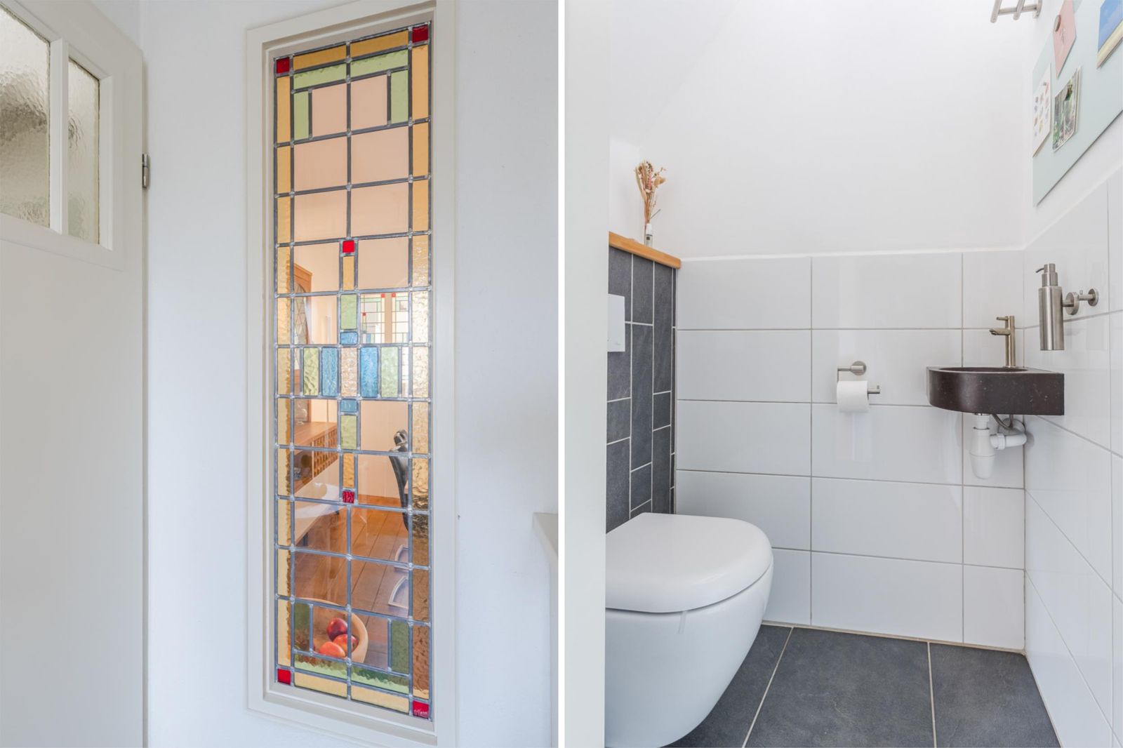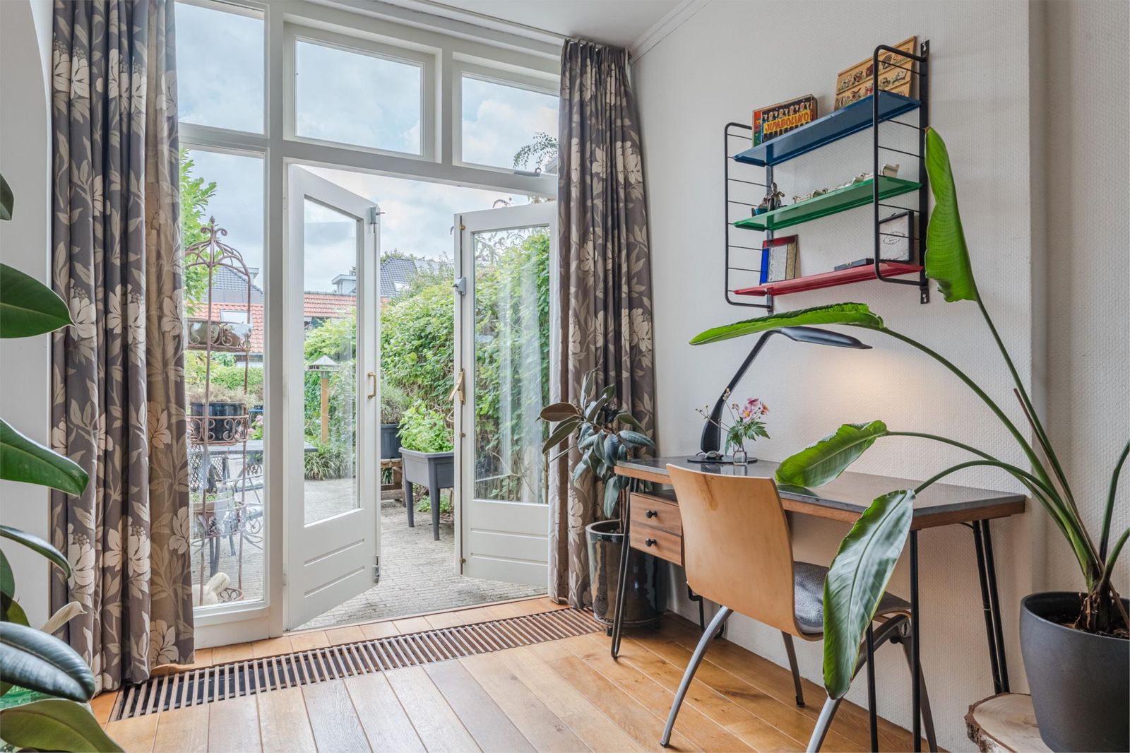 Via dubbele deuren kom je in de ruime en sfeervolle woonkamer, met eikenhouten vloer. De erker - met buitenscreen - én de doorkijkjes met eigentijds glas in lood naar de keuken en hal, zijn karakteristiek. De openslaande deuren naar de achtertuin geven je het gevoel de tuin naar binnen te halen.