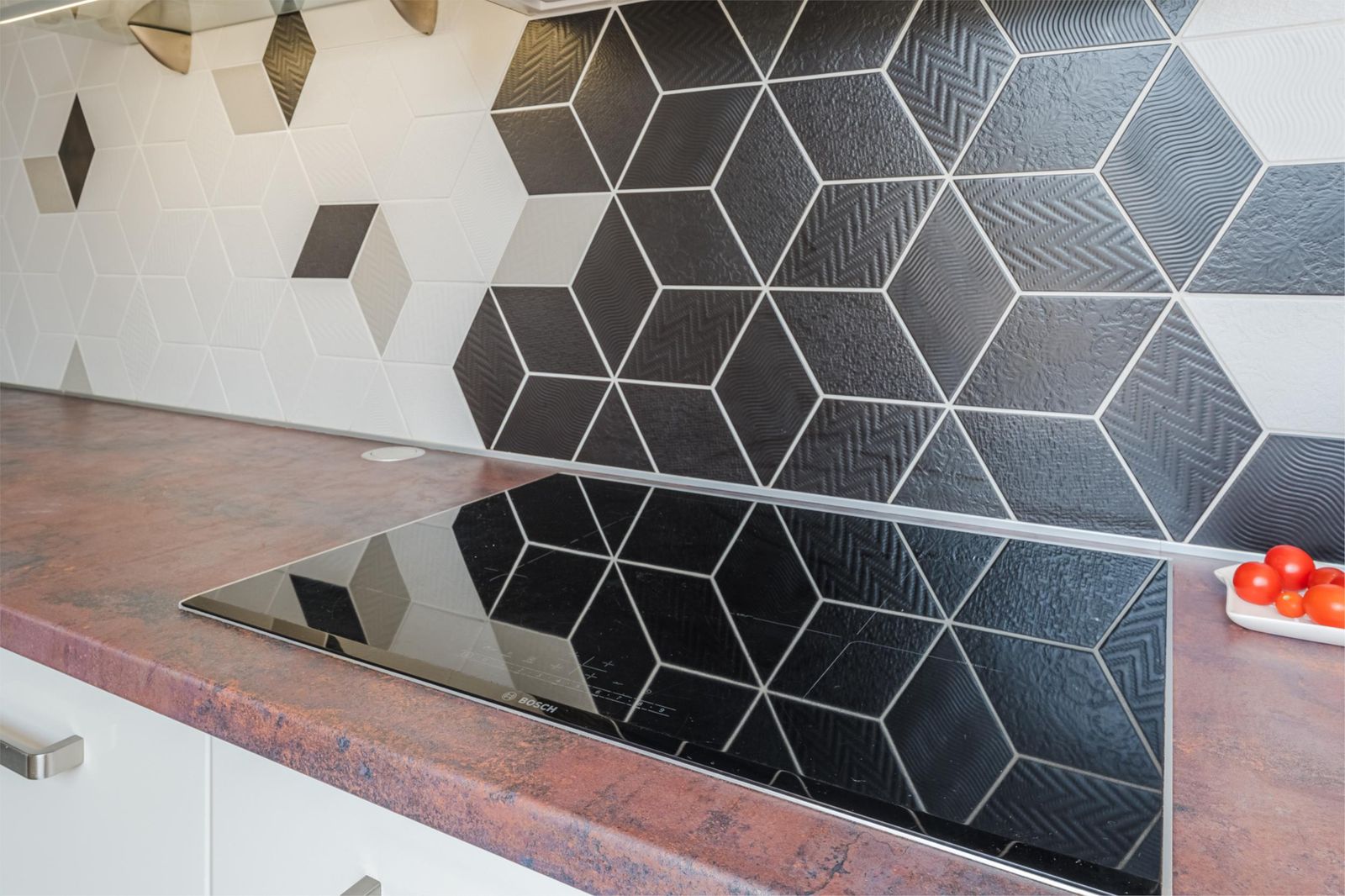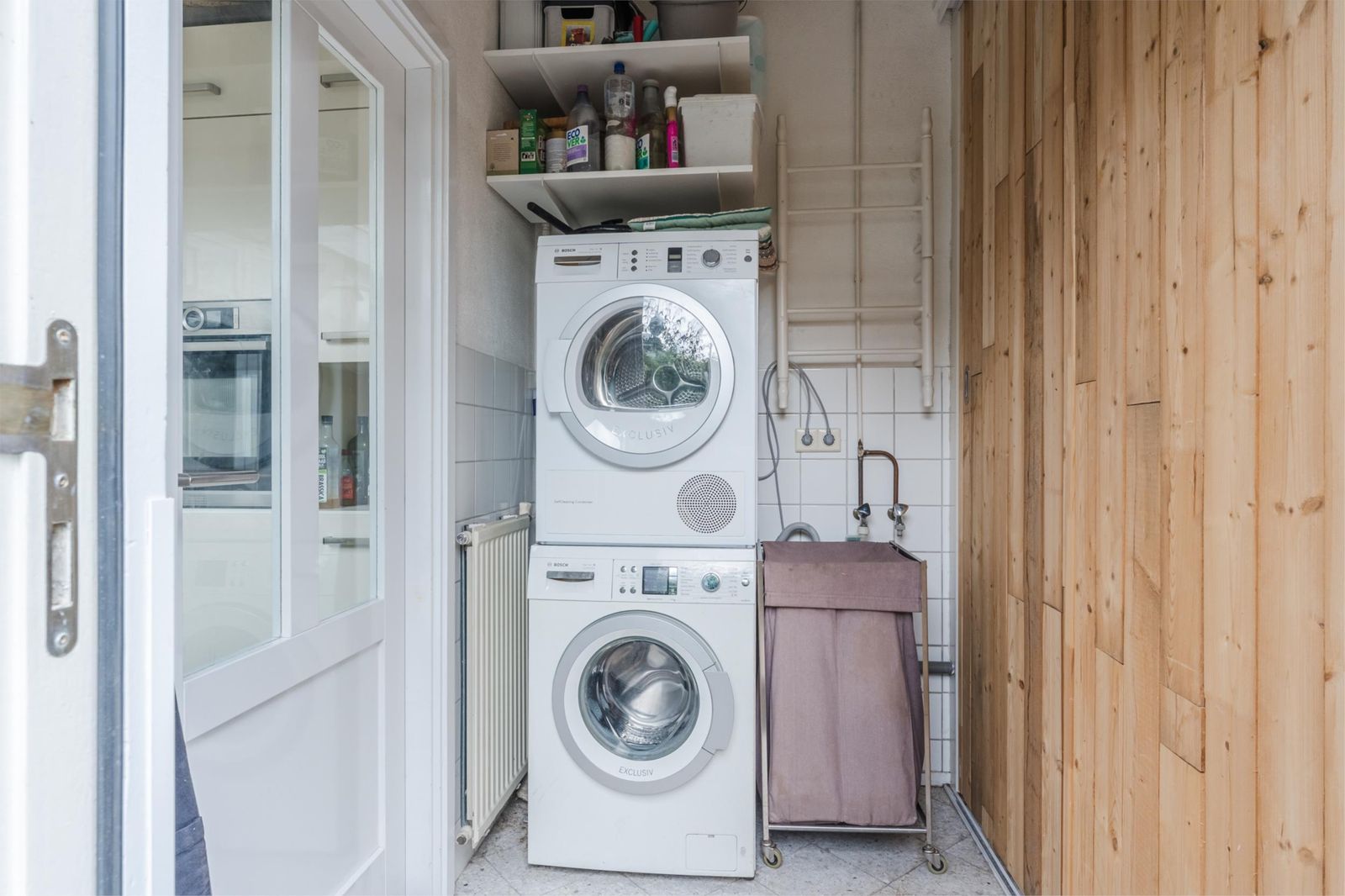 Via een doorgang kom je in de moderne en luxe keuken met inbouwapparatuur (inductiekookplaat, vaatwasser afzuigkap en oven-magnetroncombinatie). Door het doorkijkje blijf je verbonden met de woonkamer. De dichte bijkeuken heeft een wasmachine- en drogeraansluiting en net zoals de keuken voorzien van vloerverwarming. Hier is een grote inbouwkast met veel opbergruimte en een opstelplaats voor de HR-combiketel. Hier is ook de toegang tot de tuin. Het dak van de (bij)keuken is geïsoleerd.