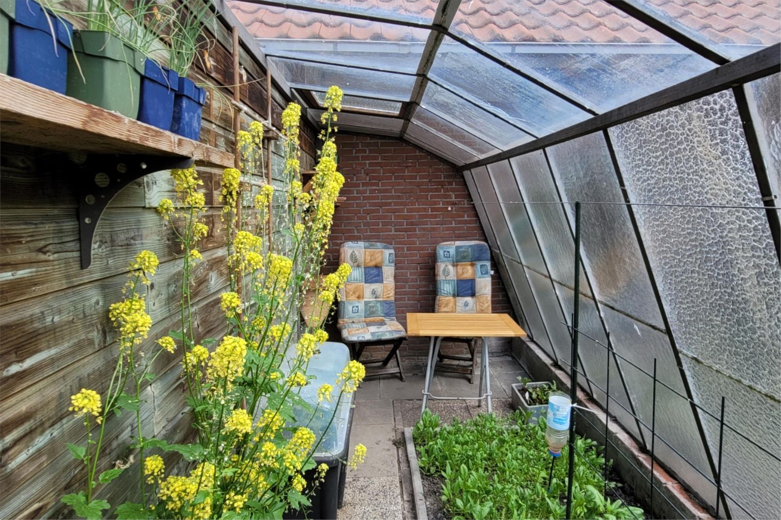 In de diepe ruime tuin ( 27mx 4,65m ) kan je gedurende de dag de zon of de schaduw op te zoeken. Er is een kruidentuin en er staan fruitbomen en door de diversiteit bezoeken verschillende soorten vogels de tuin om voedsel te zoeken en om te broeden. Er staat een originele stalen druiven-muurkas, die je in het voor- en najaar kunt gebruiken als serre, en een vrijstaande houten berging. In de vrijstaande stenen schuur is elektra aanwezig en een deur naar de achterom. De schuur heeft bovendien een zolderverdieping op stahoogte, ook met elektra en een tuimelvenster, en is te bereiken met een vlizotrap.