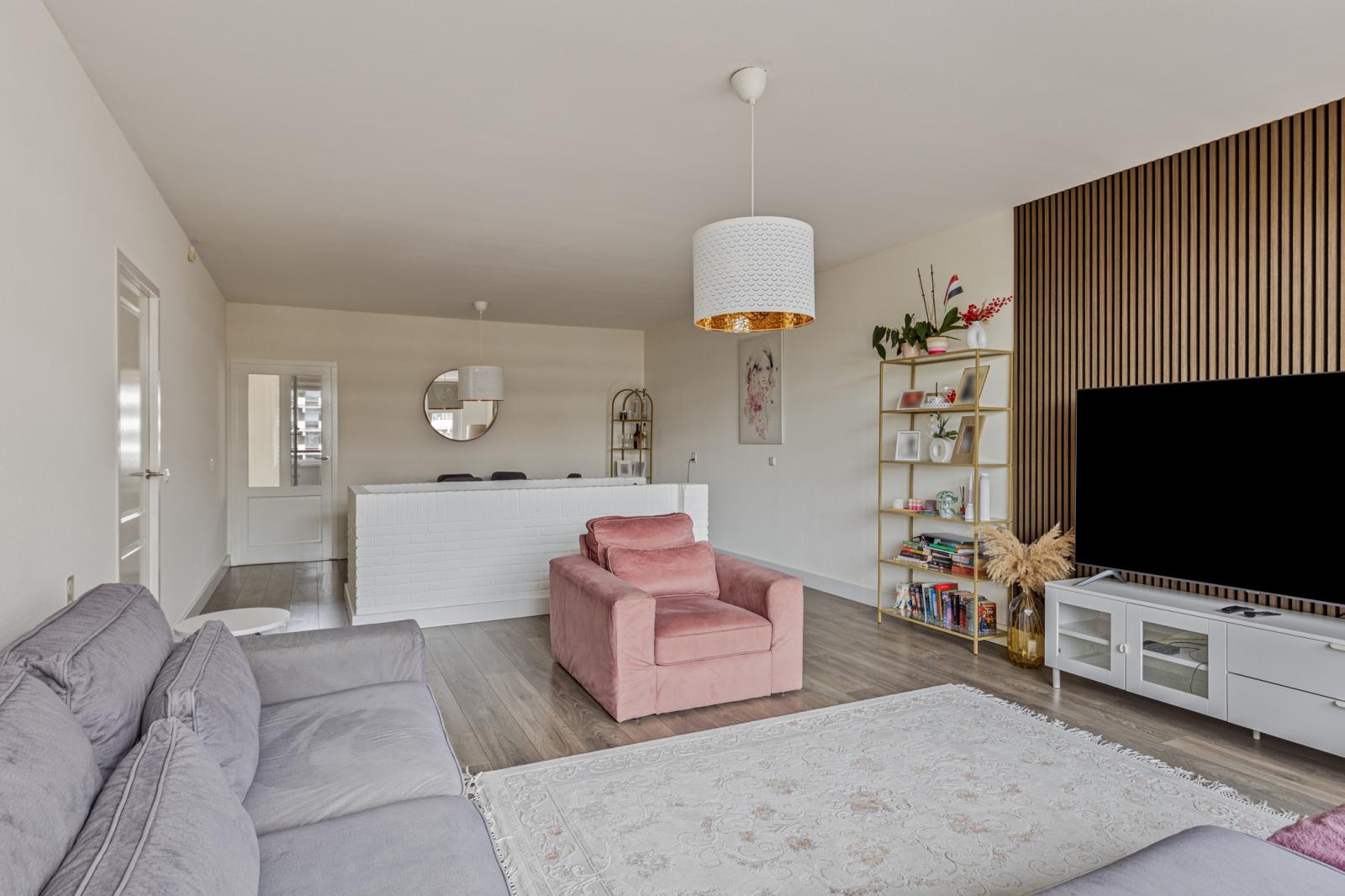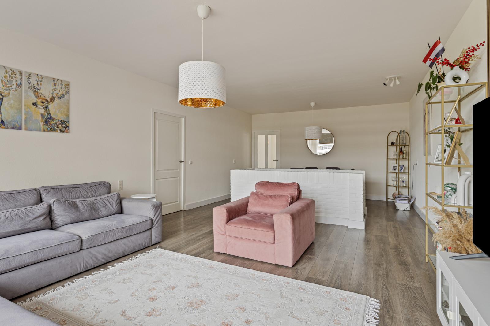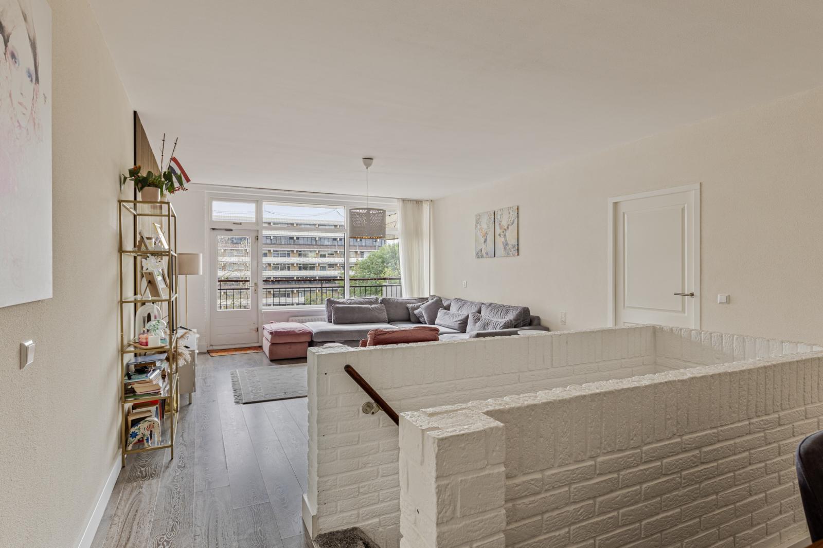 De bovenliggende verdieping vormt het leefgedeelte van de woning. De woonkamer is royaal opgezet en wordt gekenmerkt door grote raampartijen, wat zorgt voor veel daglicht. Vanuit hier bereikt u het balkon op het zuidwesten, ideaal voor de middag- en avondzon.