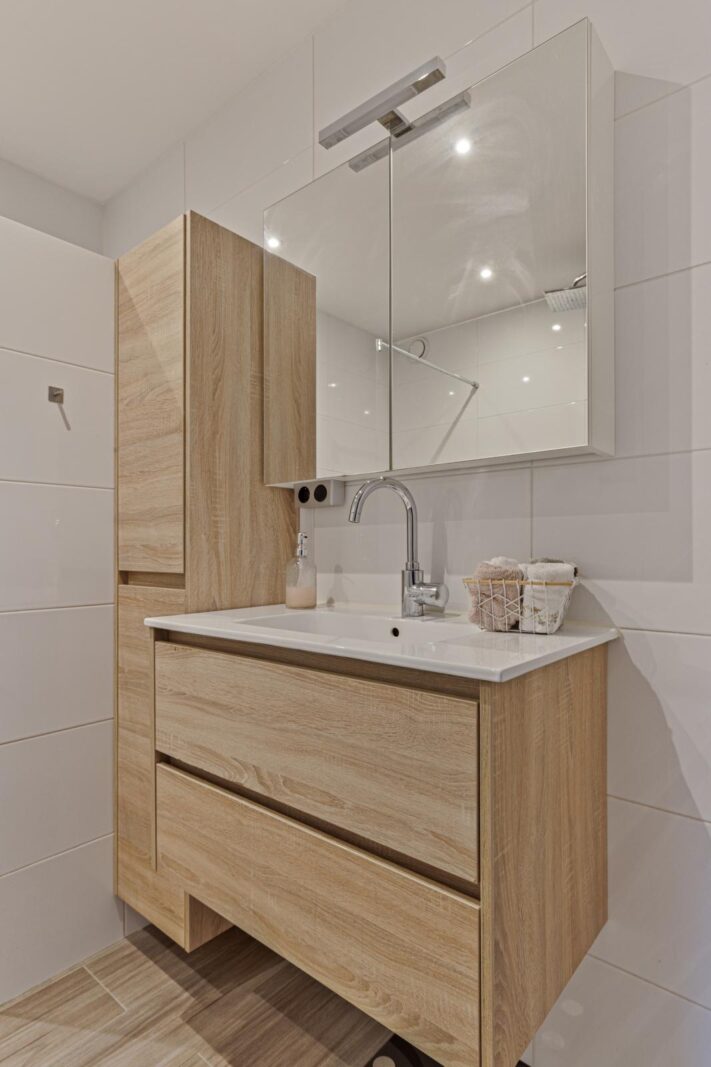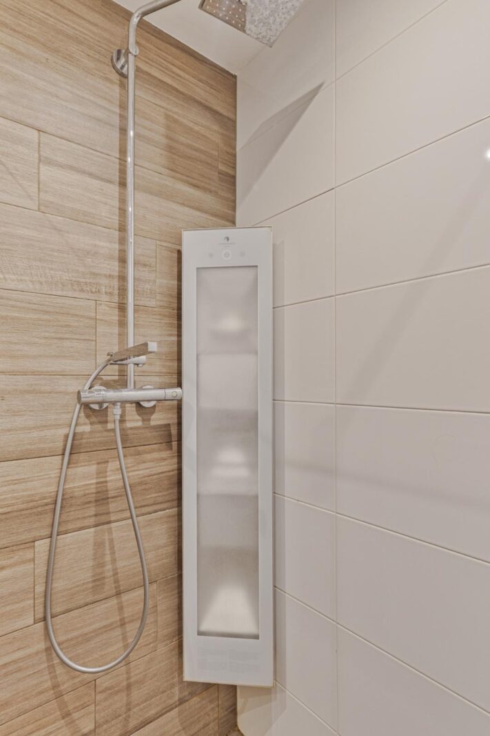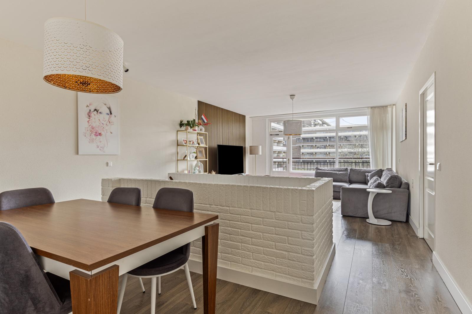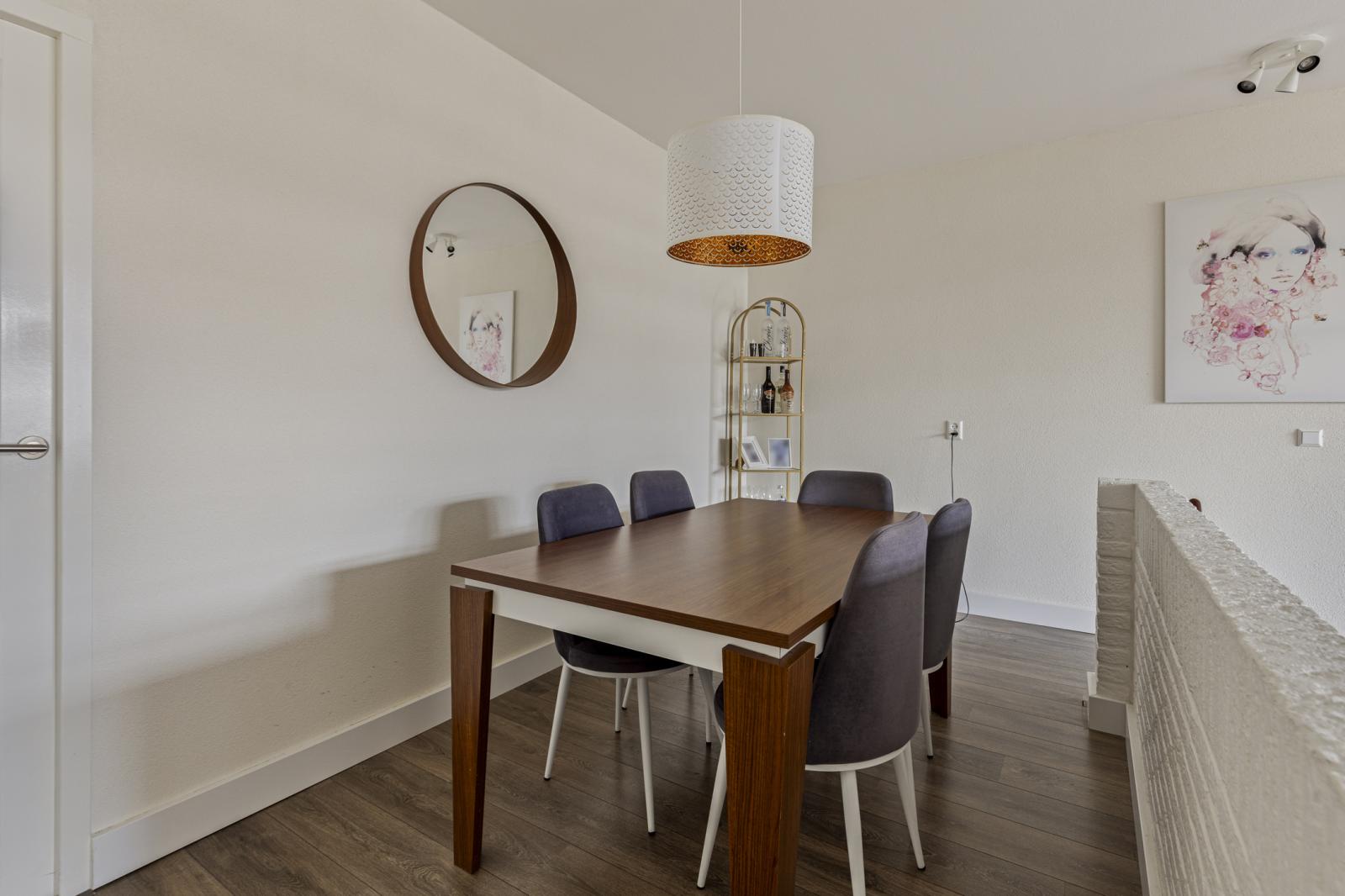 De bovenliggende verdieping vormt het leefgedeelte van de woning. De woonkamer is royaal opgezet en wordt gekenmerkt door grote raampartijen, wat zorgt voor veel daglicht. Vanuit hier bereikt u het balkon op het zuidwesten, ideaal voor de middag- en avondzon.