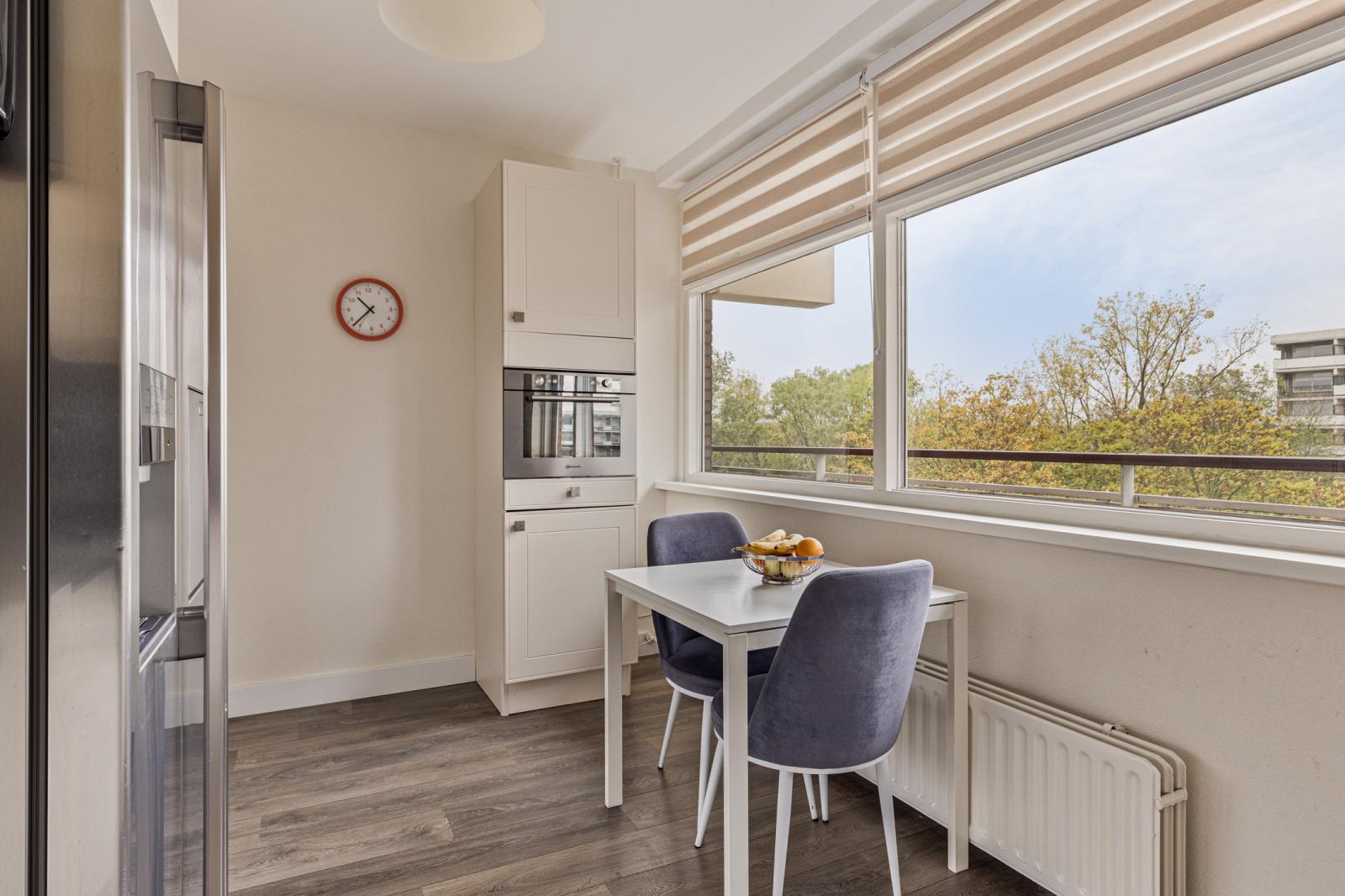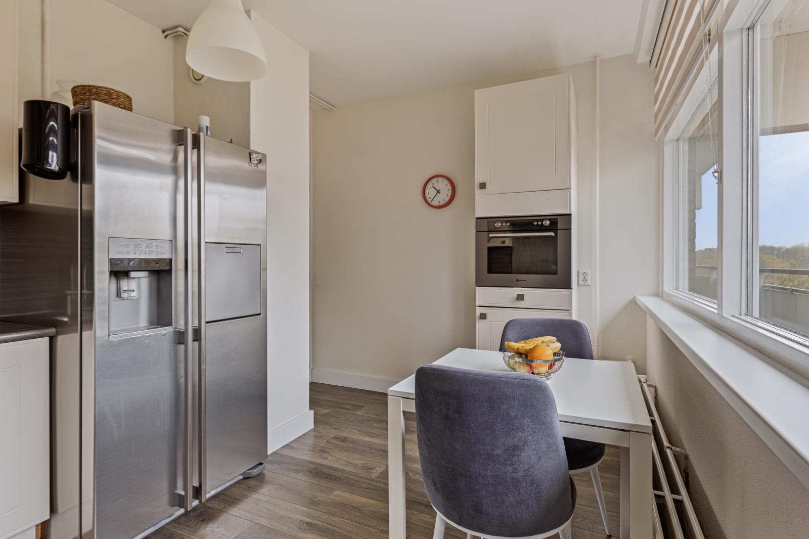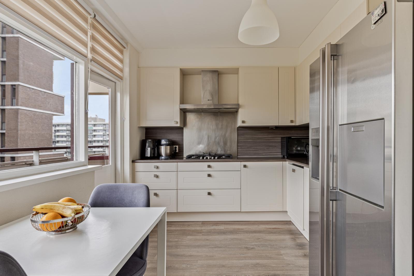 De keuken staat in open verbinding met de woonkamer en is praktisch ingericht met diverse inbouwapparatuur. Het tweede balkon, gelegen op het noordoosten, is via de keuken bereikbaar en biedt een prettige plek voor de ochtendzon.