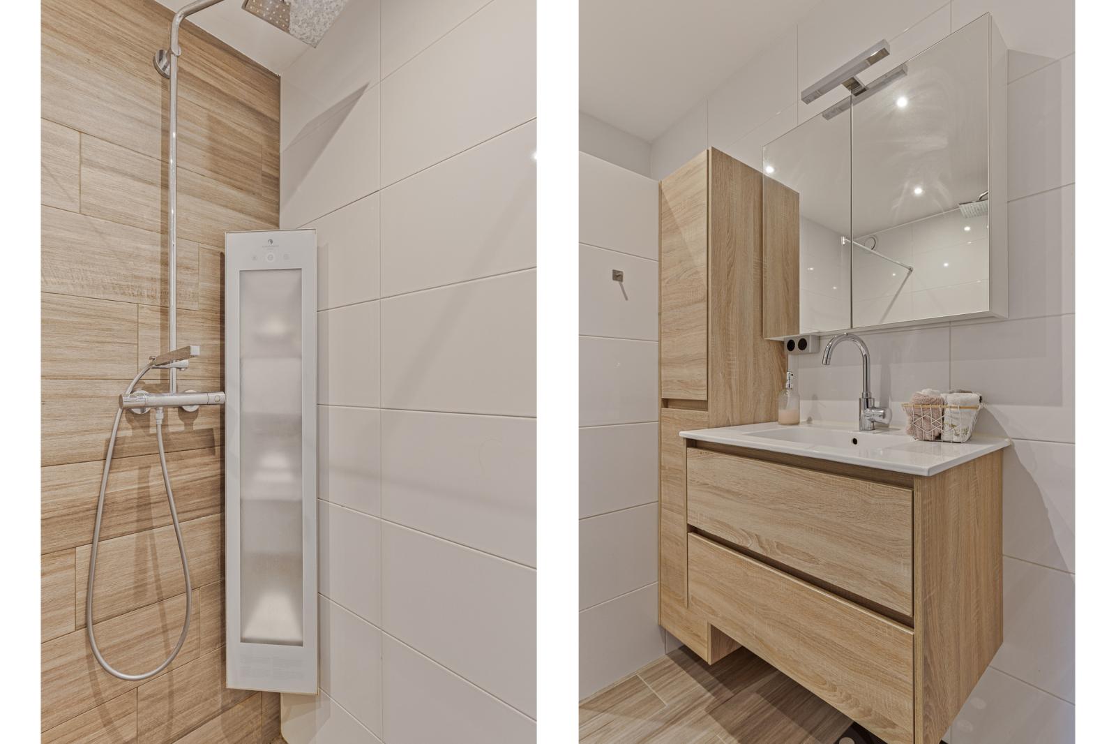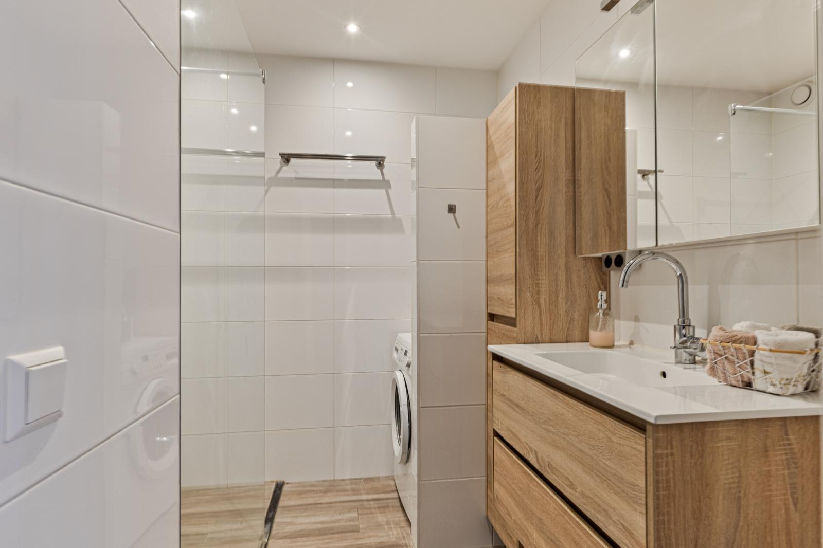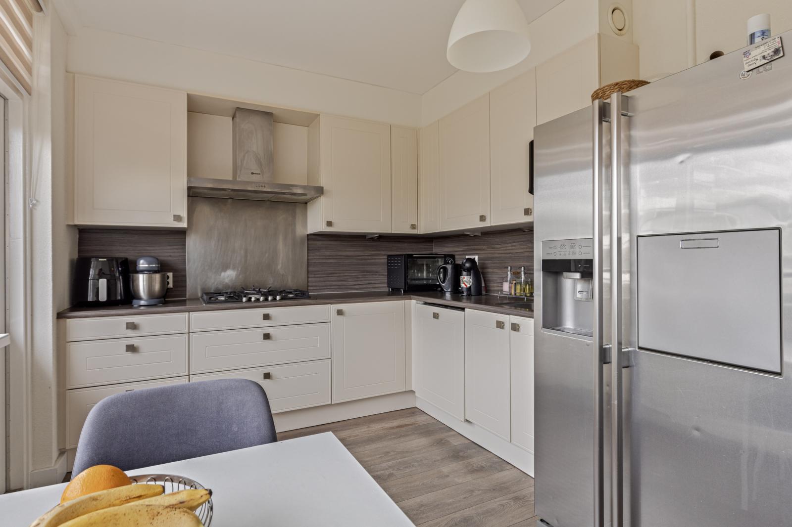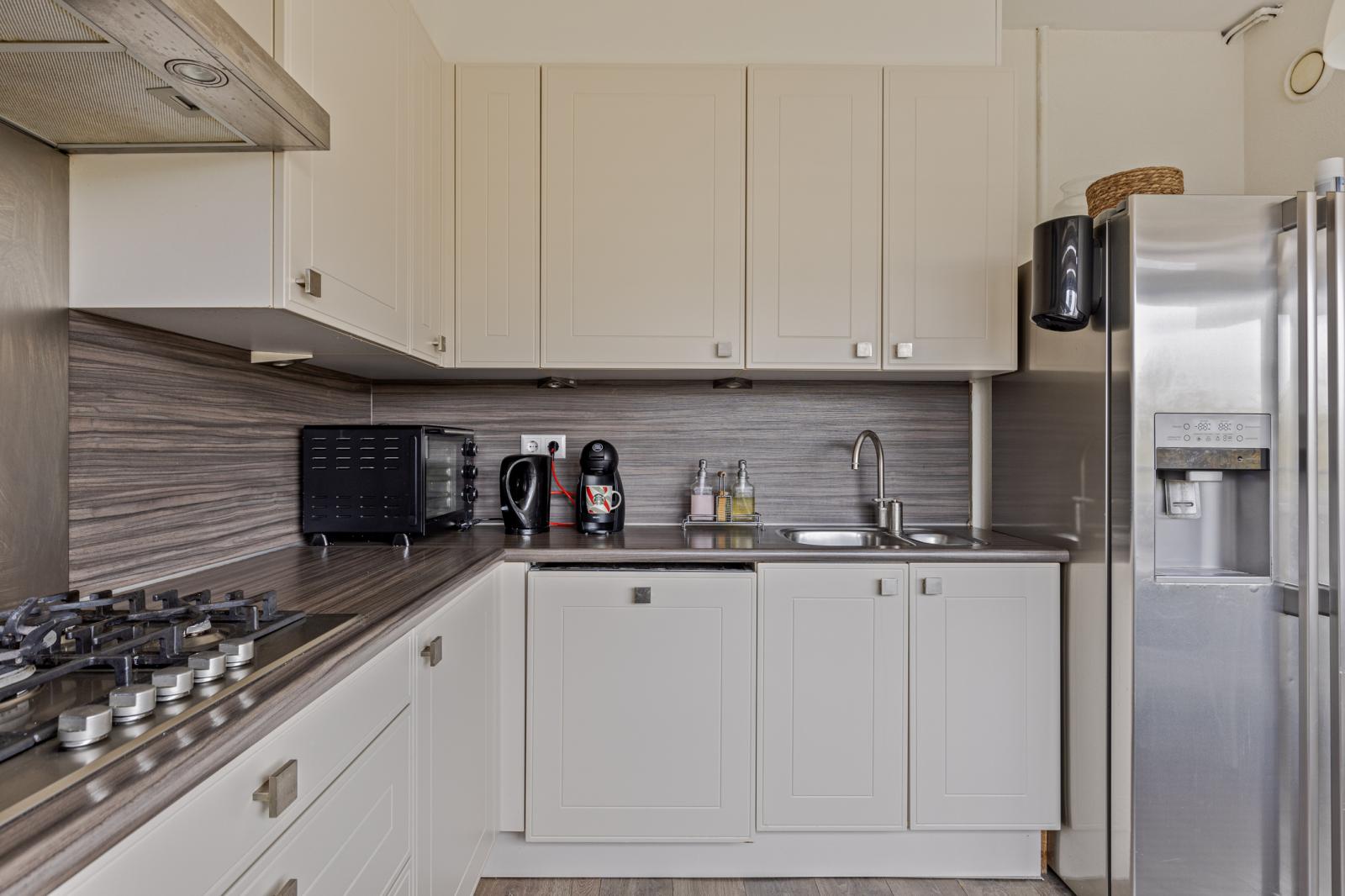 De keuken staat in open verbinding met de woonkamer en is praktisch ingericht met diverse inbouwapparatuur. Het tweede balkon, gelegen op het noordoosten, is via de keuken bereikbaar en biedt een prettige plek voor de ochtendzon.