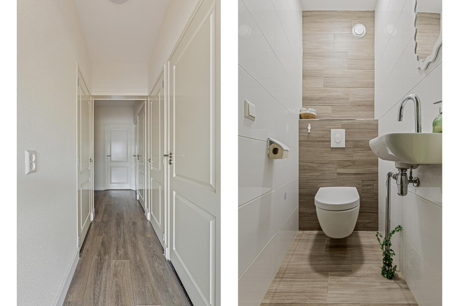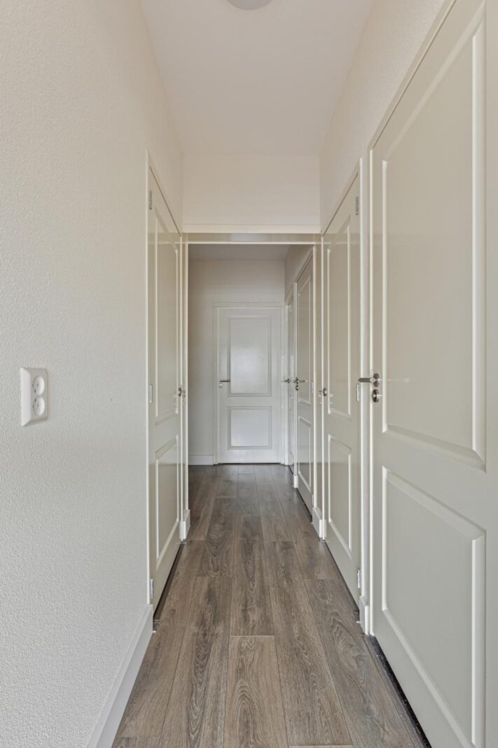De woning is bereikbaar via de 5e verdieping, waar zich de privé-entree bevindt. Hier is ruimte voor een garderobe en toegang tot de interne trap richting de woonlaag.