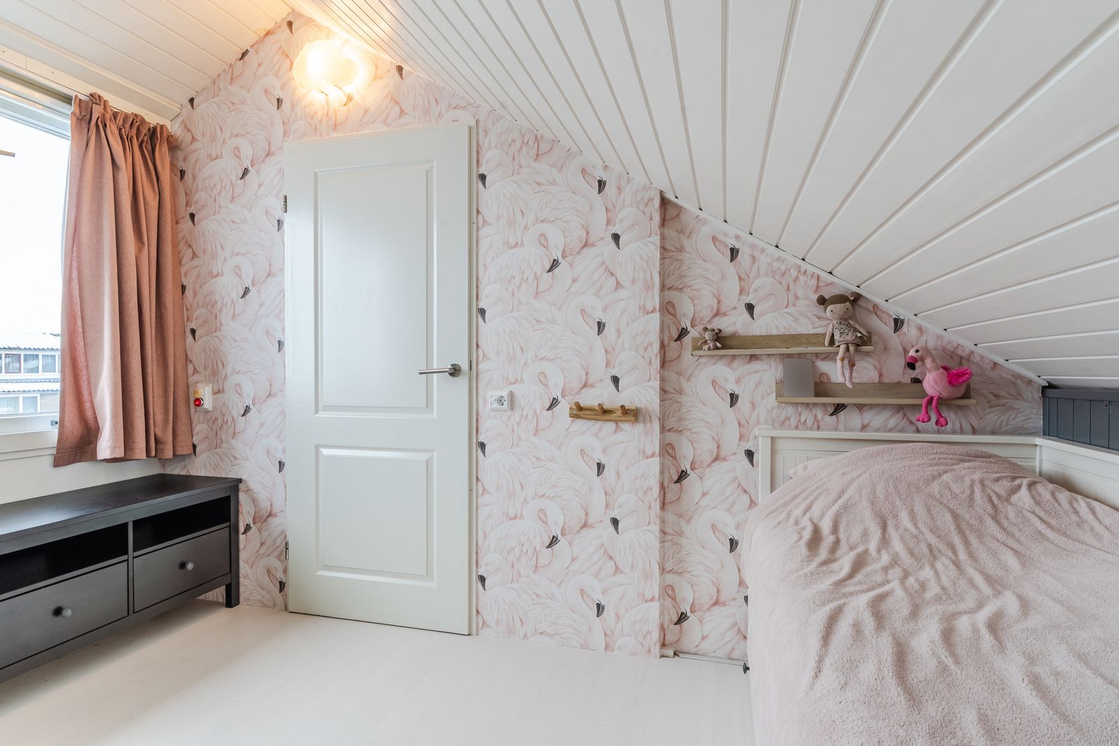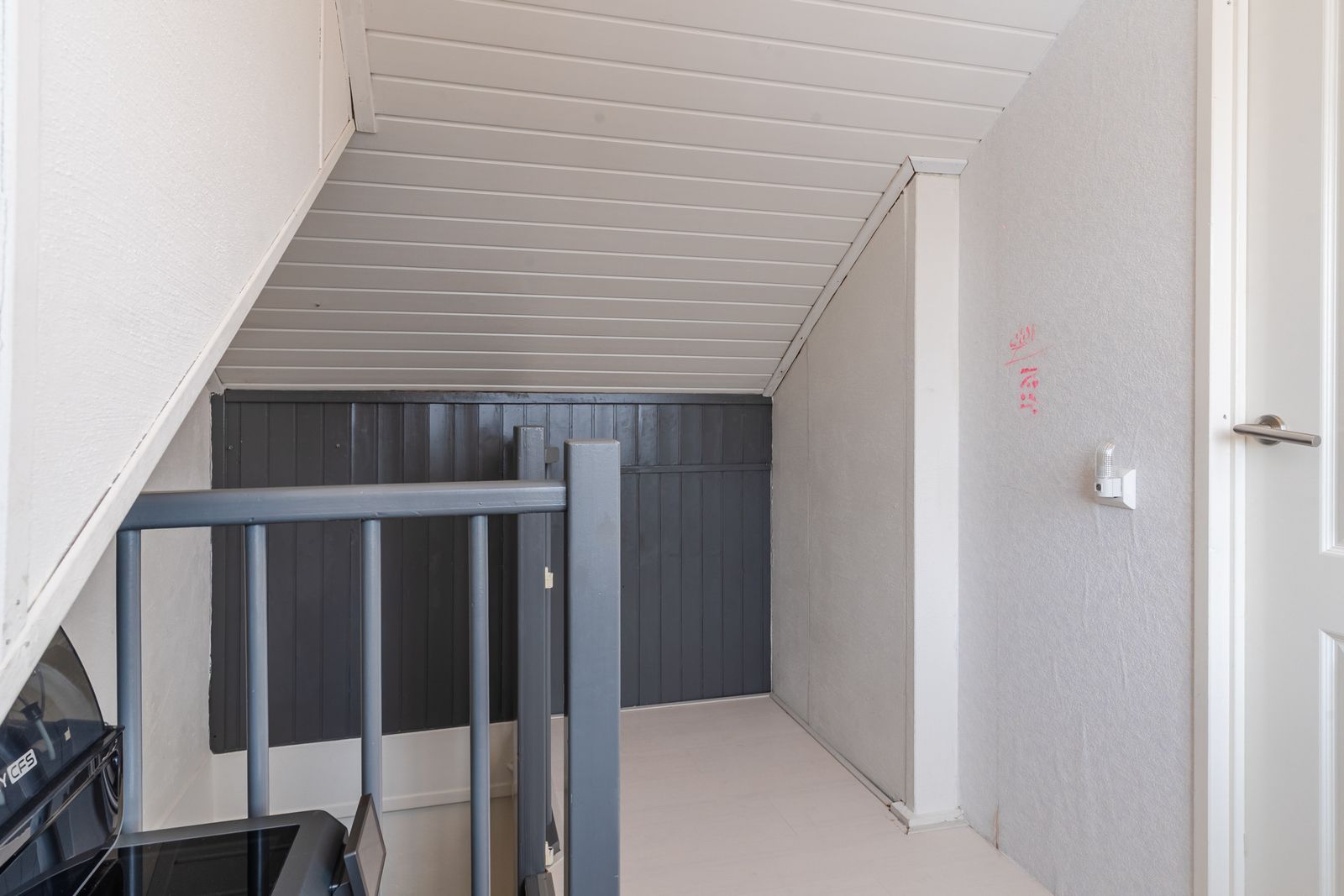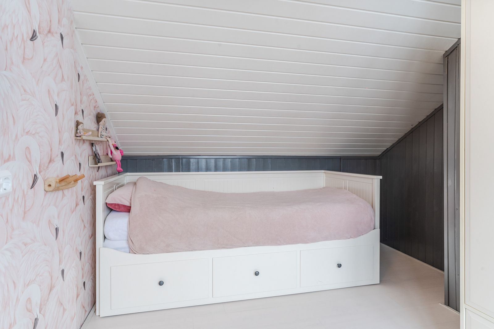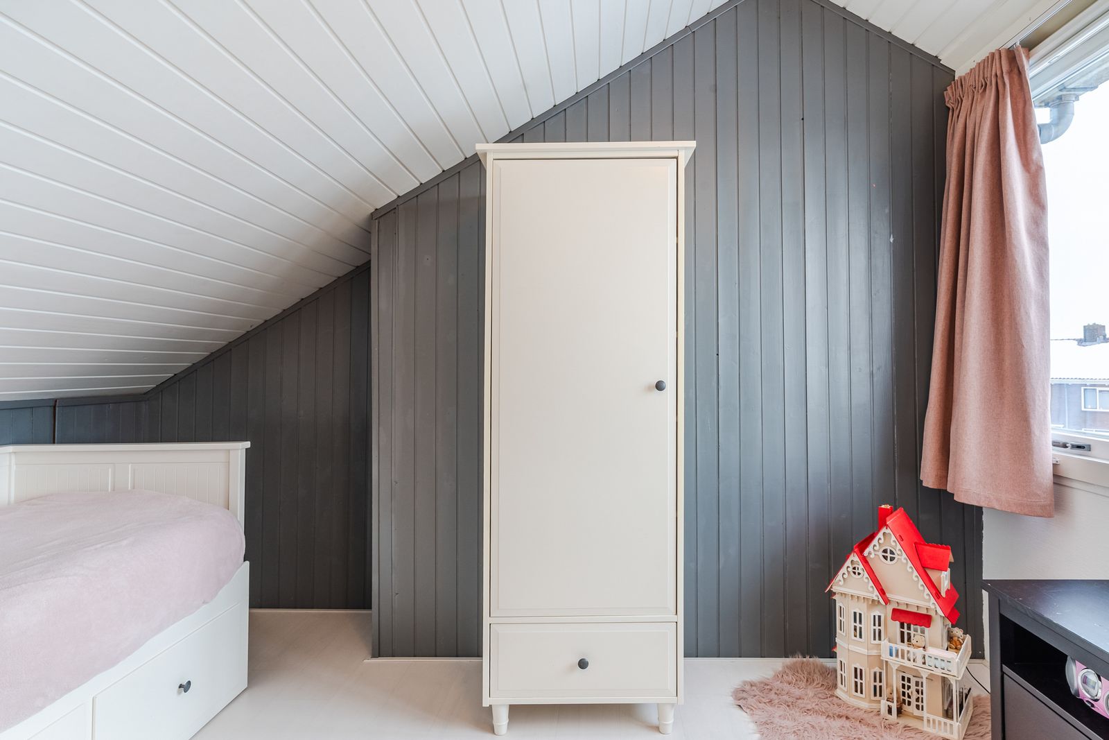 Een tweede vaste trap brengt ons naar de bovenverdieping waar ruimte is voor een kantoor met ruim uitzicht vanuit de dakkapel over de huizen. Op deze verdieping bevindt zich nog een mooie ruime slaapkamer. Achter de schotten, over de hele linkerkant van de zolder, is veel opbergruimte. De CV zit ook netjes verwerkt achter een schot op de slaapkamer.