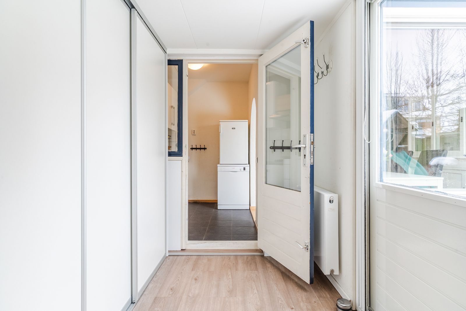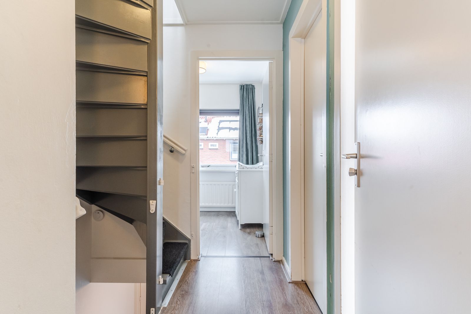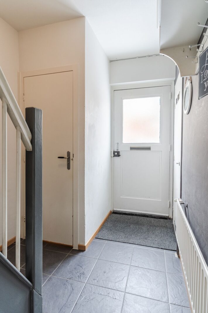 Via de entree komen we in de hal met een doorgang naar de woonkamer. In de hal bevinden zich het toilet, de meterkast en de trapopgang naar de eerste verdieping. De kelder die onder de trap zit, deze geeft veel opbergruimte.