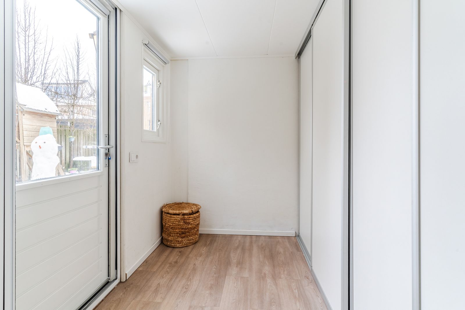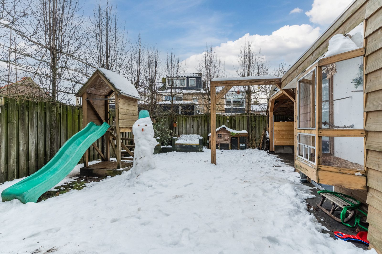 Als we naar buiten lopen komen we in een overzichtelijke tuin. Deze tuin is kindvriendelijk en voorzien van een schommel, houten speelhuis met glijbaan en zandbak, klaar voor uren speelplezier! Er zijn houten bankjes tussen de plantenvakken om te genieten van de bloemen, zon en spelende kinderen. De leibomen zorgen ervoor dat het echt een groene tuin is en zorgen voor veel privacy. Er is ook een mogelijkheid om dieren te houden wat een leuke bijkomstigheid is zowel voor kinderen als volwassenen!