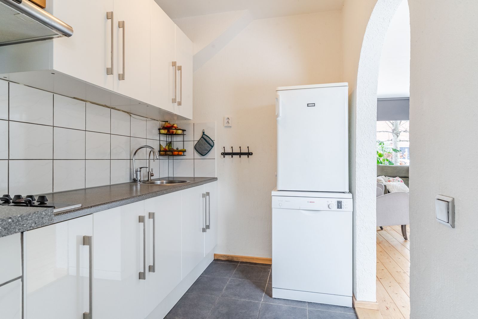 Bij de keukendeur stopt het niet, we stappen zo de aanbouw in waarbij veel extra ruimte is gecreëerd voor onder andere de oven, vriezer, wasmachine en droger, uit het oog onttrokken door de zeer ruime kast.