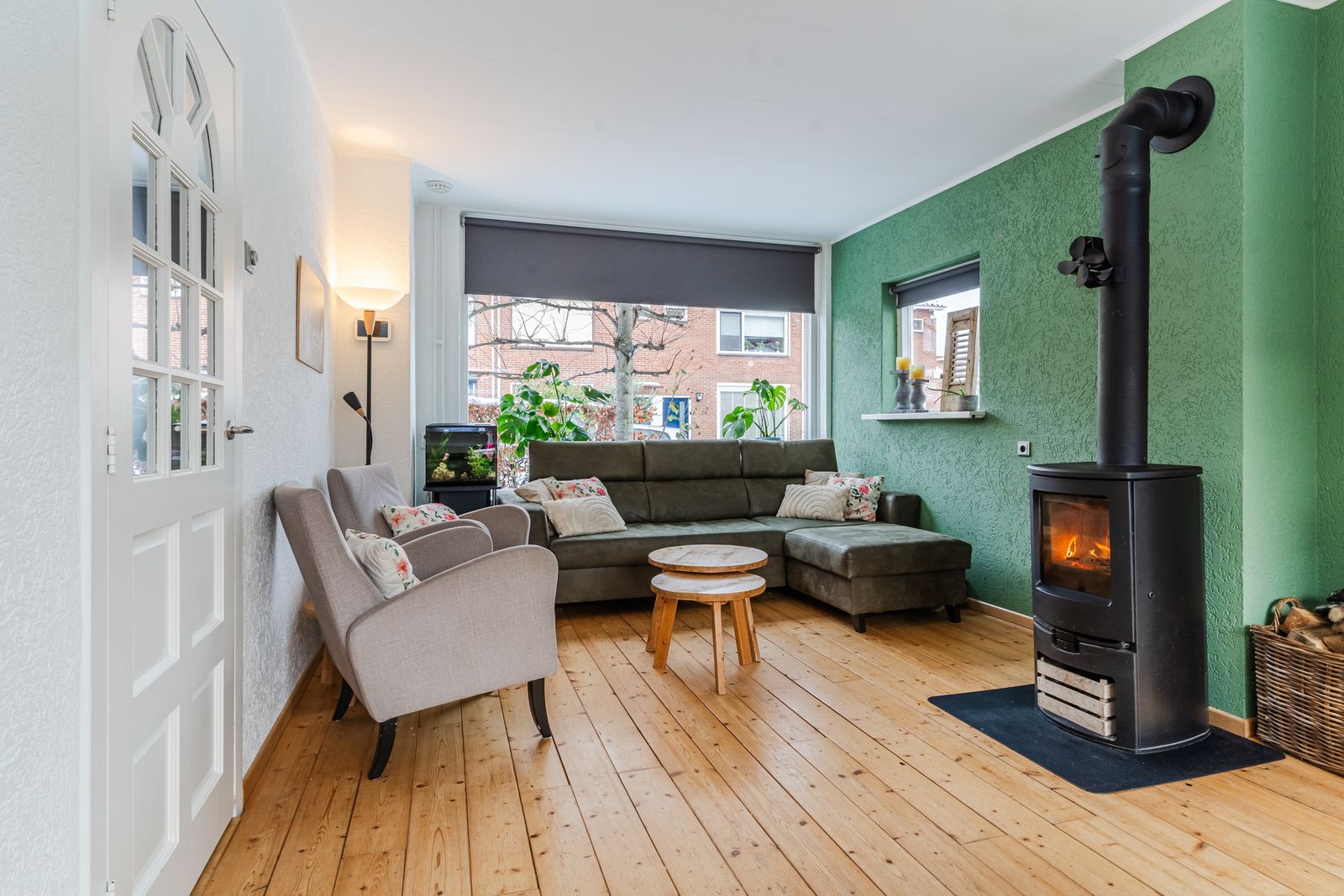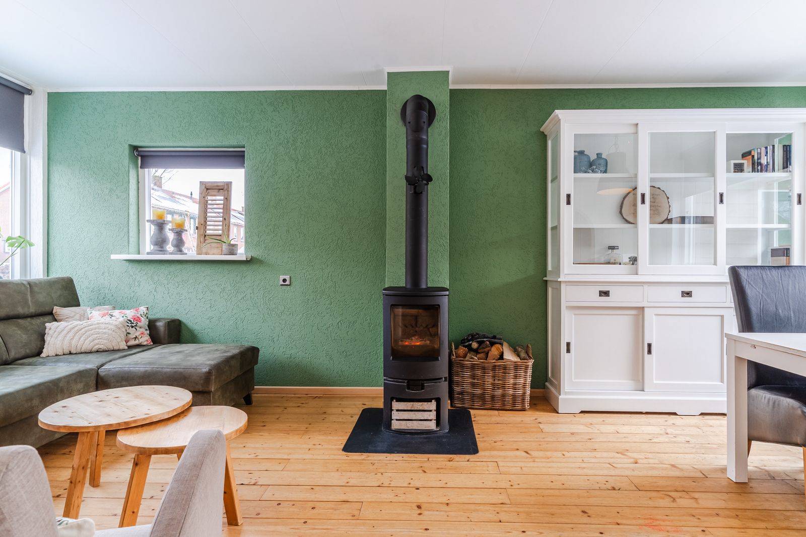 Een blikvanger die direct opvalt als je de woonkamer binnenkomt is de houtkachel die zorgt voor sfeer en heerlijke warmte. De doorzon woonkamer is licht door de grote ramen aan beide kanten.