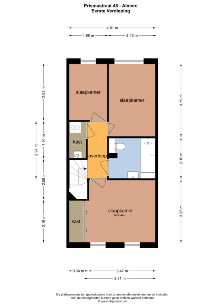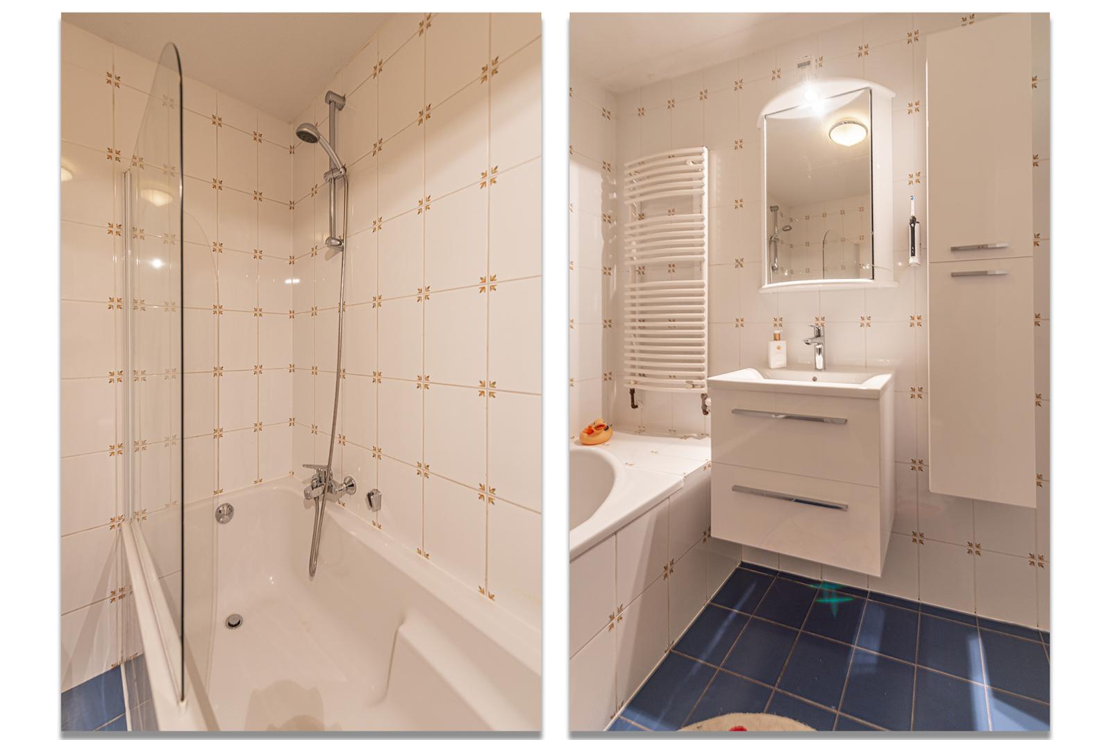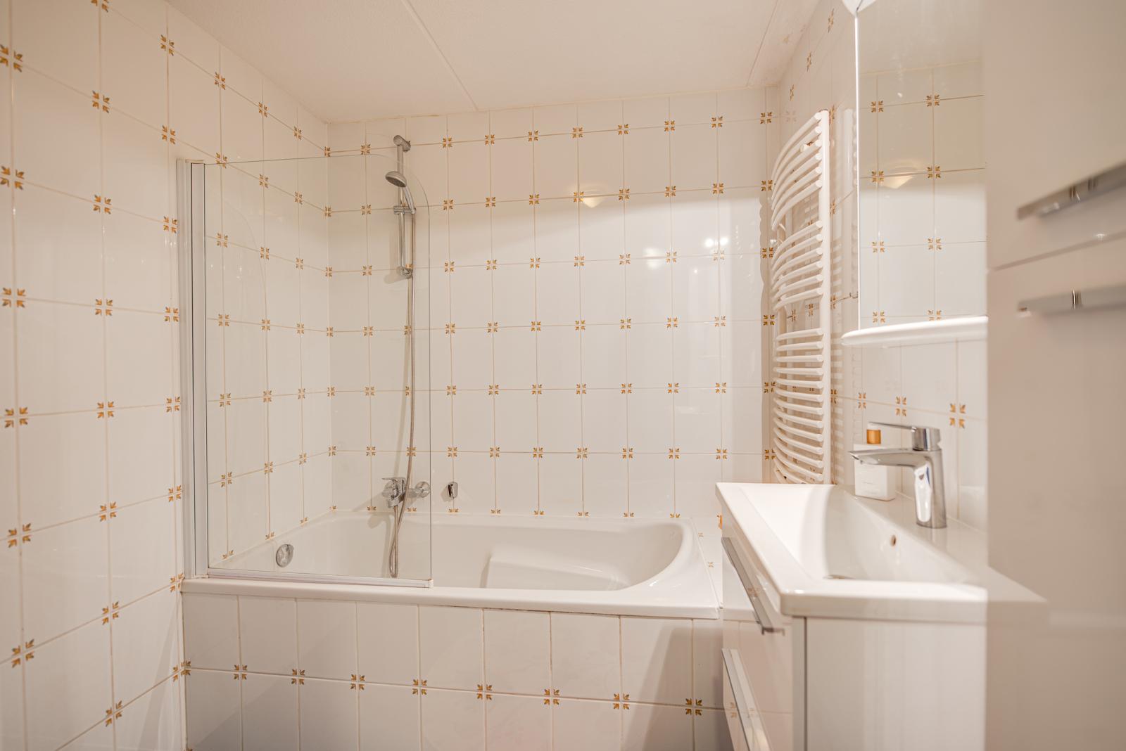 Tweede etage: Overloop, drie uitstekend bemeten slaapkamers, badkamer met ligbad, douche en tweede toilet, bergkast met CV-installatie.