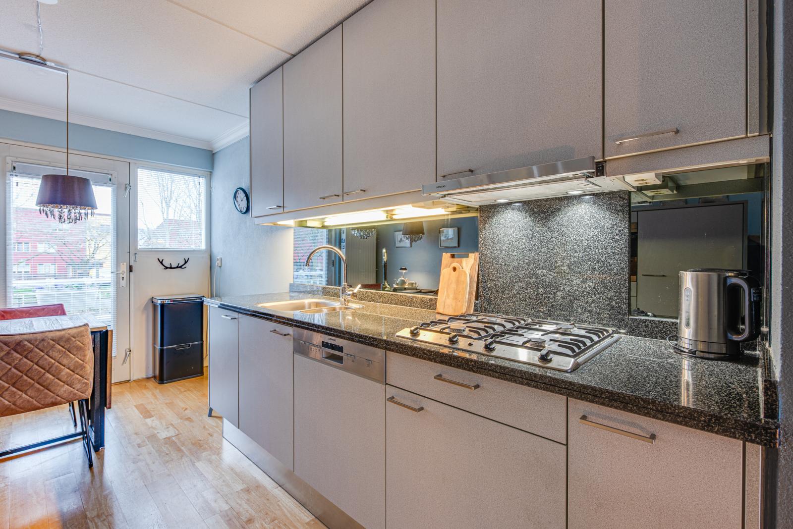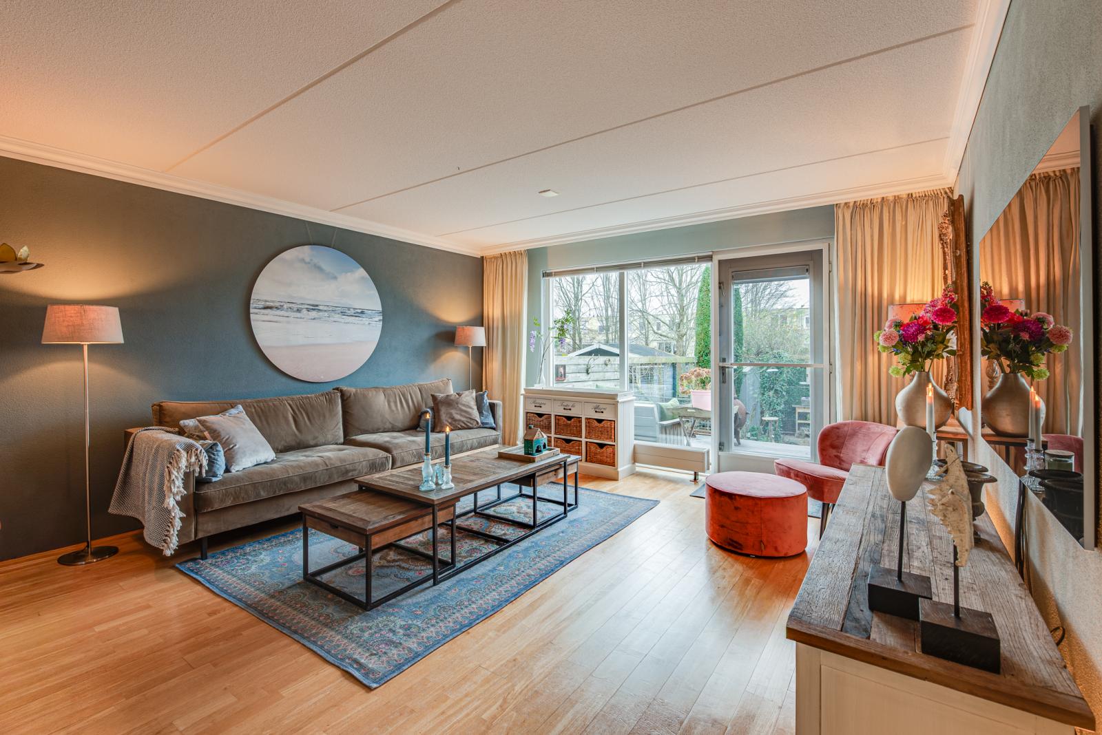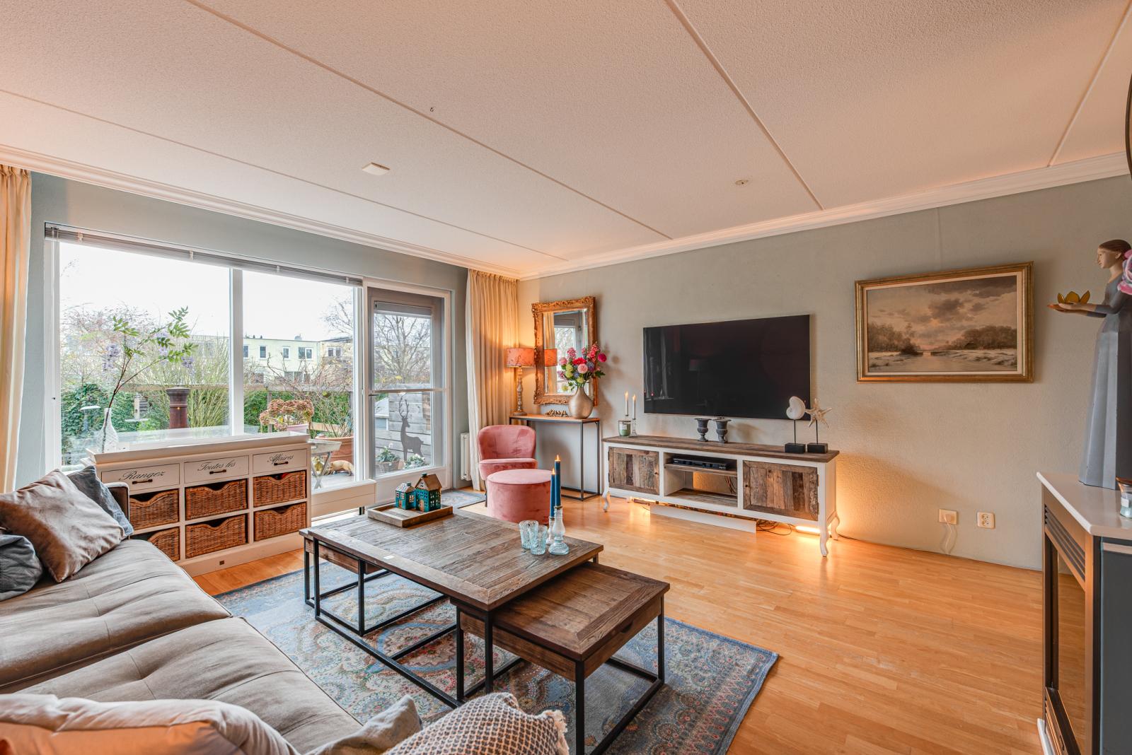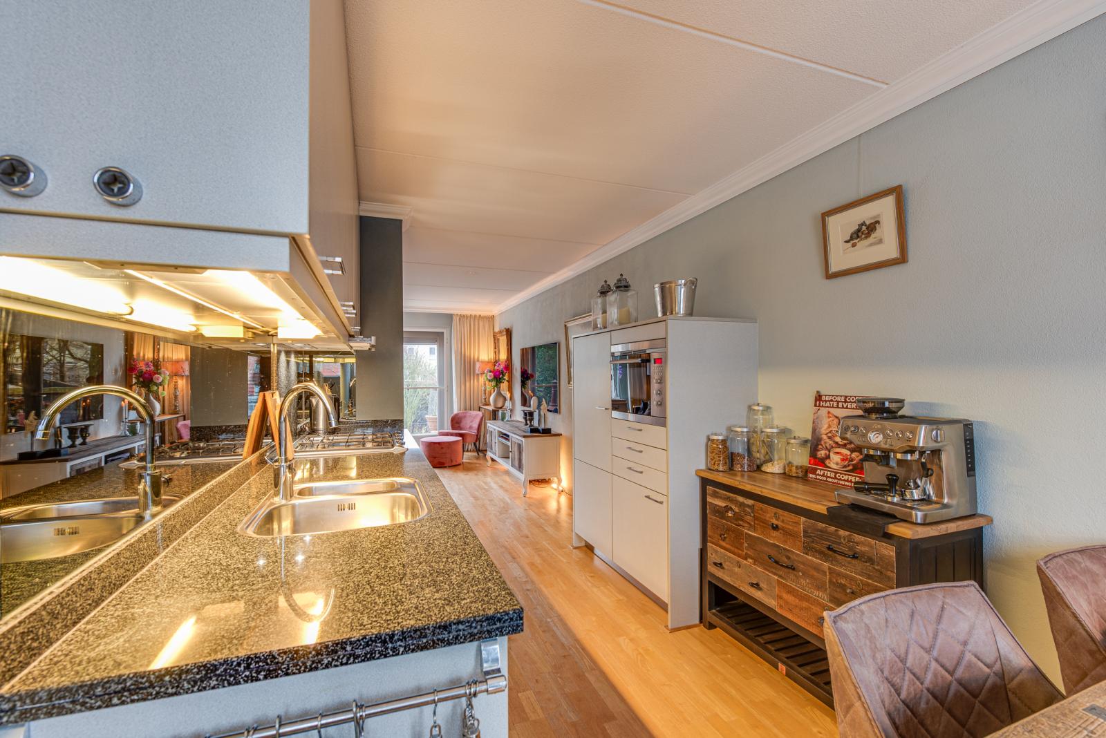 Eerste etage: bereikbaar via een trap aan de buitenzijde, dan wel via de hal en vaste trap, entree, meterkast, toiletruimte, trap naar zowel boven als naar beneden, royale lichte woonkamer met achterdeur welke toegang geeft tot het terras en de ruime tuin op het zuidwesten, open keuken voorzien van diverse inbouwapparatuur en een openslaande deur aan de voorzijde.