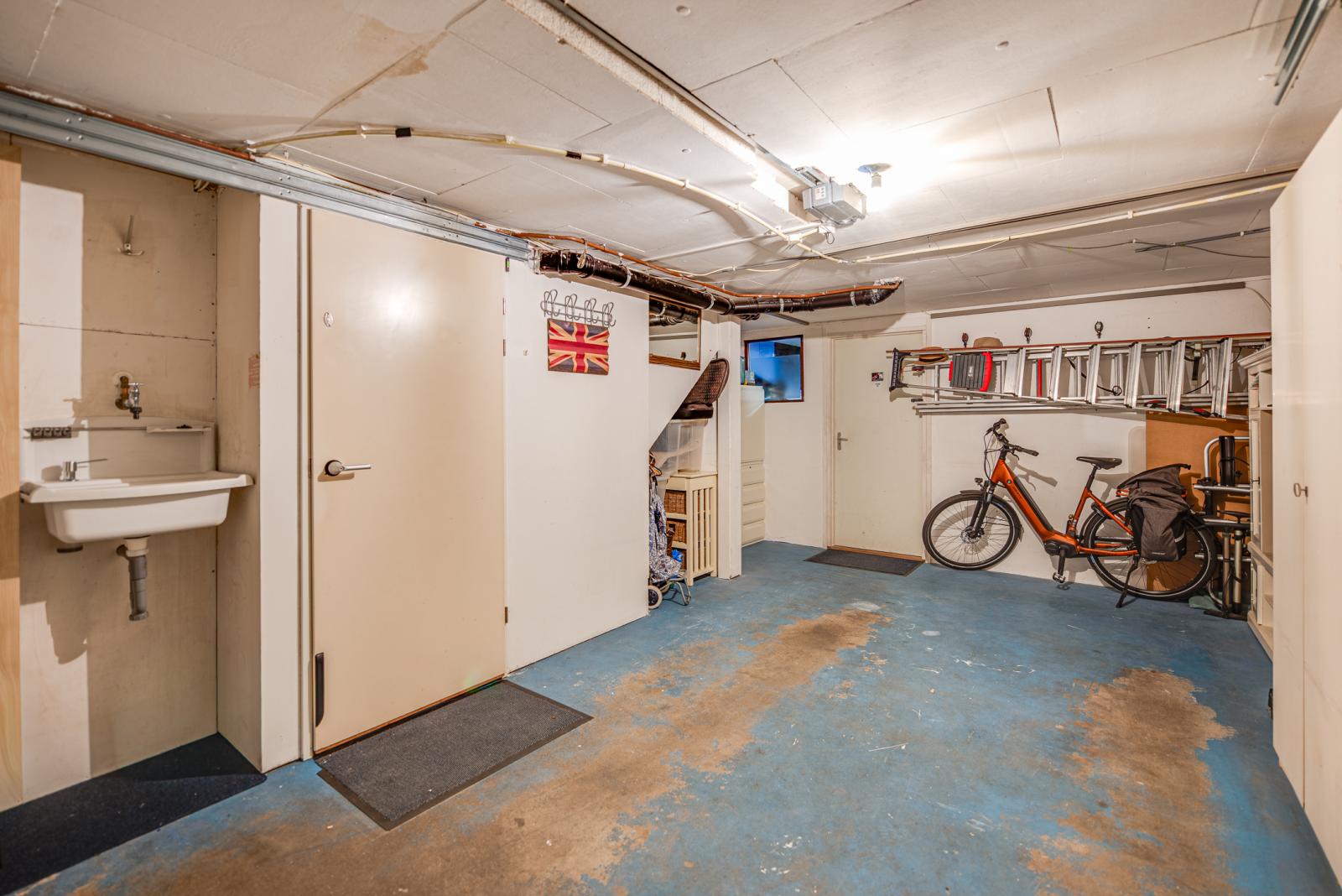 Begane grond (souterrain): parkeerplaats op eigen grond, riante en volledig geïsoleerde inpandige garage (ruim 40m2!) voorzien van elektra, water en verwarming. Deze ruimte, is hiermee niet alleen praktisch voor opslag, maar kan ook multifunctioneel worden ingezet als bijvoorbeeld kantoor of kleinschalige bedrijfsruimte. Aansluitend is er een extra kamer gerealiseerd die uitstekend dienst kan doen als werkkamer, praktijkruimte of logeerkamer.