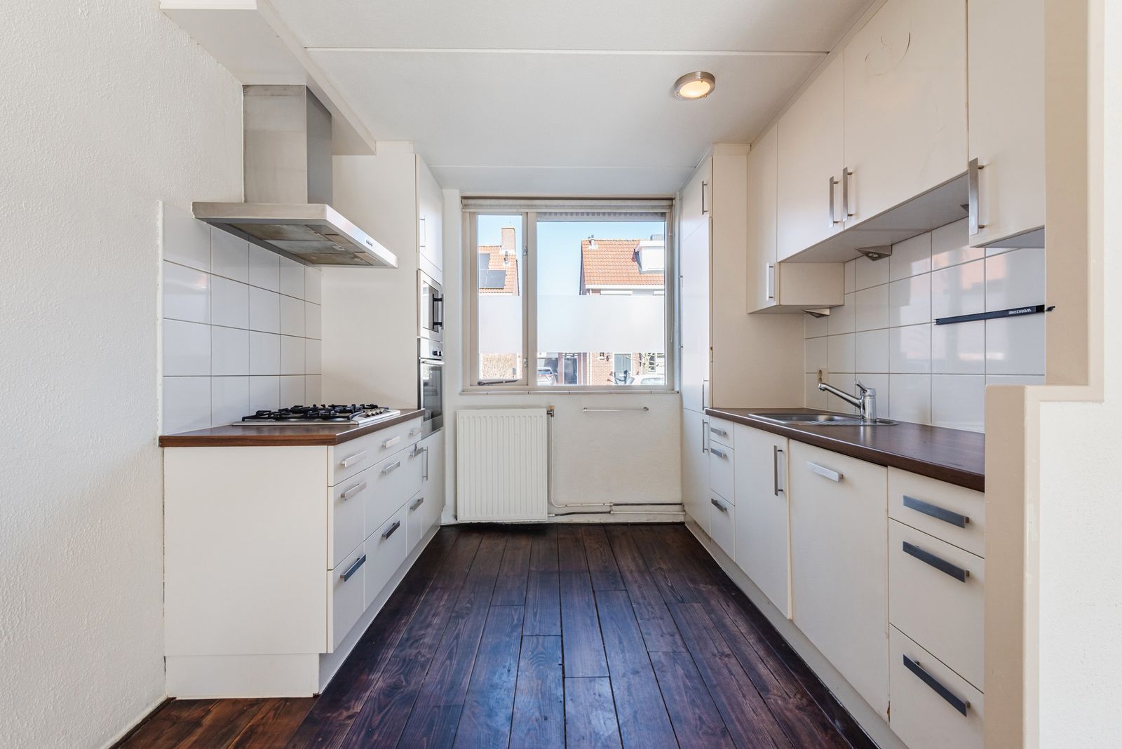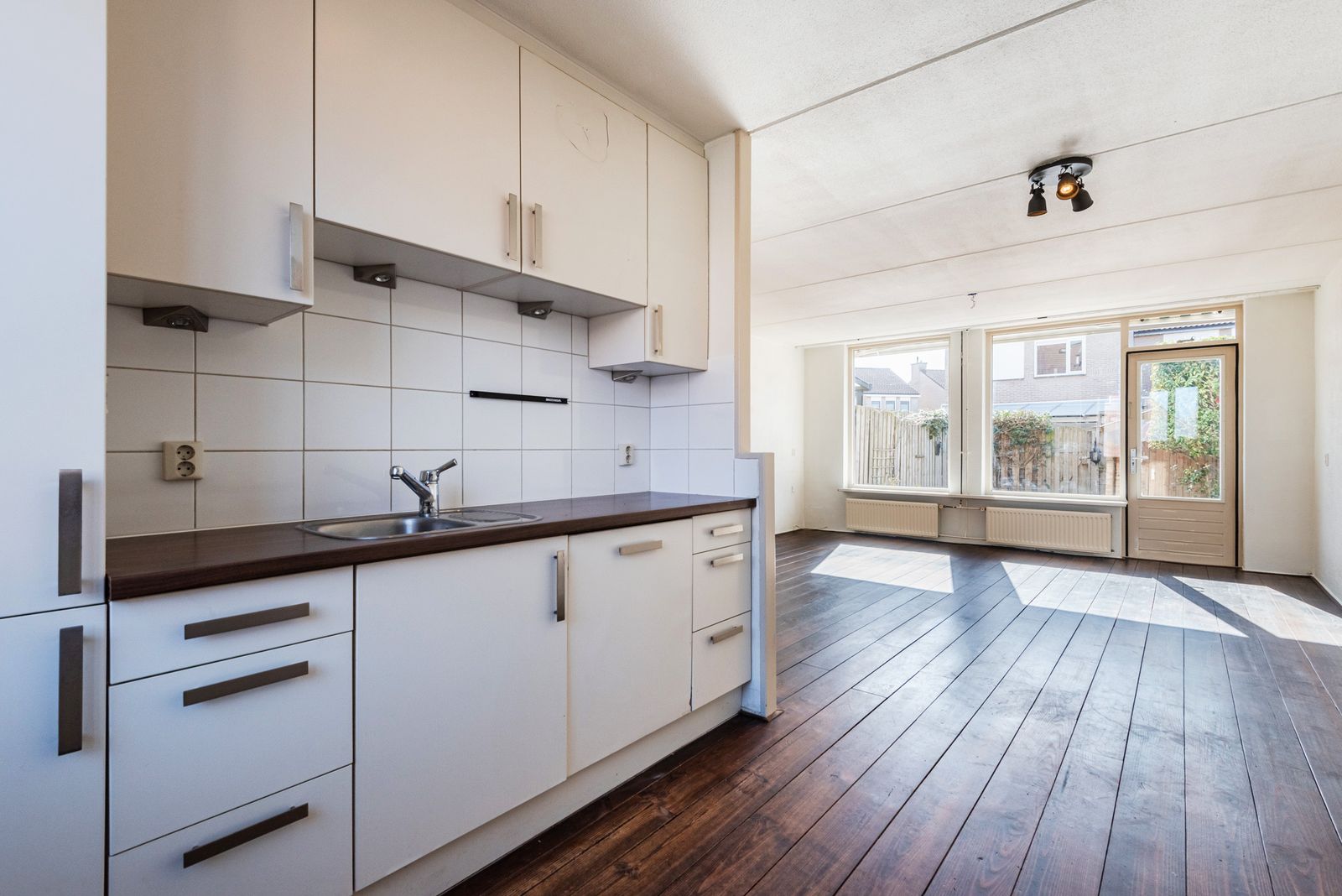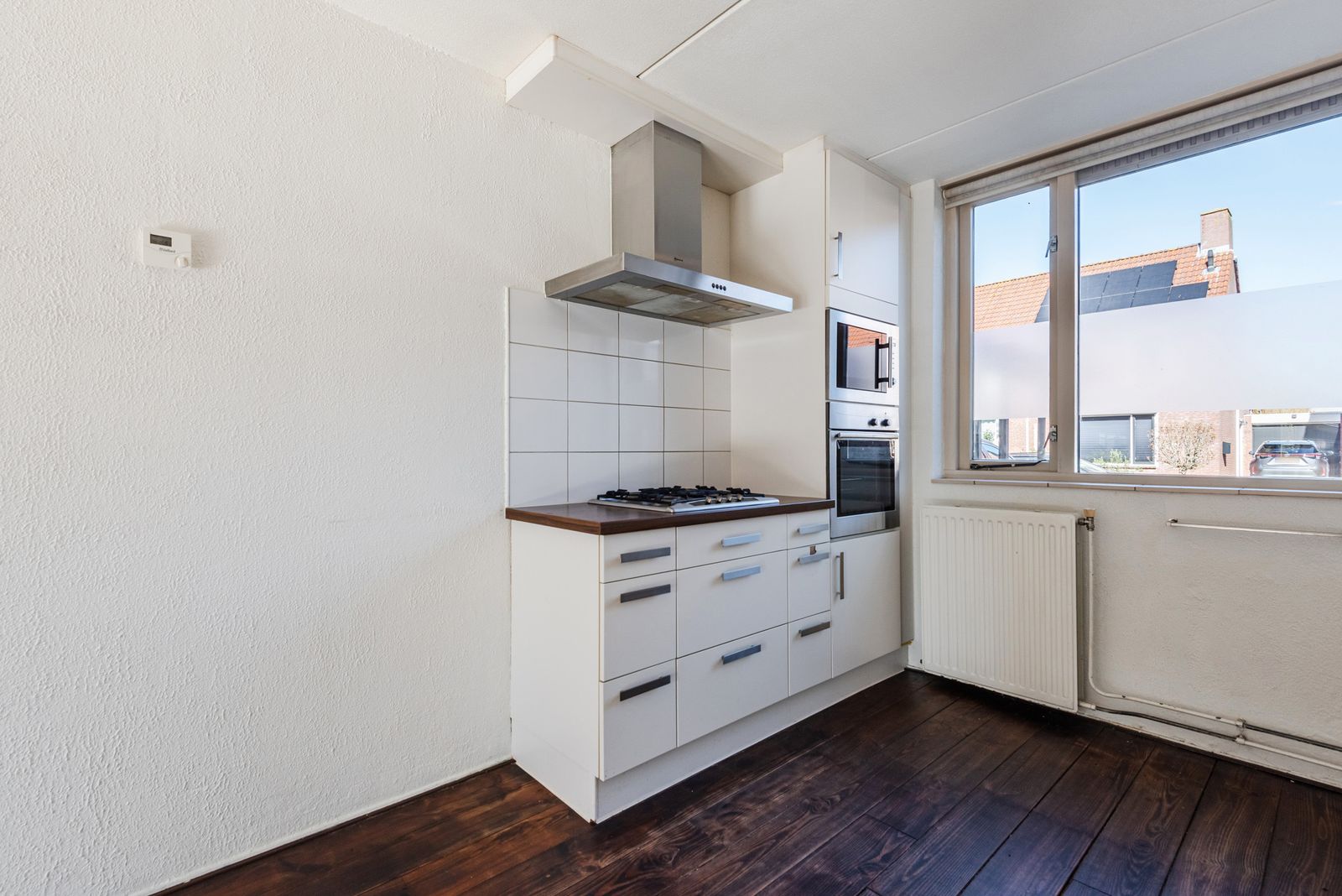 Aan de voorzijde bevindt zich de open keuken, voorzien van diverse inbouwapparatuur zoals een gaskookplaat, afzuigkap, oven, magnetron, vaatwasser en koel-/vriescombinatie. De keuken is functioneel, maar biedt ook mogelijkheden om deze geheel naar eigen smaak te moderniseren.