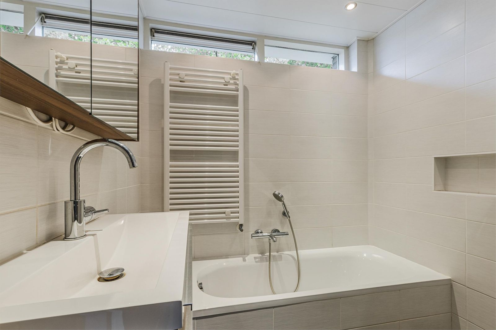 Overloop met tweede toilet. Aan de voorzijde een royale slaapkamer en badkamer. De badkamer is voorzien van ligbad en douche. Aan de achterzijde bevinden zich twee slaapkamers met uitzicht op de tuin en een balkon.