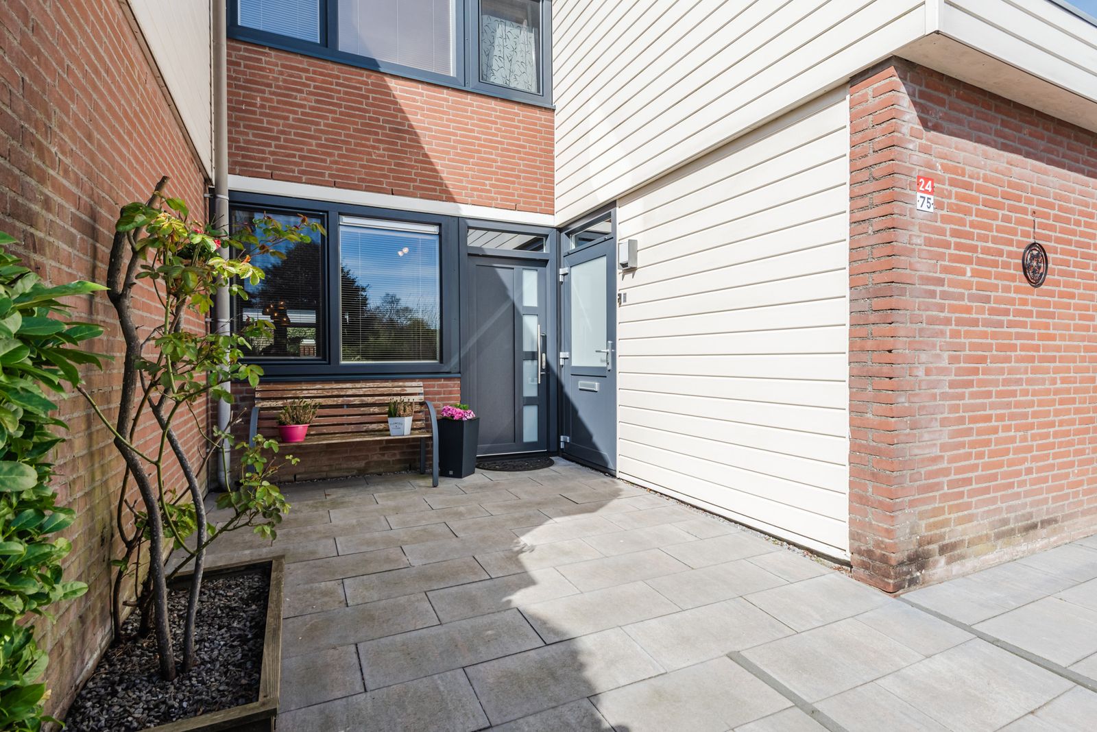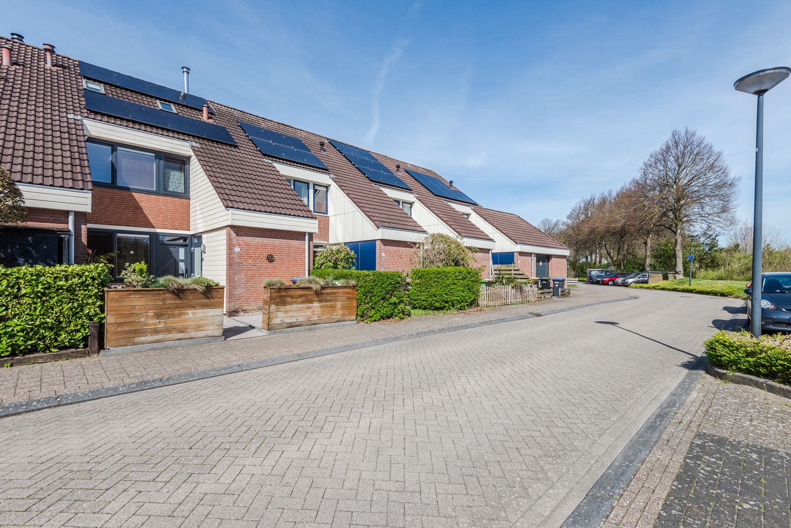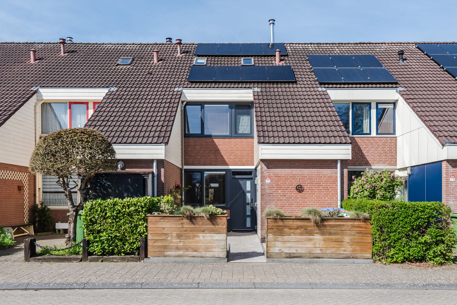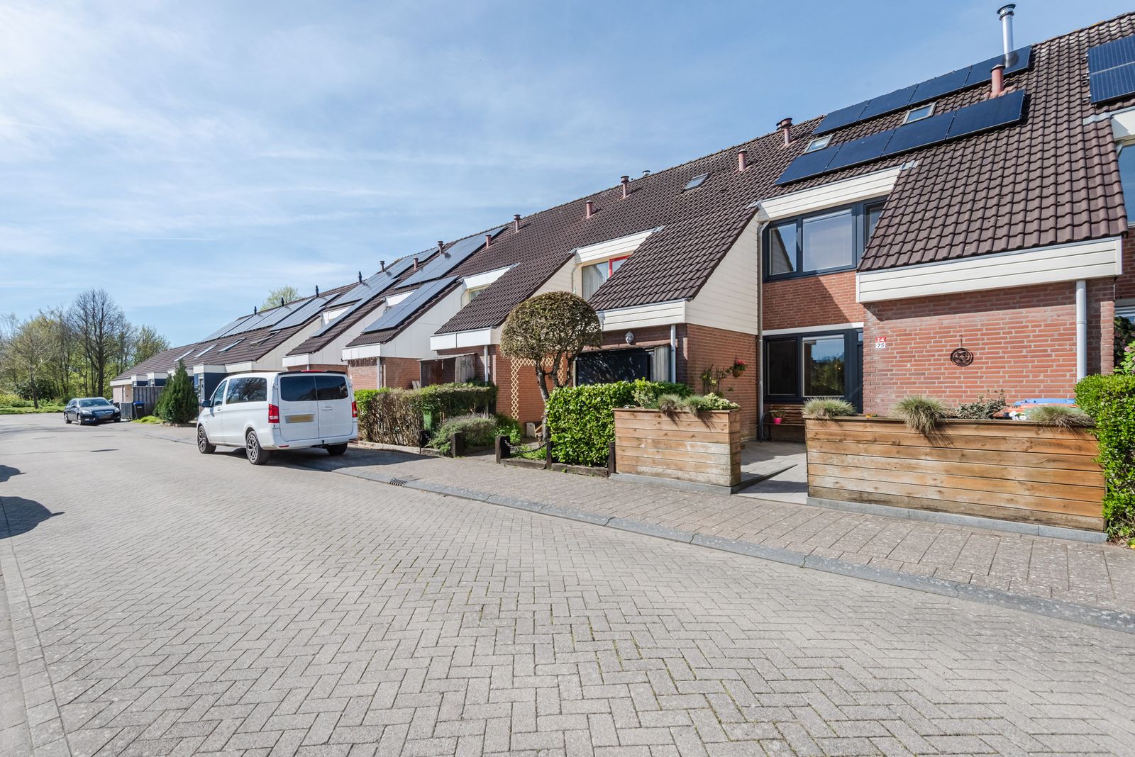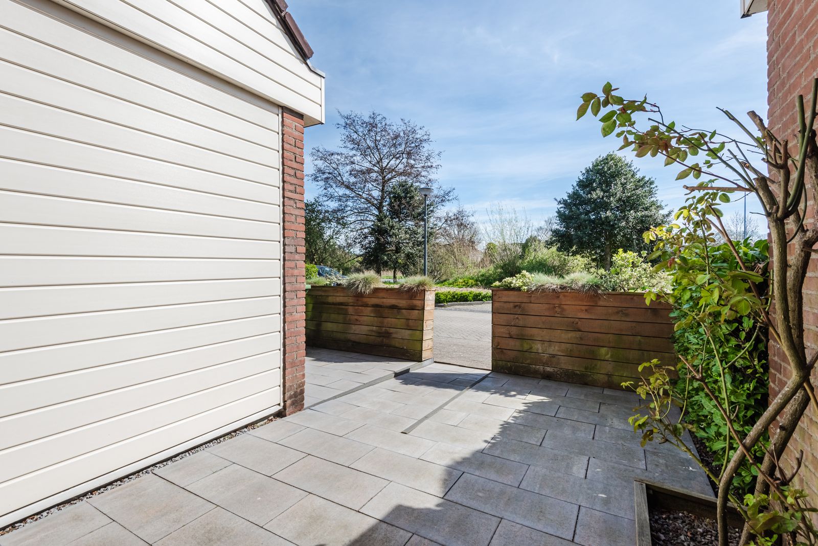 Zowel de voor- als achterzijde van de woning hebben een vrije ligging. De volwassen achtertuin is gesitueerd op het westen, waardoor u optimaal profiteert van de middag- en avondzon. De voortuin is volledig betegeld en fraai afgewerkt met houten plantenbakken bij de entree.