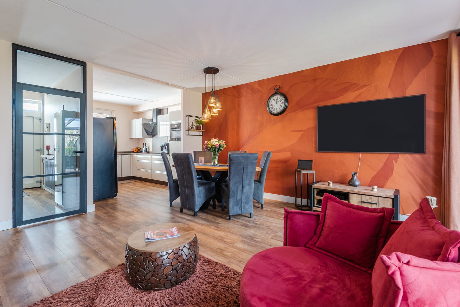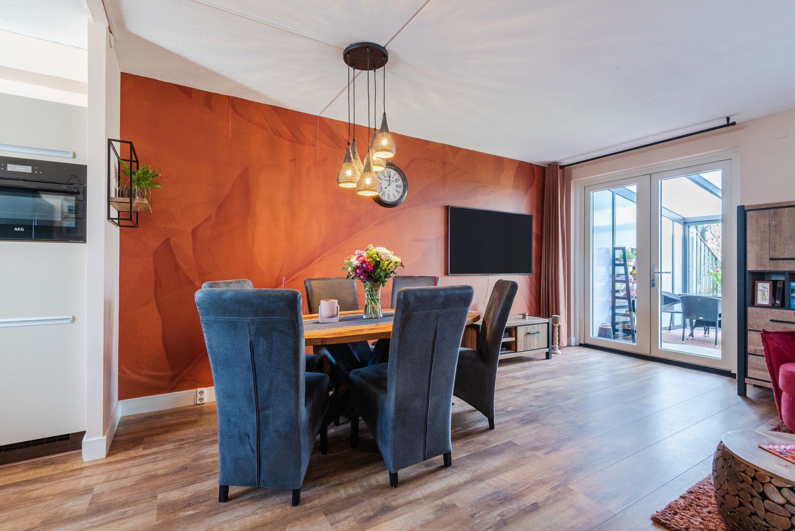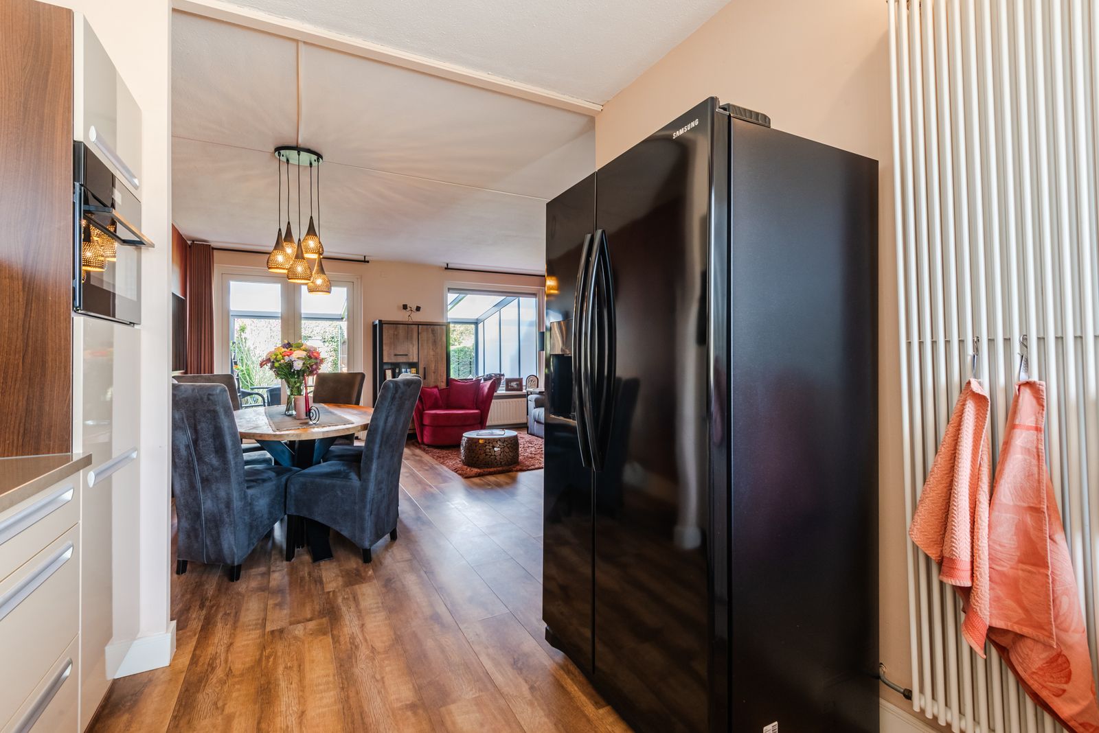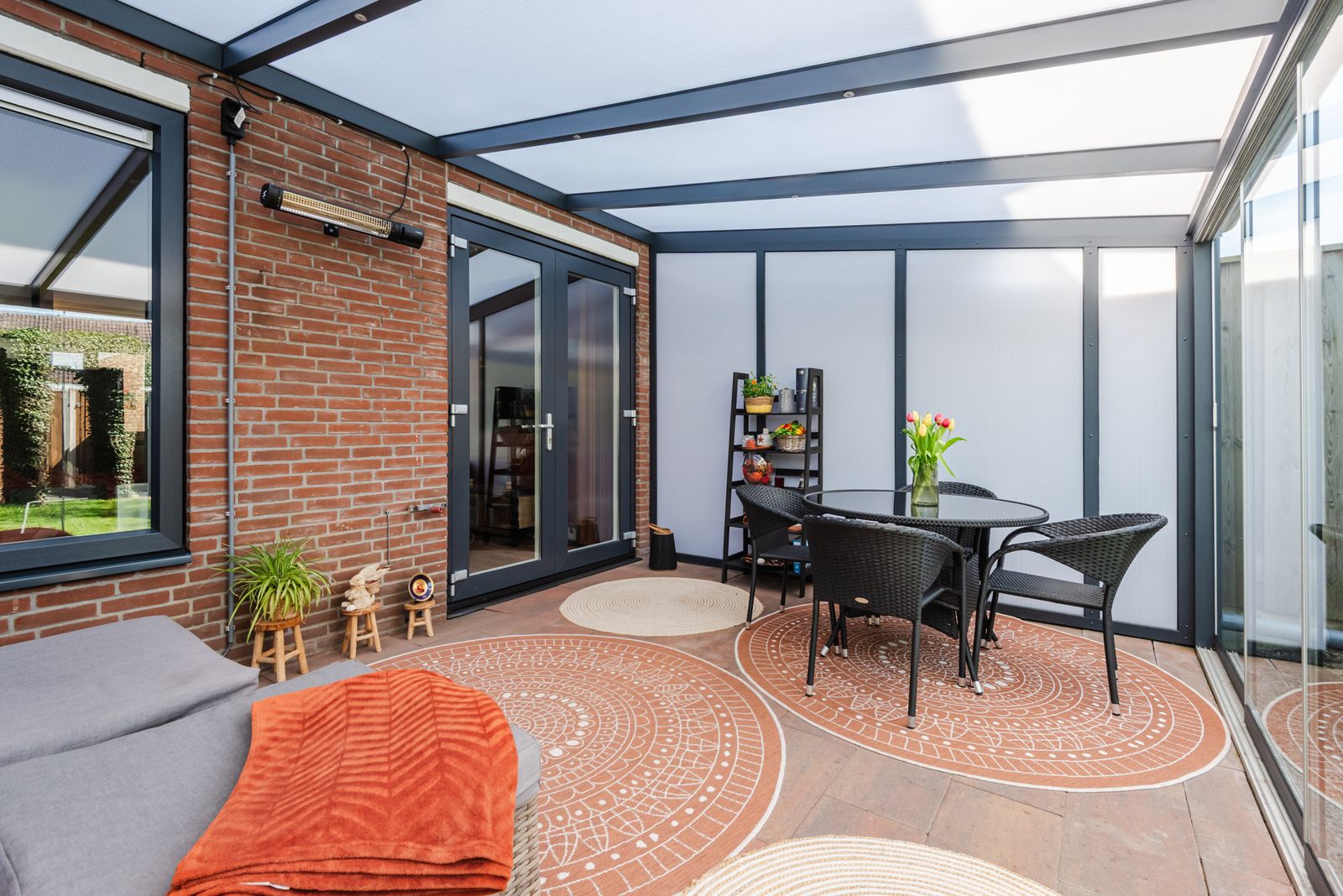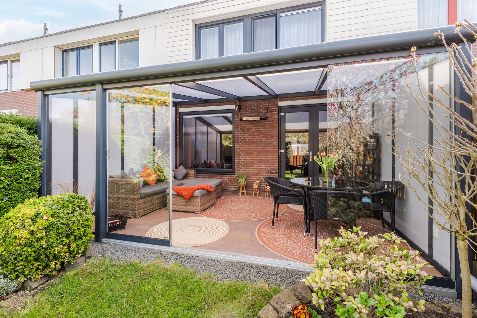 Vanuit de woonkamer bereikt u de prachtige tuinkamer, een heerlijke extra leefruimte waar u het gehele jaar comfortabel buiten kunt zitten.