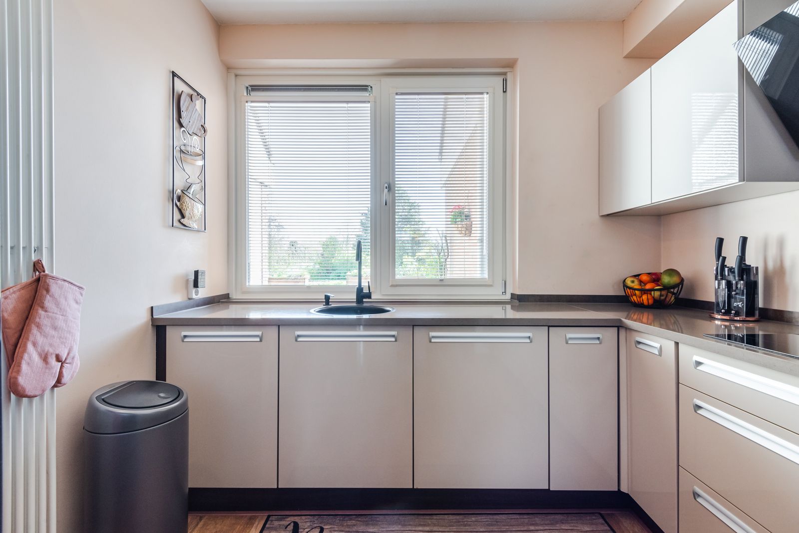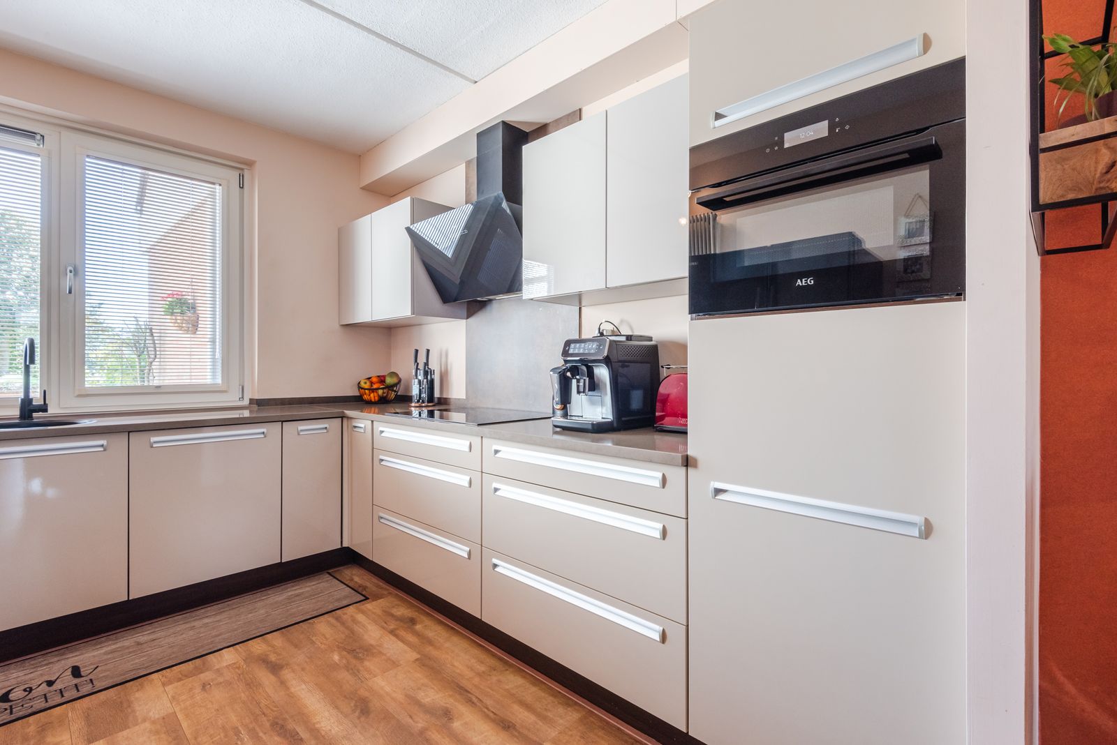 Vanuit de woonkamer loopt u door naar de halfopen keuken aan de voorzijde van de woning. De keuken is uitgevoerd in een praktische L-opstelling en voorzien van een taupekleurig keukenblok met composiet aanrechtblad. Dankzij de diepe laden en kastruimte beschikt u over volop bergruimte.