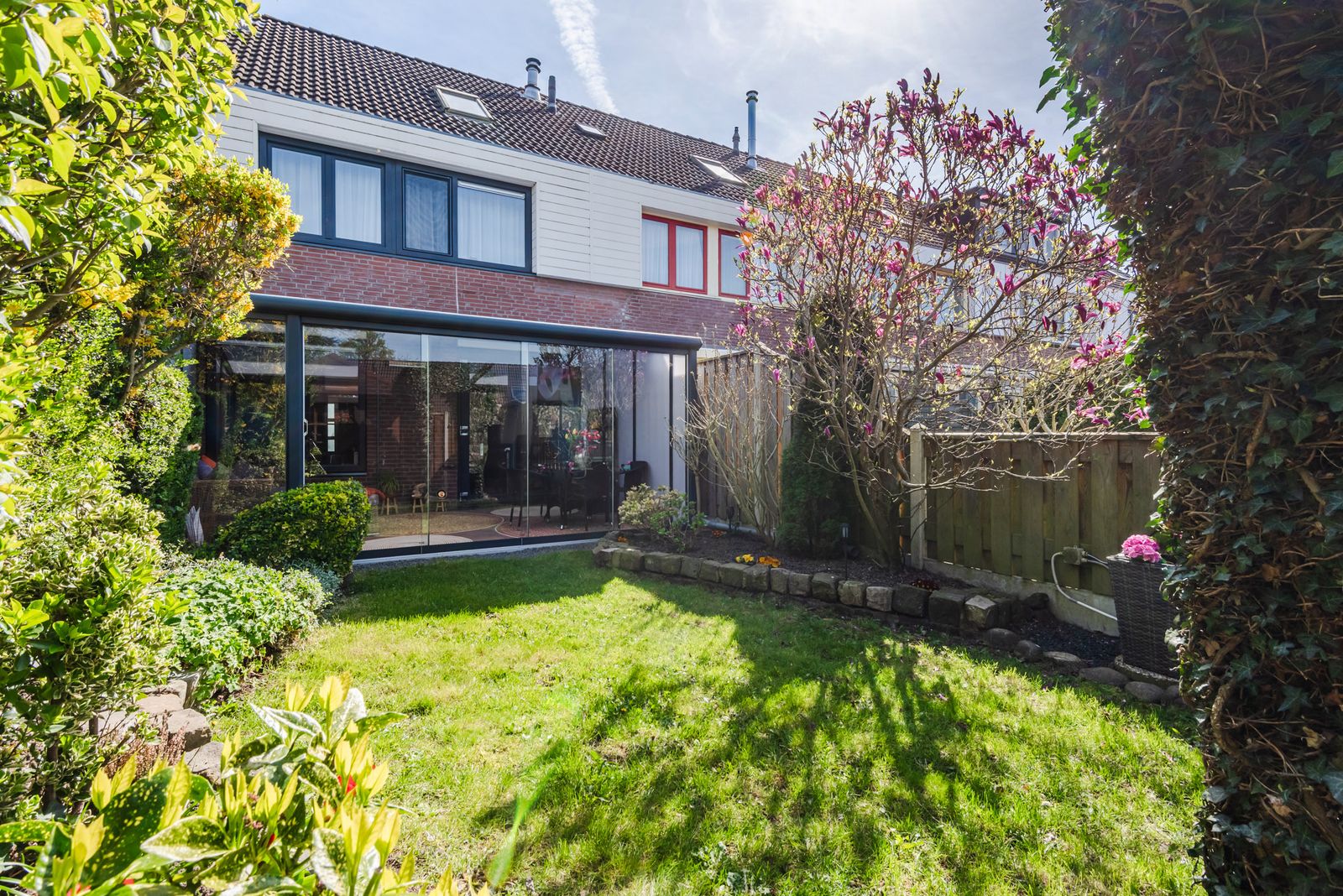 De achtertuin is verzorgd aangelegd met nette bestrating, diverse volwassen beplanting en veel privacy dankzij de schuttingen en groene erfafscheiding.