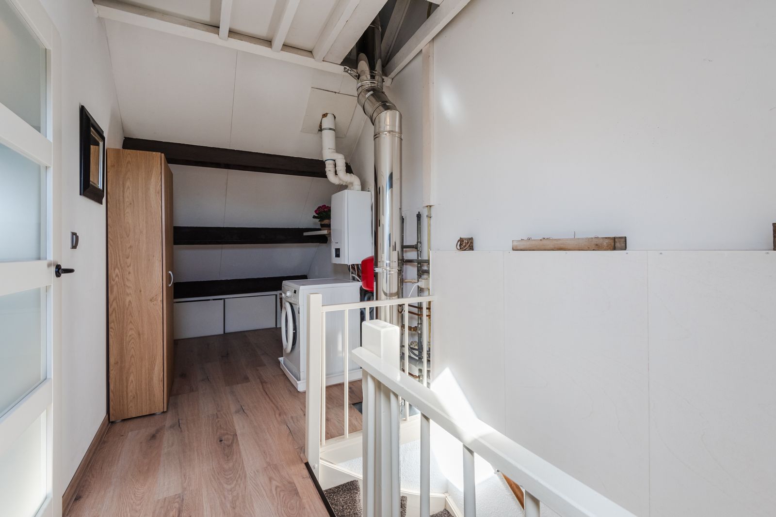 Op de overloop bevinden zich de cv-ketel (Remeha, 2024) en de aansluiting voor de wasmachine.