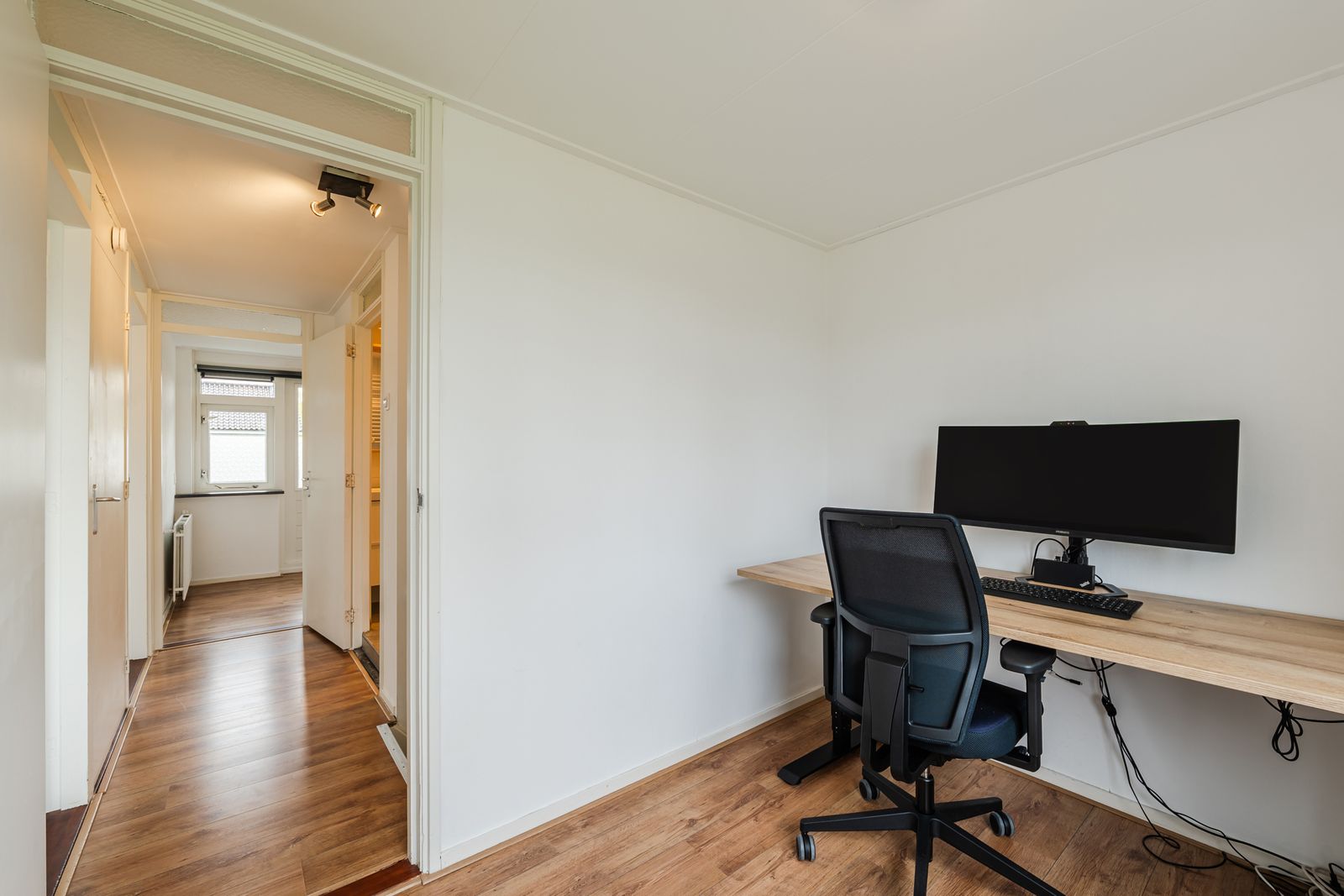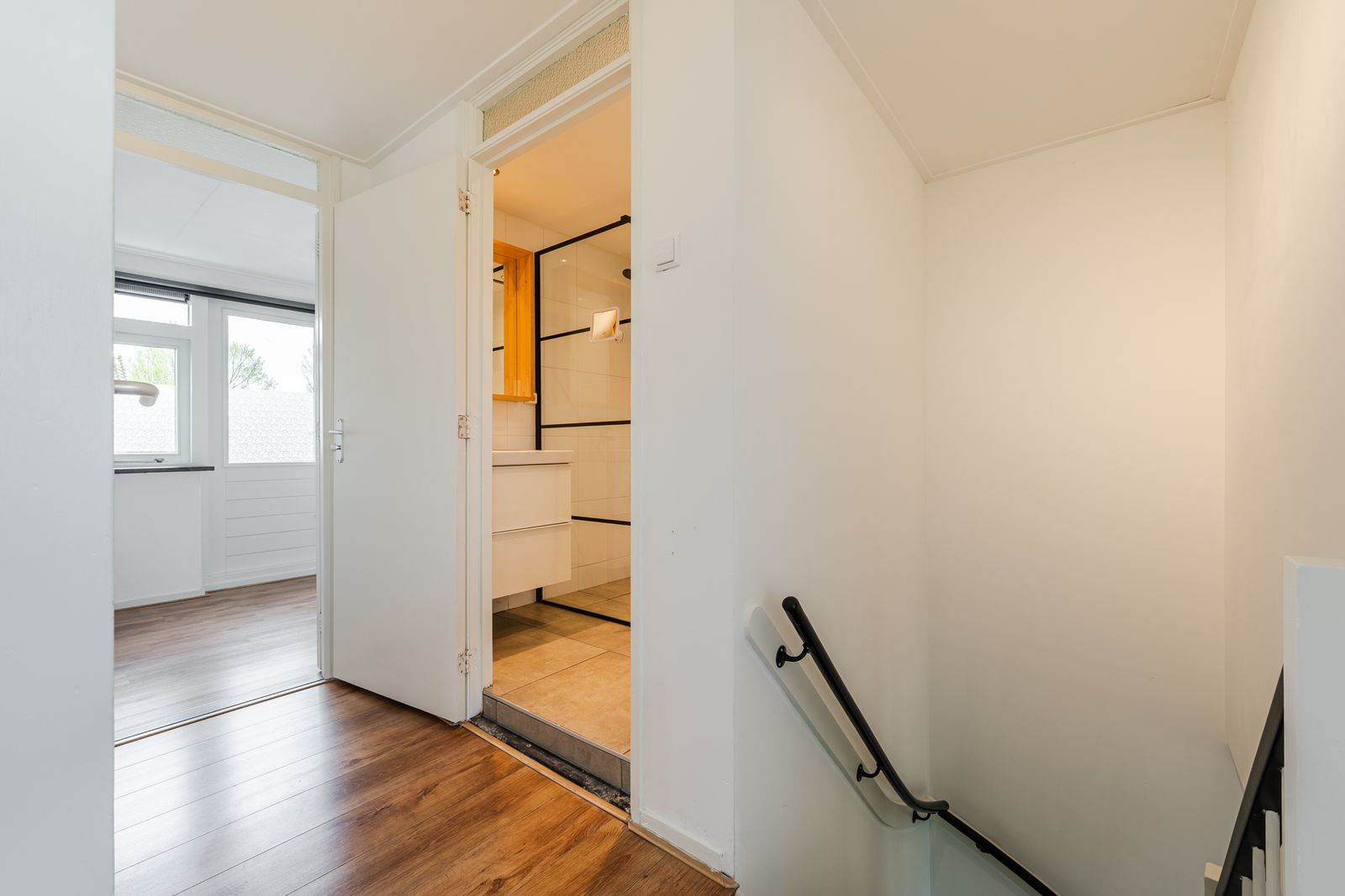 Overloop met toegang tot de twee slaapkamers, een werk-/studeerkamer en een aparte wasruimte met toegang tot het balkon. Er is de mogelijkheid de twee overige kamers ook als slaapkamers te gebruiken. De badkamer is compleet uitgevoerd met een douche, wastafelmeubel en tweede toilet.