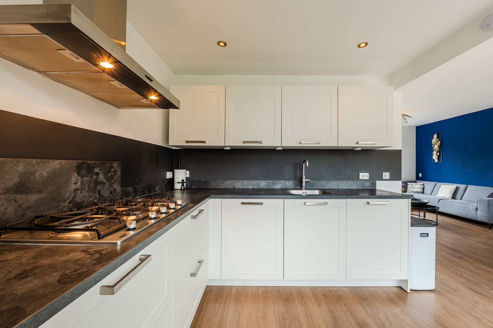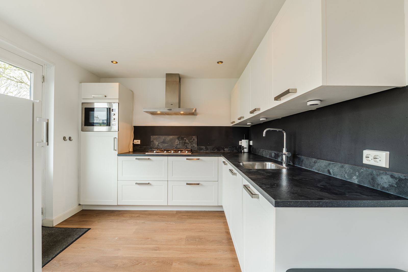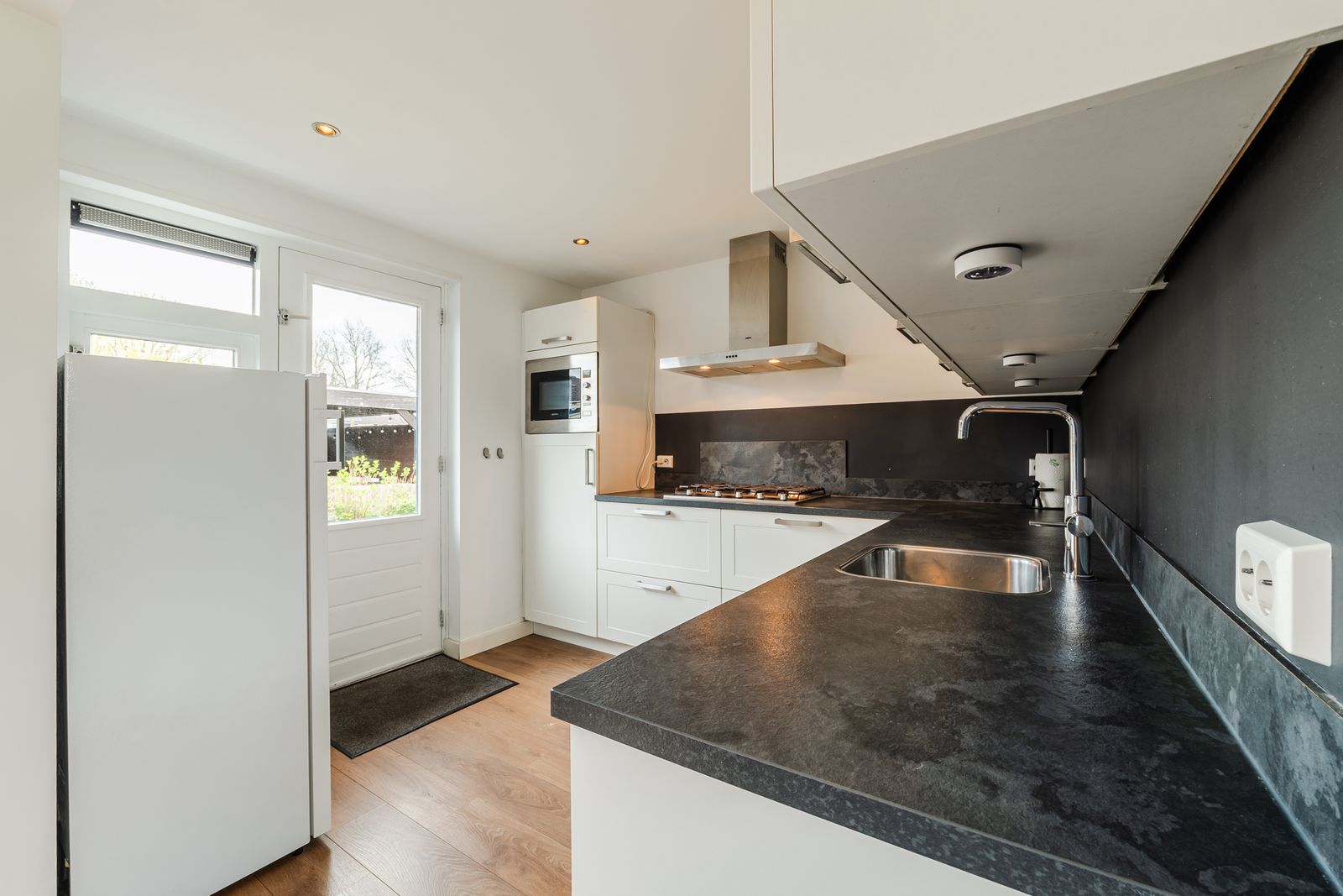 Entree/hal met meterkast, trapopgang, trapkast en modern toilet. De ruime en lichte woonkamer kenmerkt zich door grote raampartijen aan voor- en achterzijde en een prettige, open verbinding met de keuken. De keuken is uitgevoerd in een praktische L-opstelling en voorzien van diverse inbouwapparatuur, waaronder een gaskookplaat, afzuigkap, combimagnetron, koelkast en vaatwasser. Vanuit de keuken is er directe toegang tot de achtertuin.