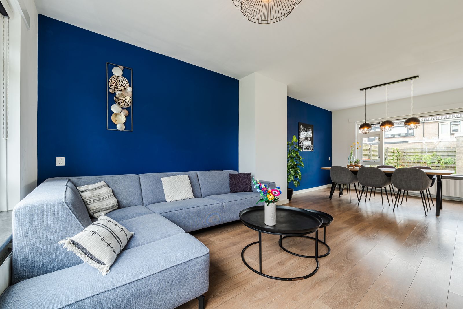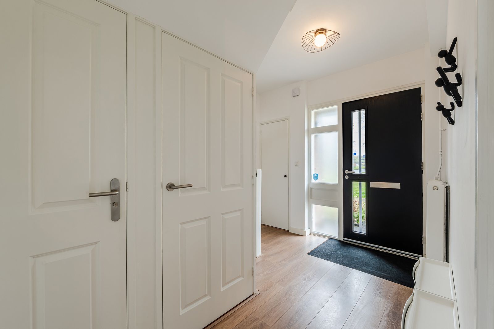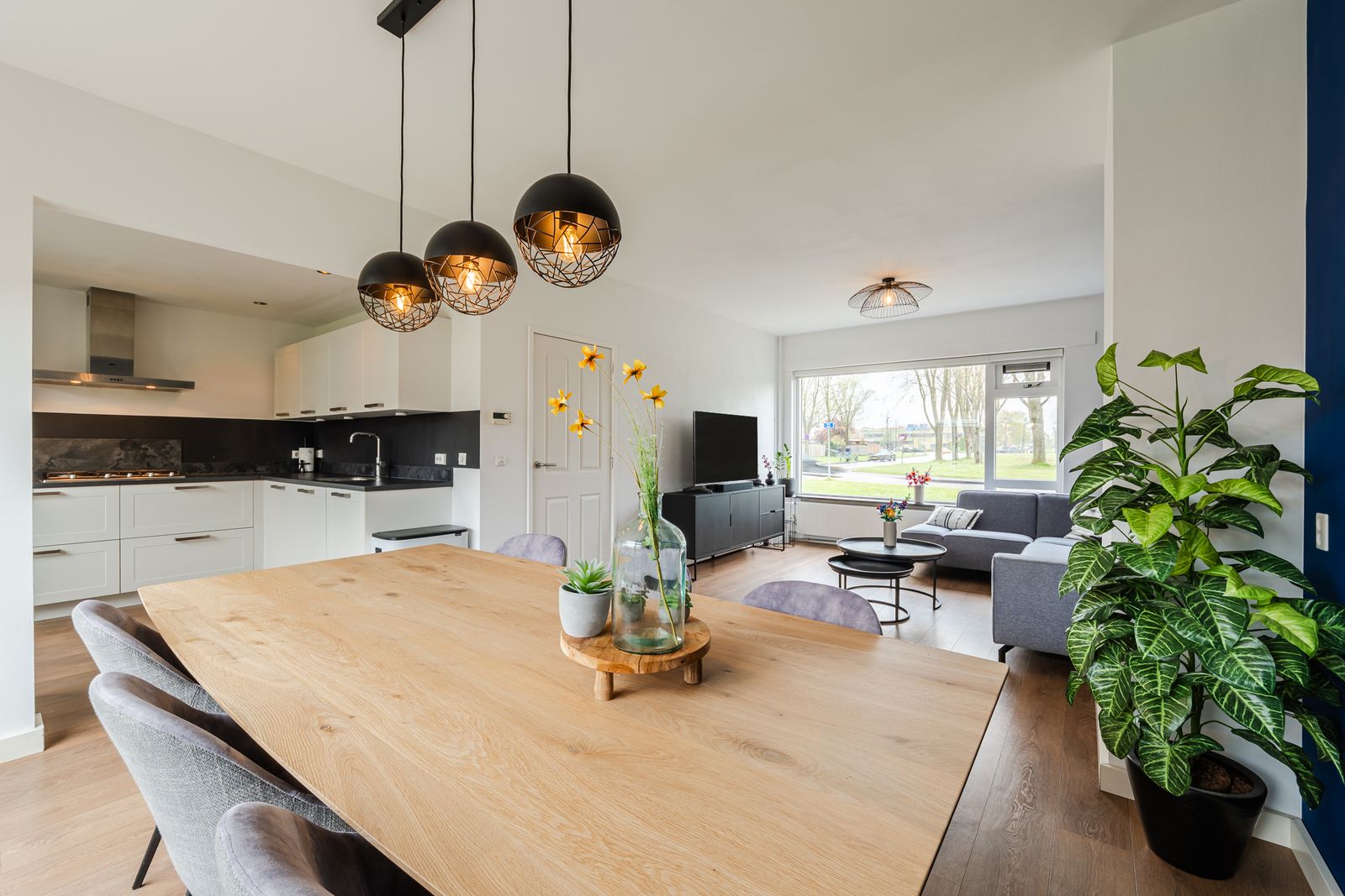 Entree/hal met meterkast, trapopgang, trapkast en modern toilet. De ruime en lichte woonkamer kenmerkt zich door grote raampartijen aan voor- en achterzijde en een prettige, open verbinding met de keuken. De keuken is uitgevoerd in een praktische L-opstelling en voorzien van diverse inbouwapparatuur, waaronder een gaskookplaat, afzuigkap, combimagnetron, koelkast en vaatwasser. Vanuit de keuken is er directe toegang tot de achtertuin.