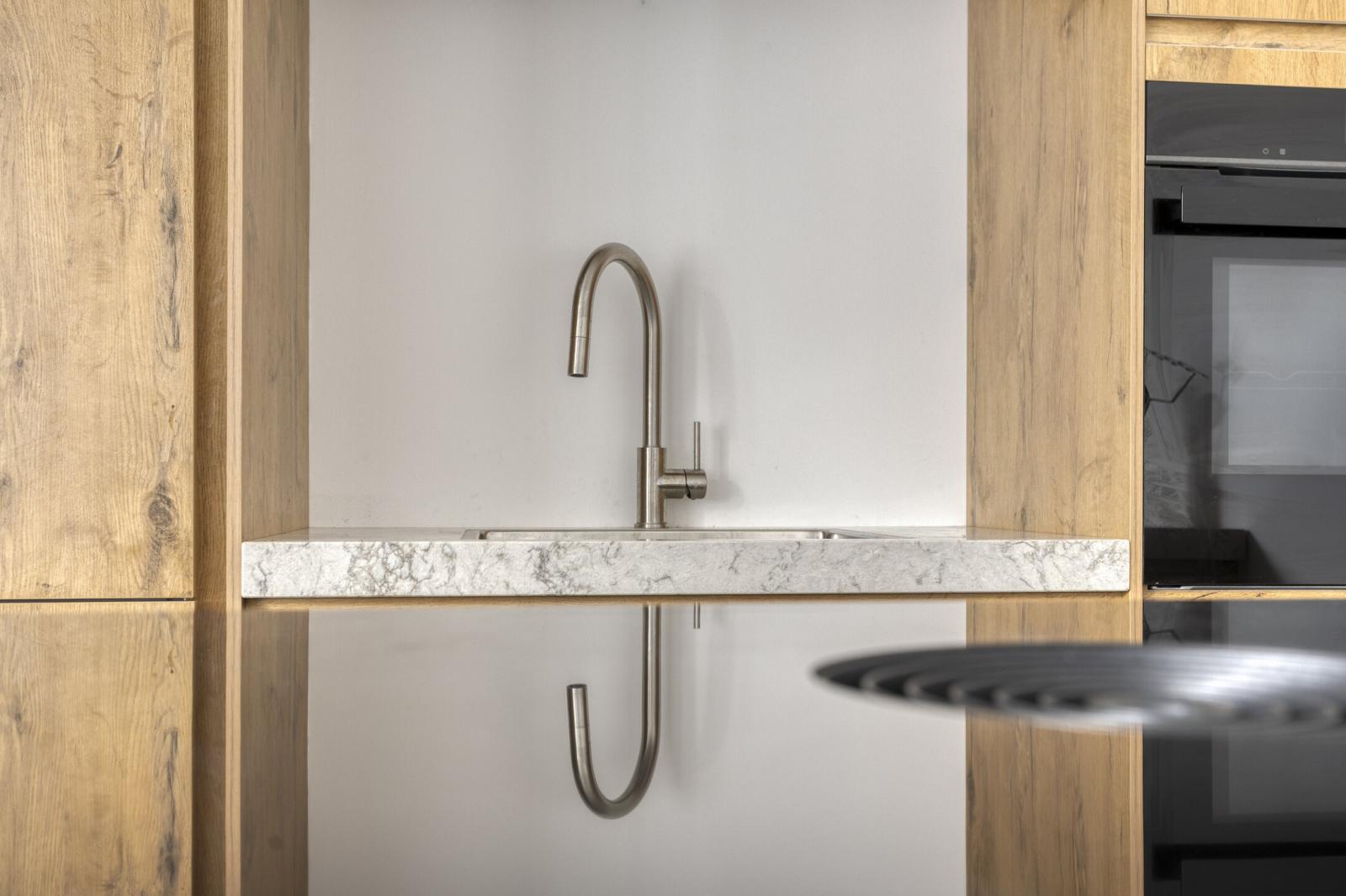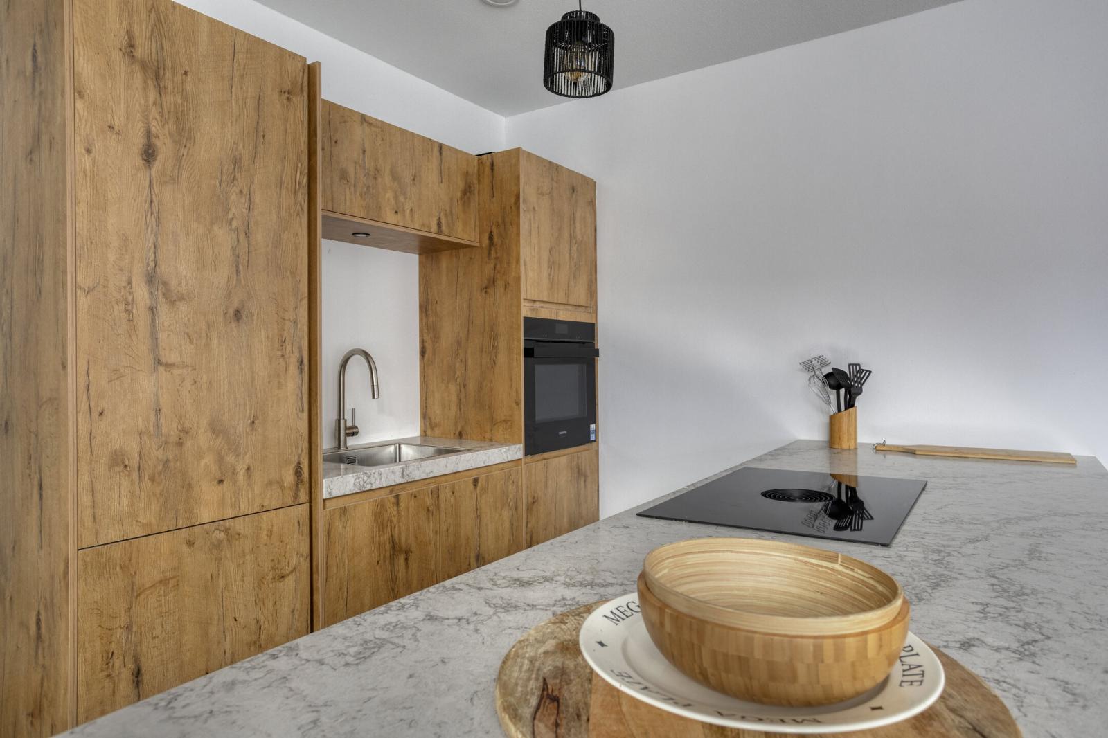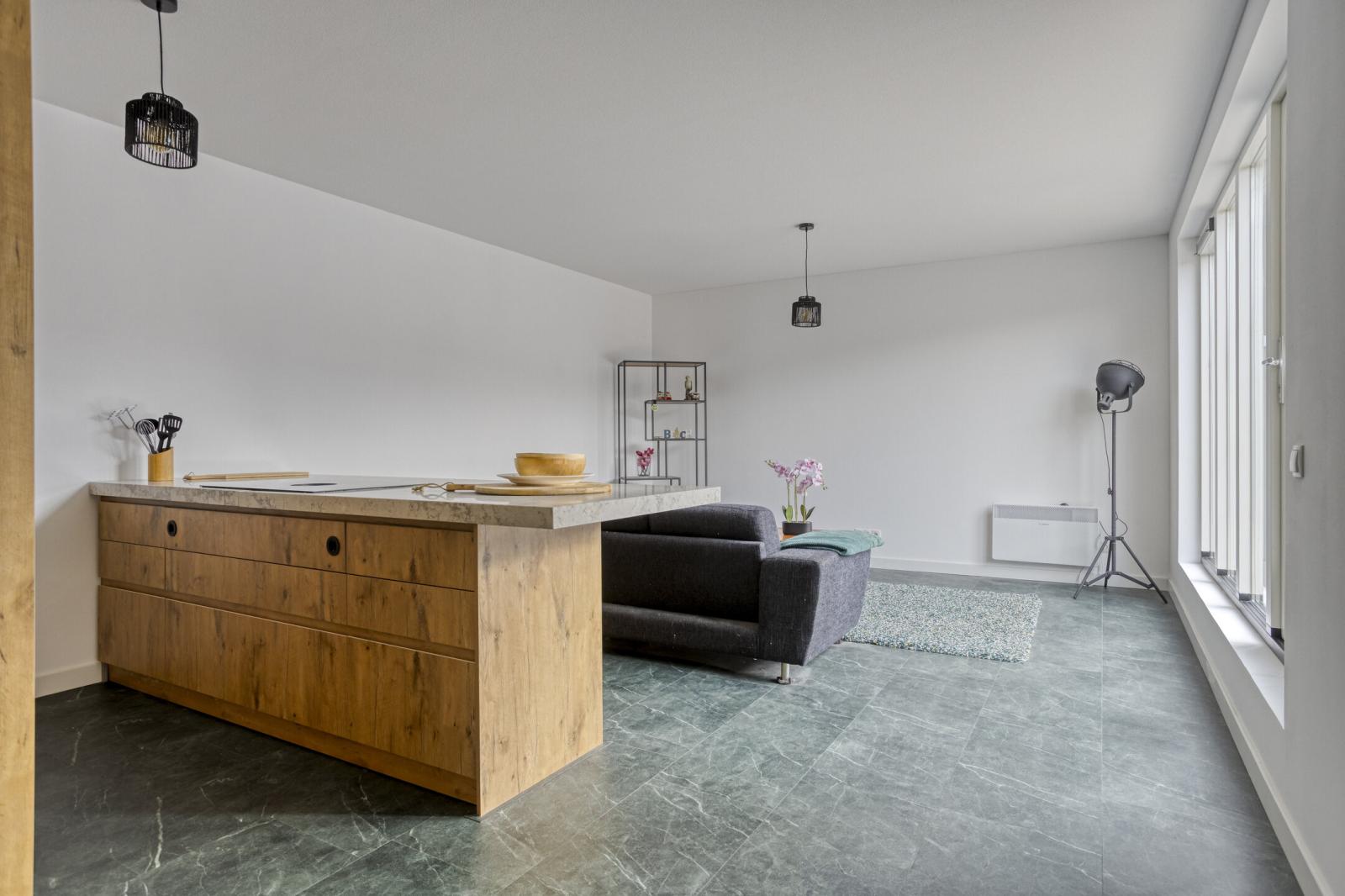Verdieping: intercom met camera en deuropener, lichte woonkamer met moderne open keuken, welke voorzien is van koel/vries combinatie, combi oven/magnetron, vaatwasser, kookeiland met bar en een inductie kookplaat van het merk BORA. Vanuit de woonkamer bereikt u het ruime dakterras.