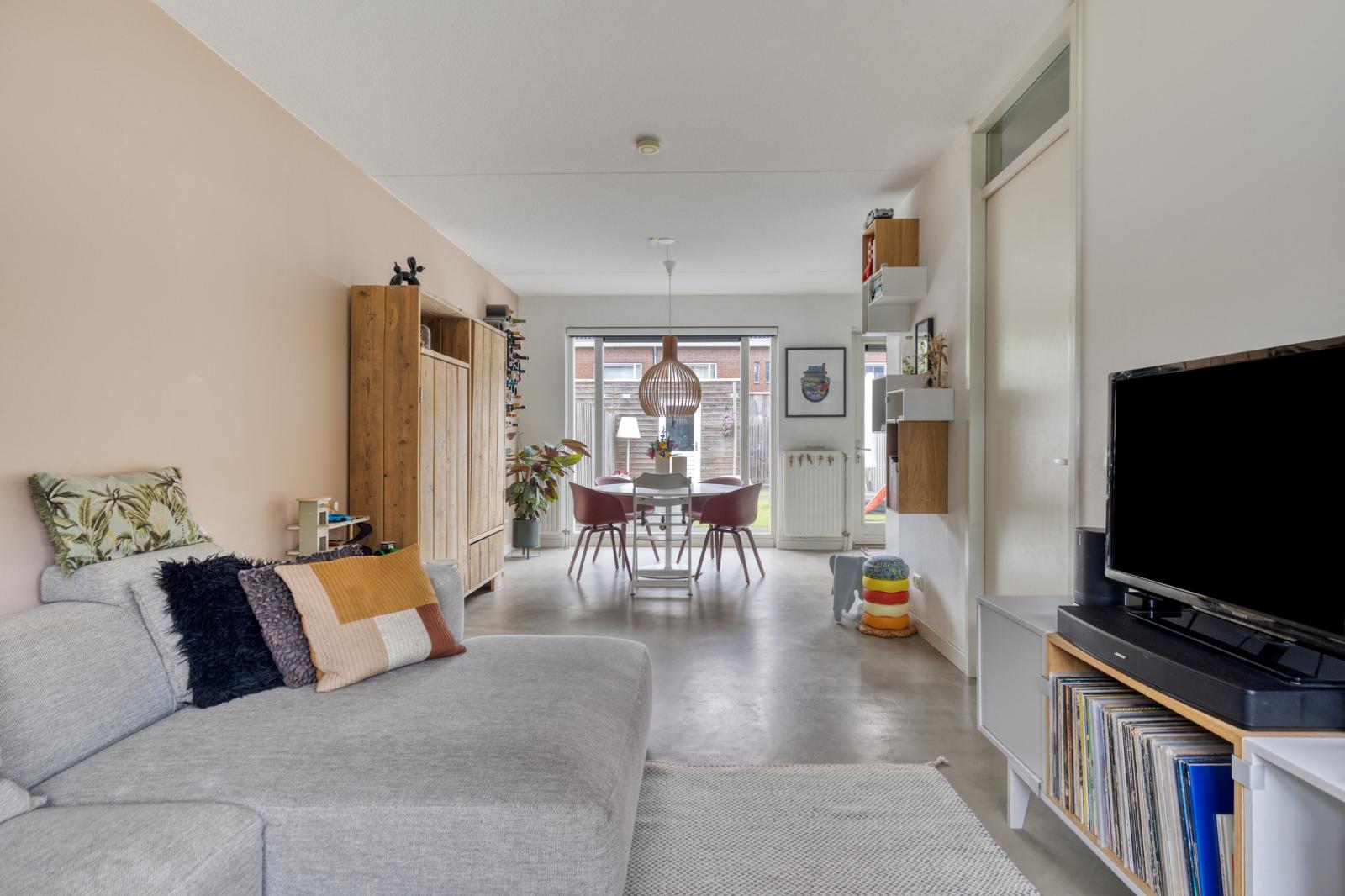 Entree met hal, meterkast, toilet en trapopgang. Onder de trap is een praktische opbergruimte gerealiseerd. De woonkamer heeft een zithoek aan de voorzijde en een eethoek aan de achterzijde, waar een grote raampartij met tuindeur uitzicht geeft op de tuin. De open keuken is voorzien van diverse inbouwapparatuur.