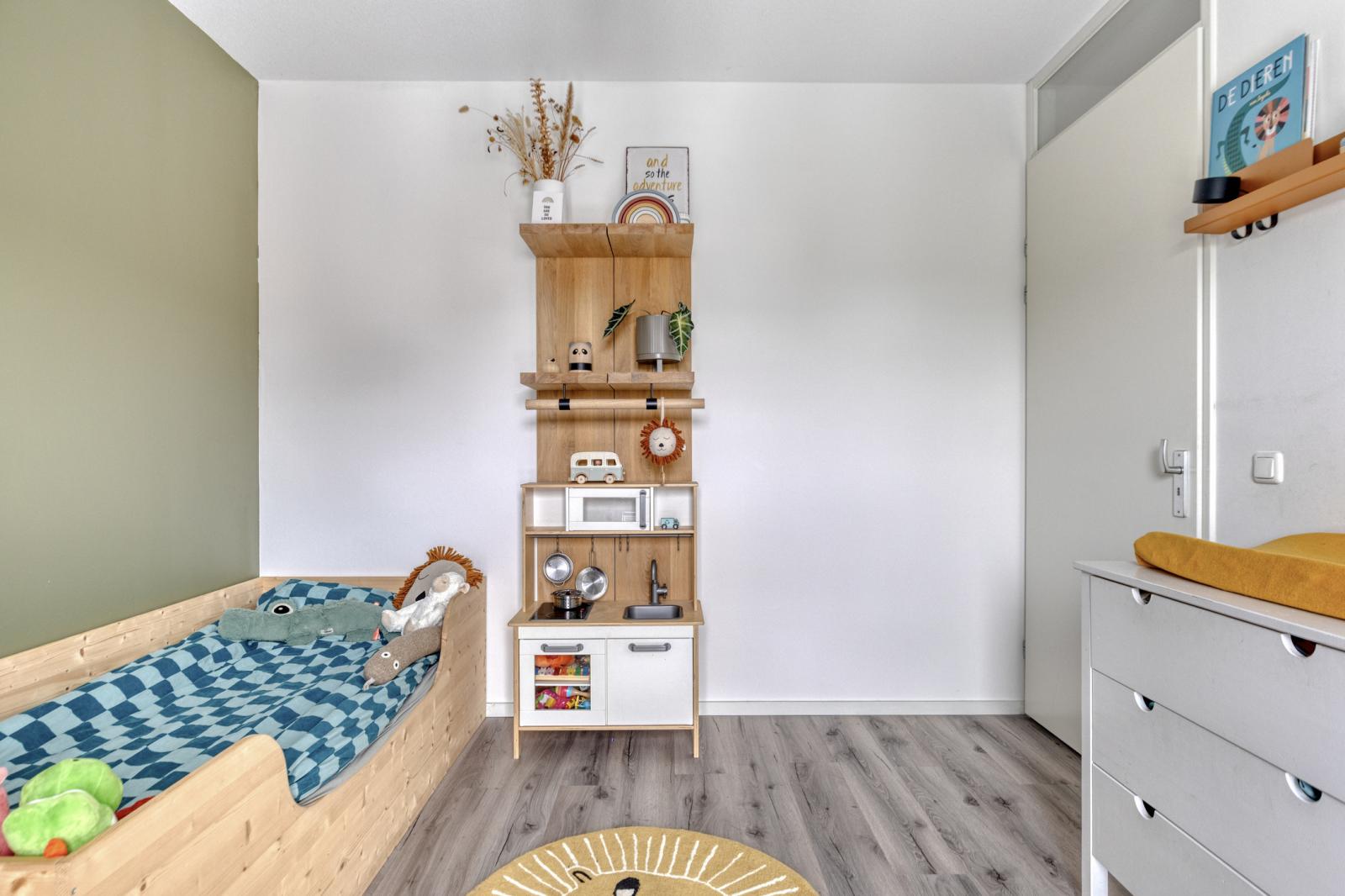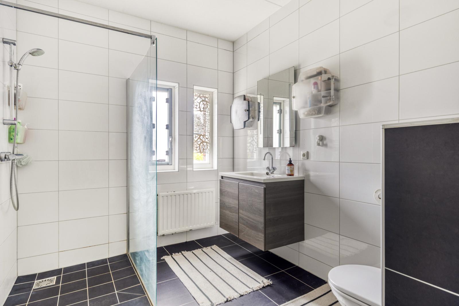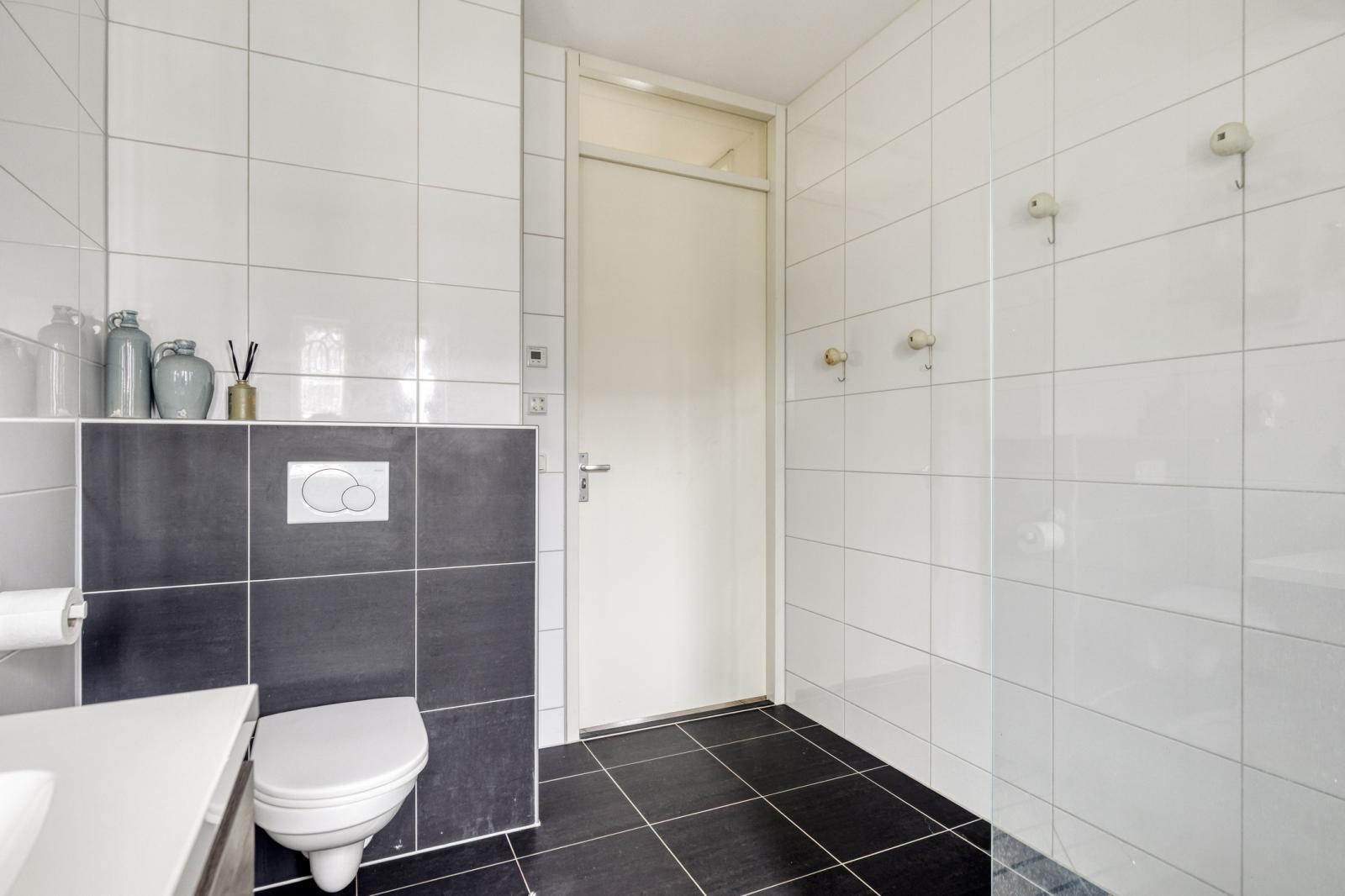 Hier bevinden zich twee ruime slaapkamers van circa 15 m² en 11 m². De moderne badkamer beschikt over een inloopdouche, wastafelmeubel en toilet. Daarnaast is er een aparte bergruimte, ideaal als kledingkast of extra opbergruimte.