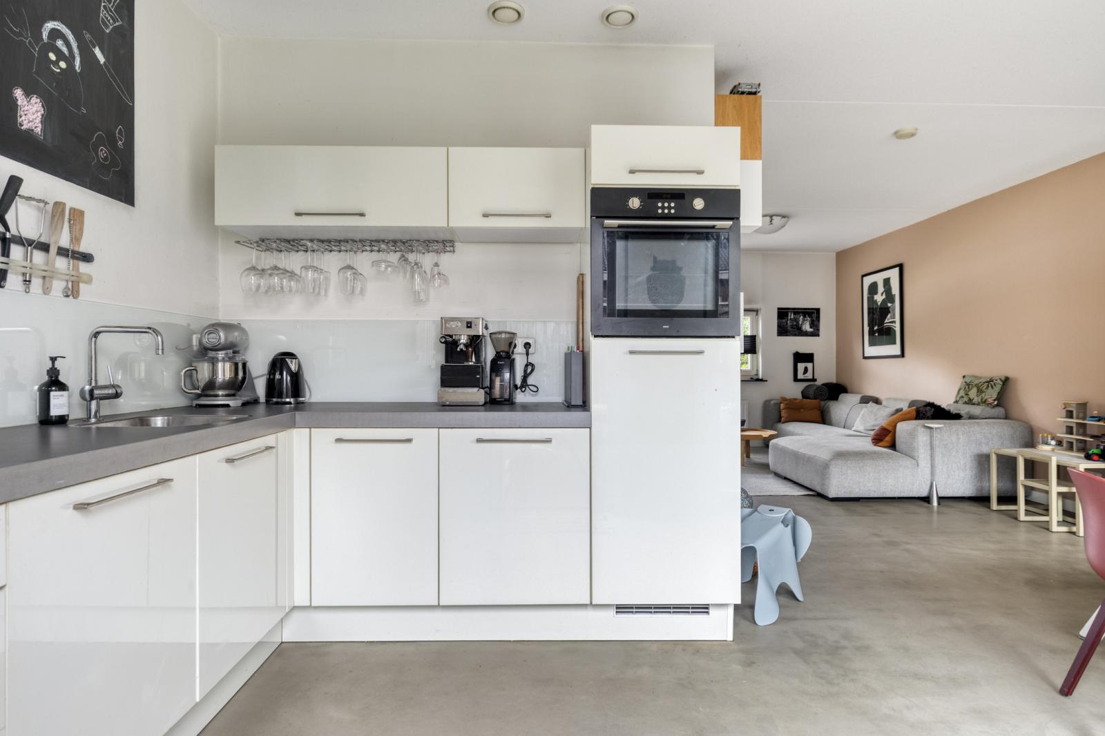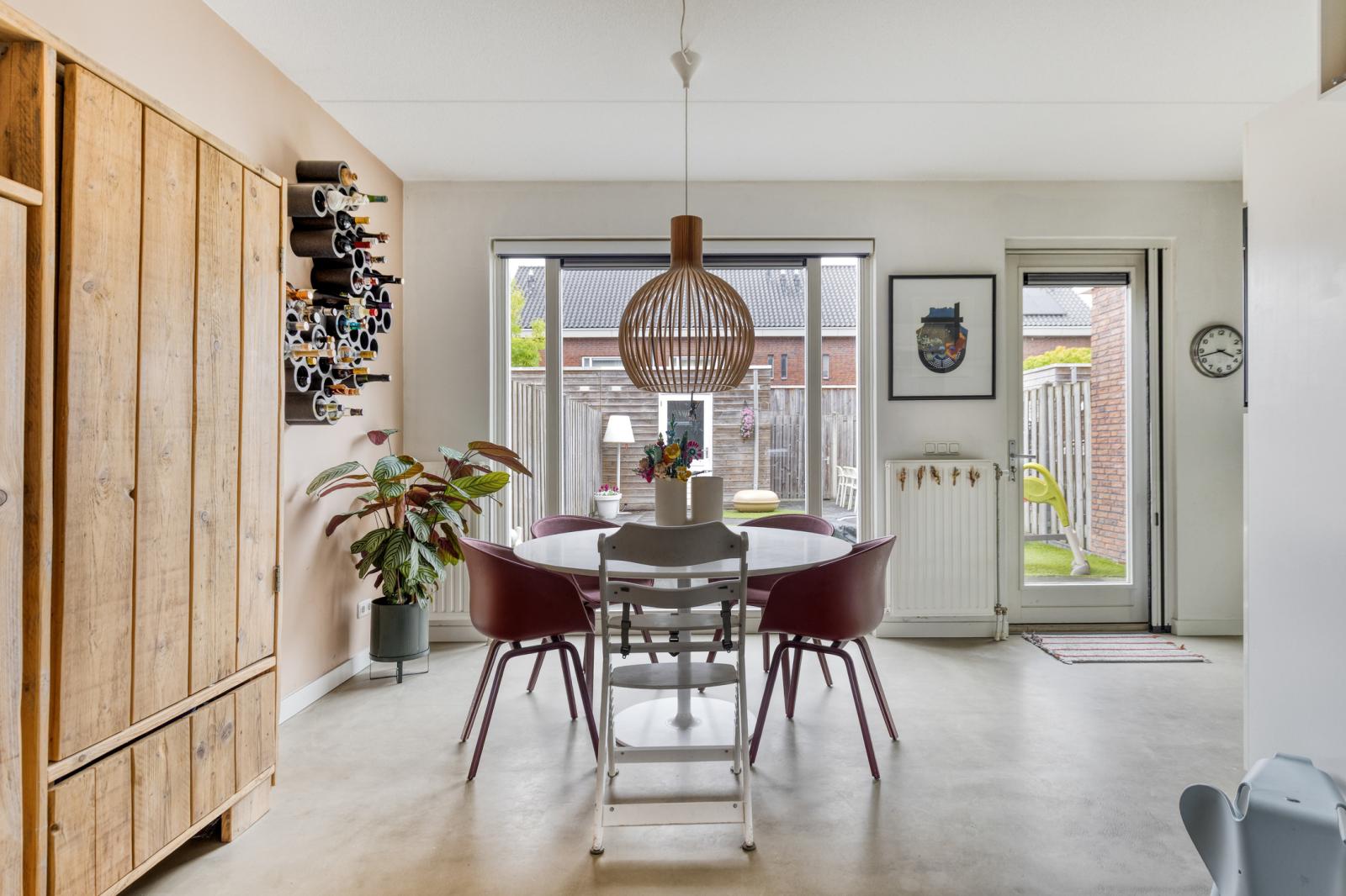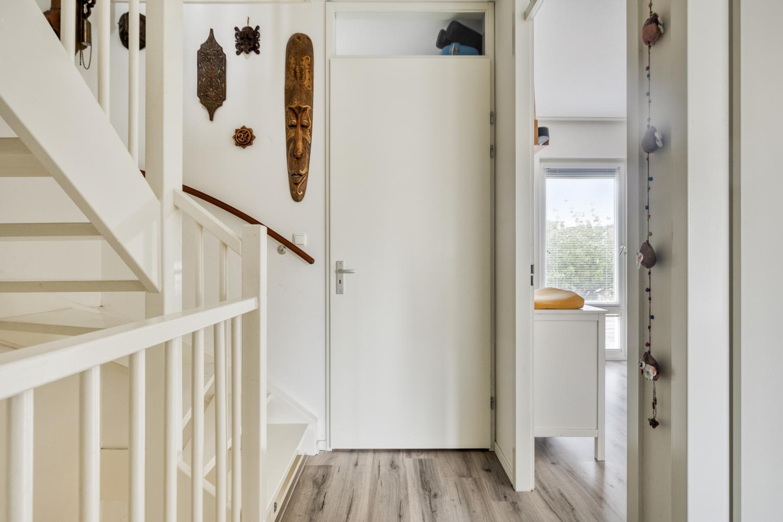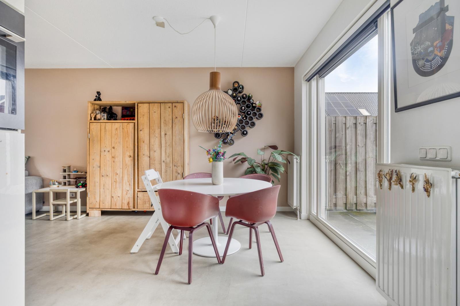 Entree met hal, meterkast, toilet en trapopgang. Onder de trap is een praktische opbergruimte gerealiseerd. De woonkamer heeft een zithoek aan de voorzijde en een eethoek aan de achterzijde, waar een grote raampartij met tuindeur uitzicht geeft op de tuin. De open keuken is voorzien van diverse inbouwapparatuur.