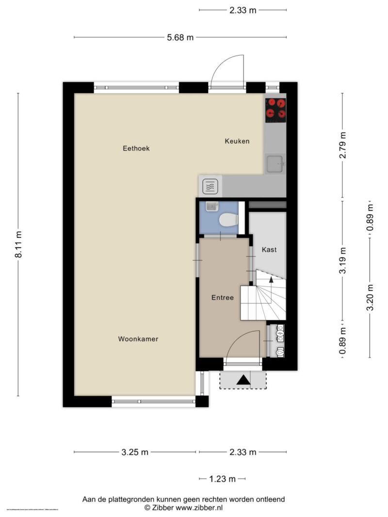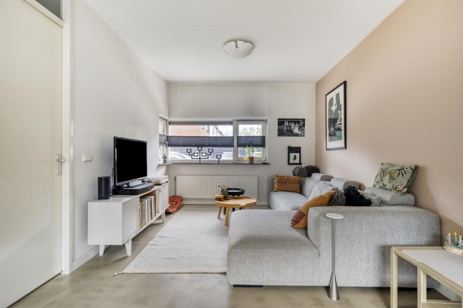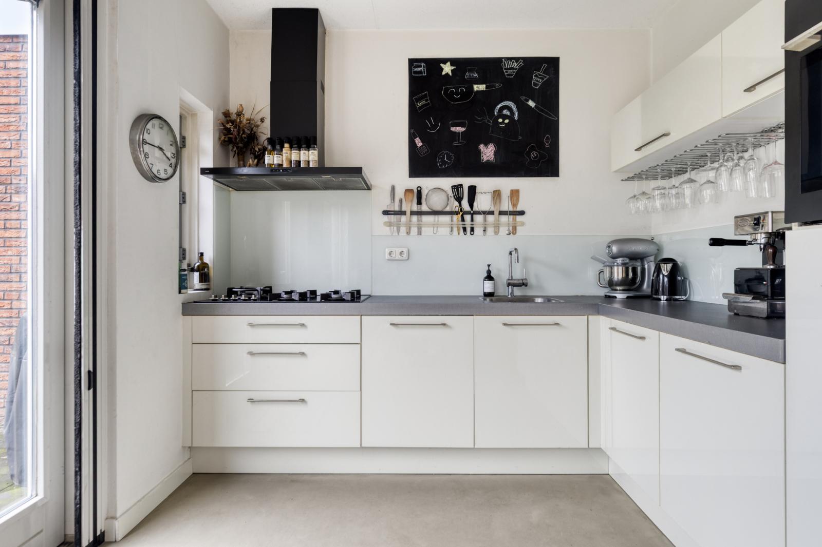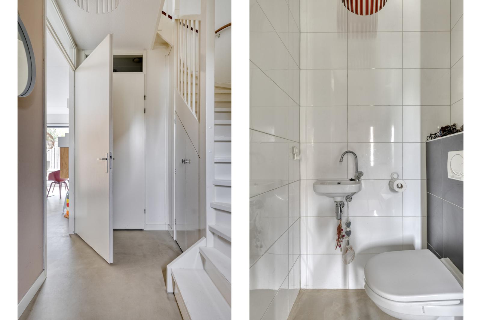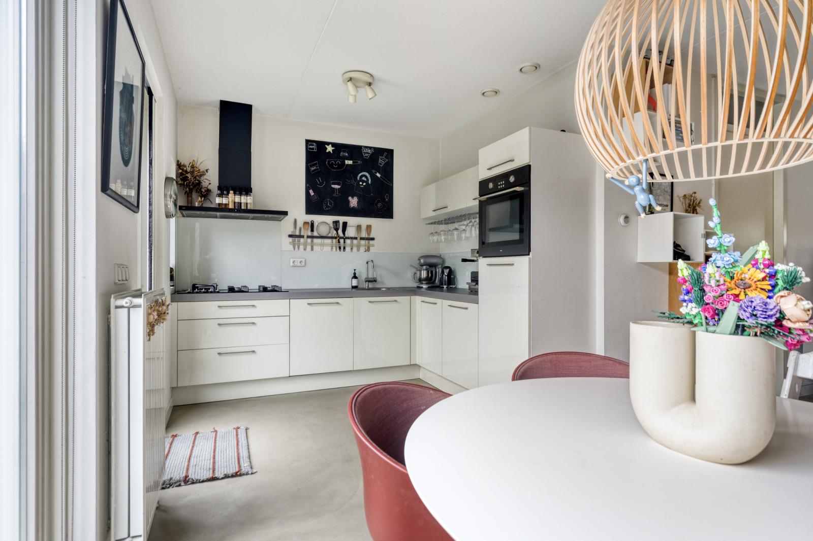 Entree met hal, meterkast, toilet en trapopgang. Onder de trap is een praktische opbergruimte gerealiseerd. De woonkamer heeft een zithoek aan de voorzijde en een eethoek aan de achterzijde, waar een grote raampartij met tuindeur uitzicht geeft op de tuin. De open keuken is voorzien van diverse inbouwapparatuur.