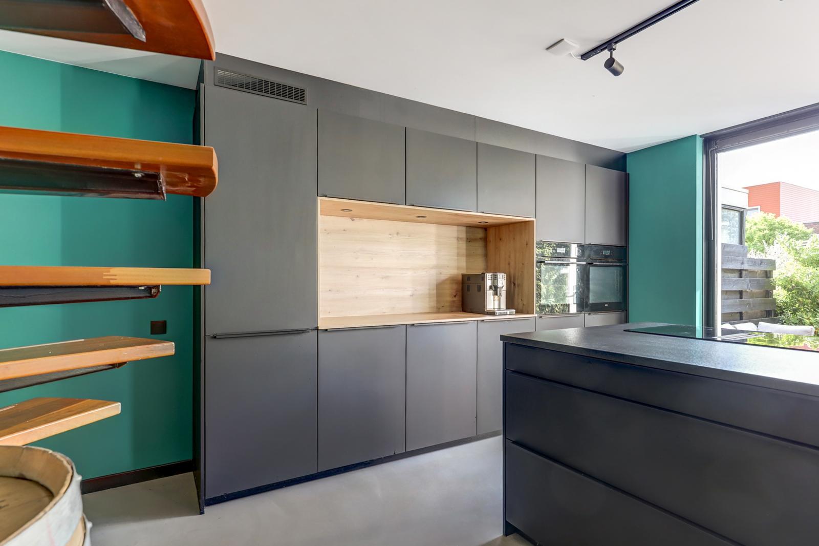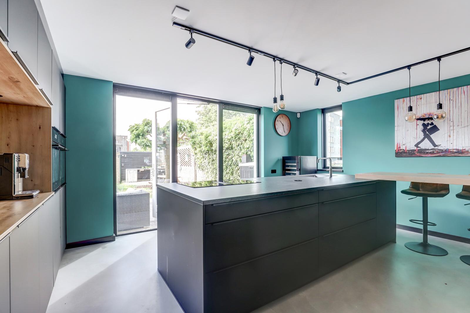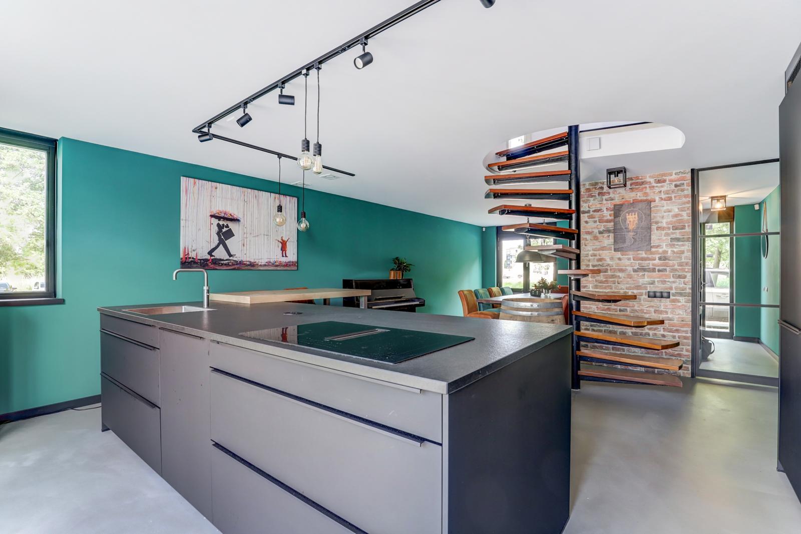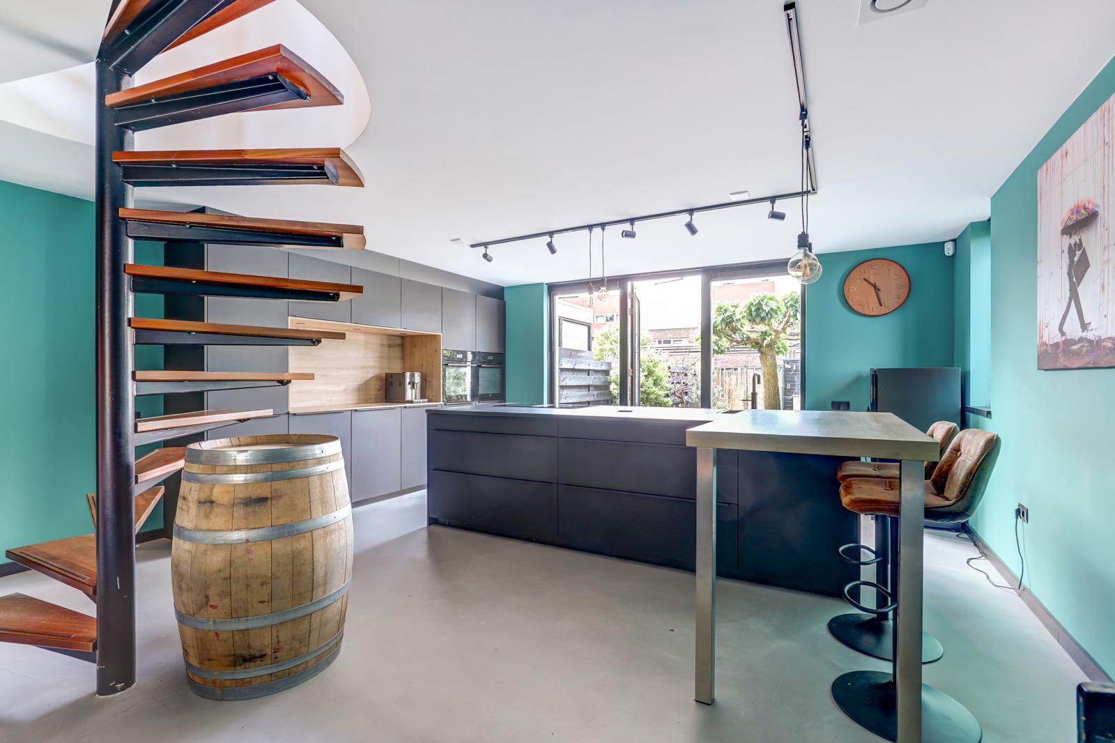 Via de entree kom je in de hal waar zich het toilet met fonteintje en de meterkast bevindt. Via een stijlvolle stalen deur kom je in de royale woonkeuken met gietvloer en vloerverwarming. Deze keuken is een droom voor kookliefhebbers: overvloedig licht dankzij grote raampartijen en openslaande deuren naar de zonnige, groene achtertuin. De keuken is compleet uitgerust met onder andere een kookeiland met geïntegreerde afzuigkap, inductie kookplaat en Quooker. Verder heeft deze keuken veel opbergruimte, een stoomoven en een gewone oven (allebei met wifi), een xl vaatwasser, een xl koelkast en een separate vrieskast. Door de ruime opzet is dit dé plek voor gezellige diners met vrienden of familie.