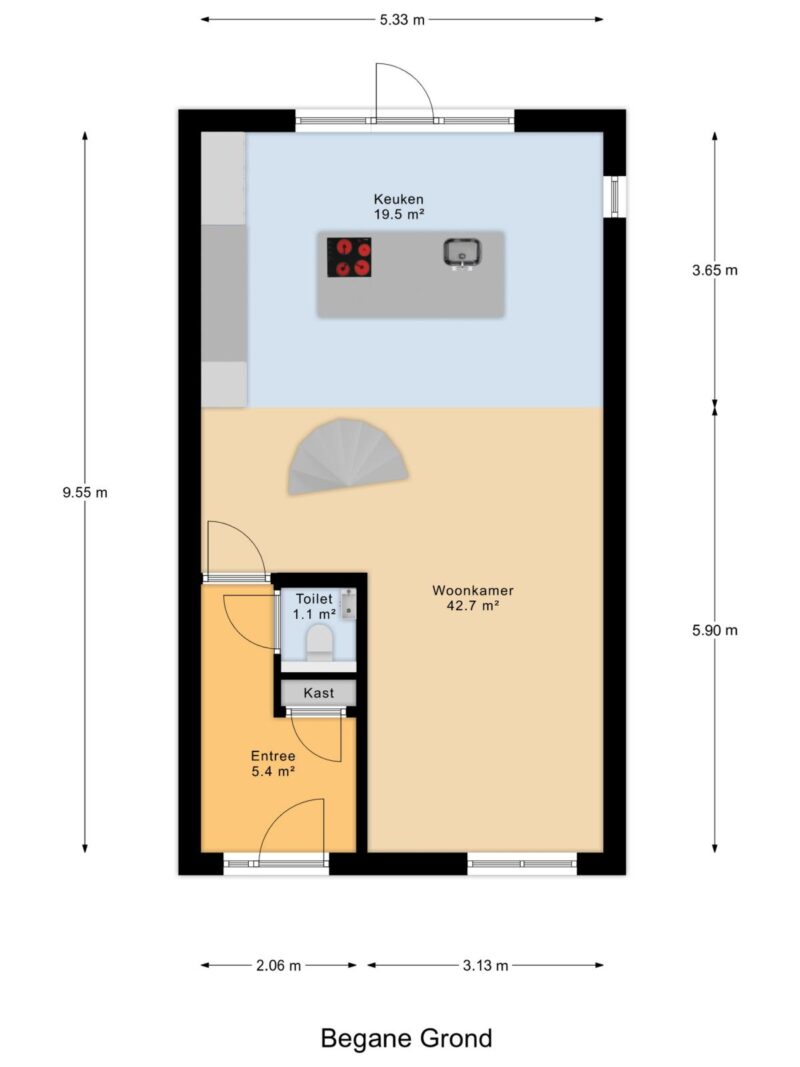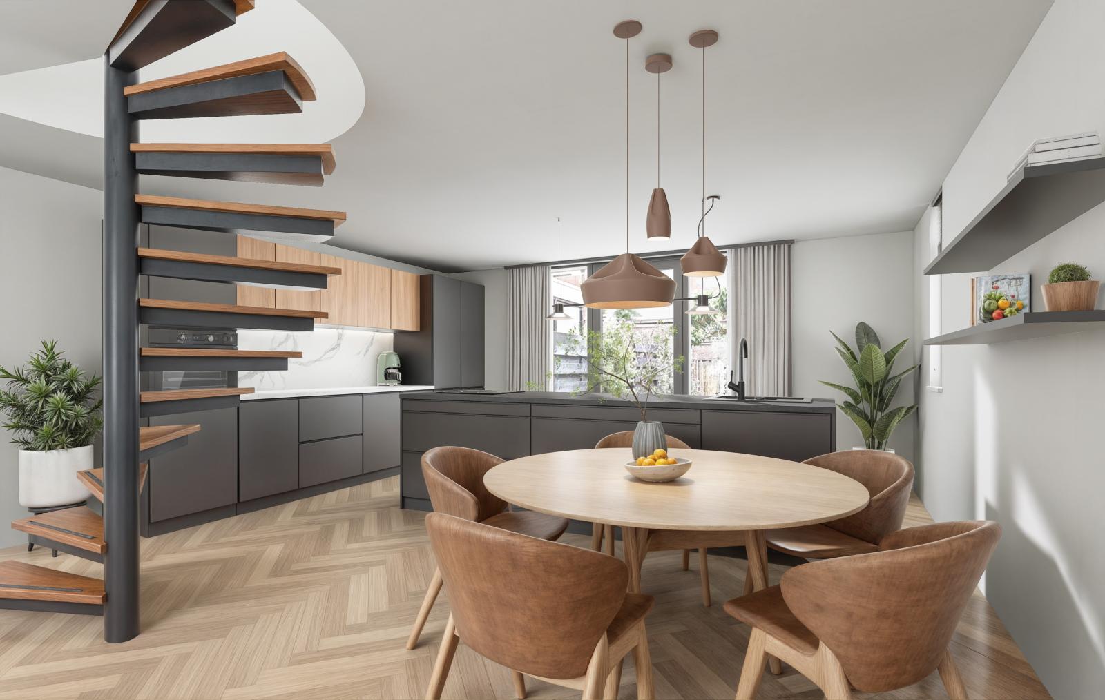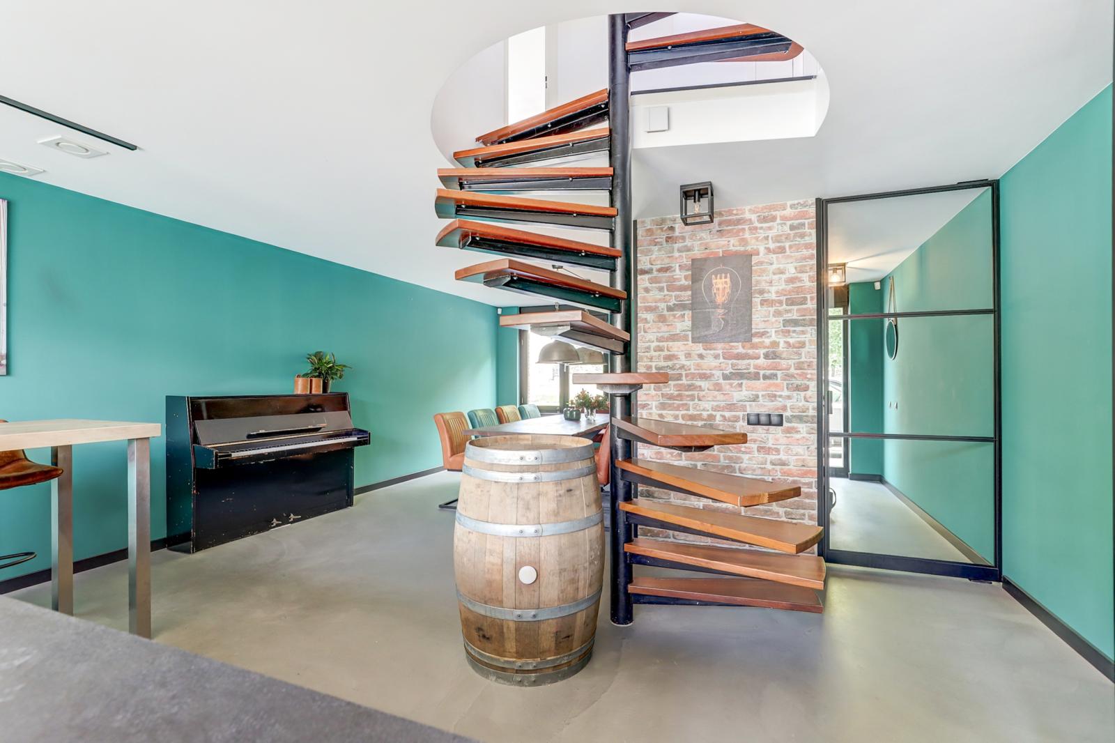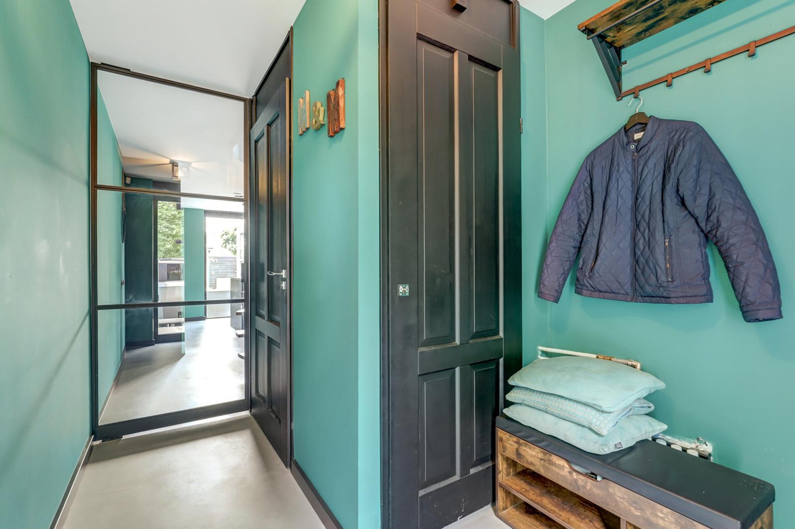 Via de entree kom je in de hal waar zich het toilet met fonteintje en de meterkast bevindt. Via een stijlvolle stalen deur kom je in de royale woonkeuken met gietvloer en vloerverwarming. Deze keuken is een droom voor kookliefhebbers: overvloedig licht dankzij grote raampartijen en openslaande deuren naar de zonnige, groene achtertuin. De keuken is compleet uitgerust met onder andere een kookeiland met geïntegreerde afzuigkap, inductie kookplaat en Quooker. Verder heeft deze keuken veel opbergruimte, een stoomoven en een gewone oven (allebei met wifi), een xl vaatwasser, een xl koelkast en een separate vrieskast. Door de ruime opzet is dit dé plek voor gezellige diners met vrienden of familie.