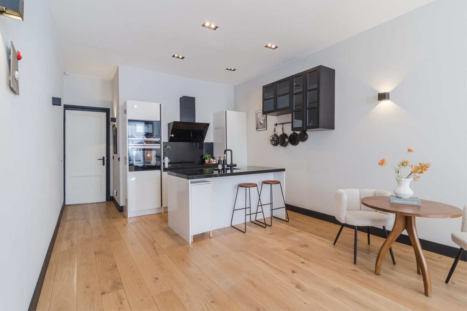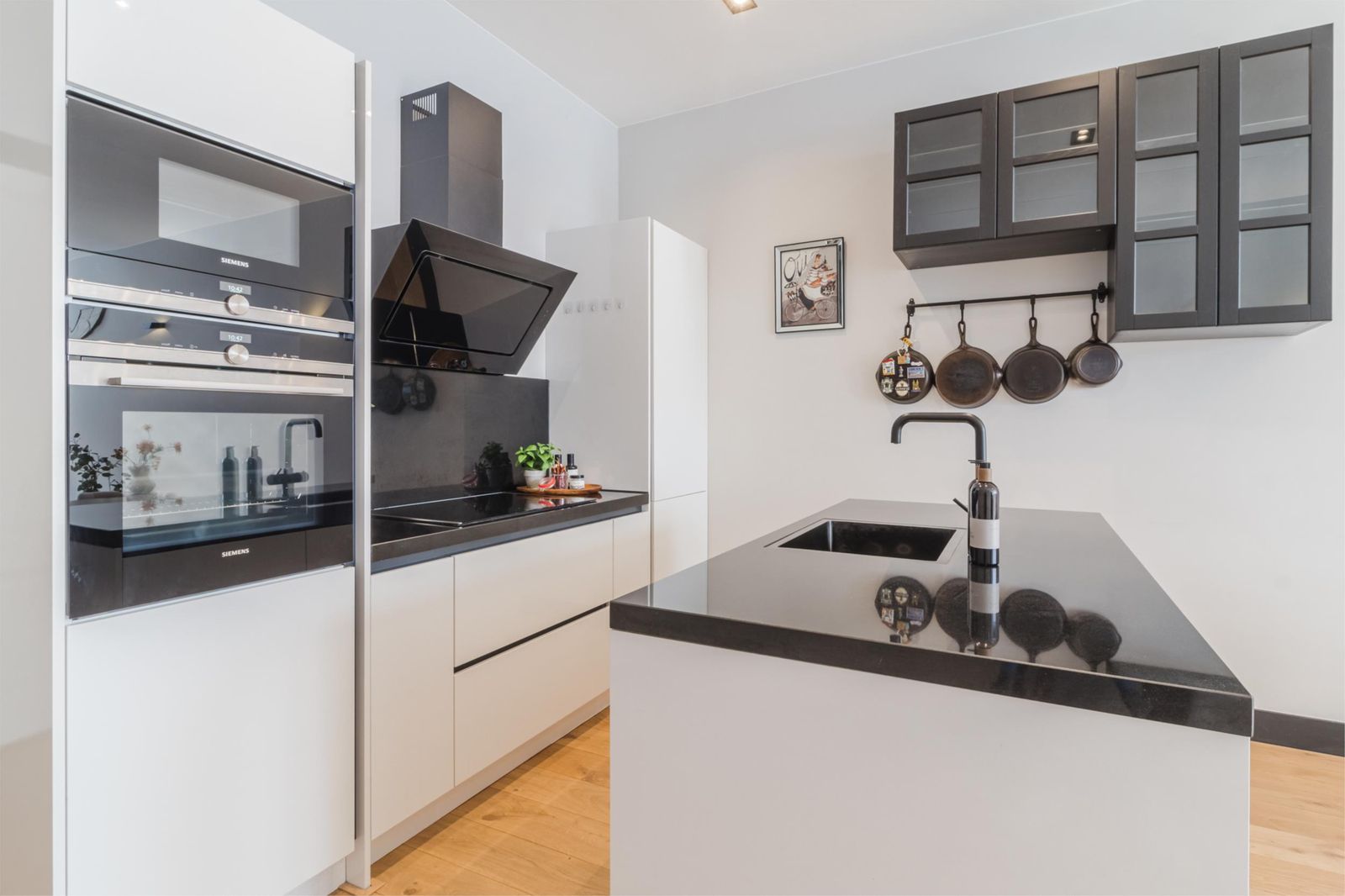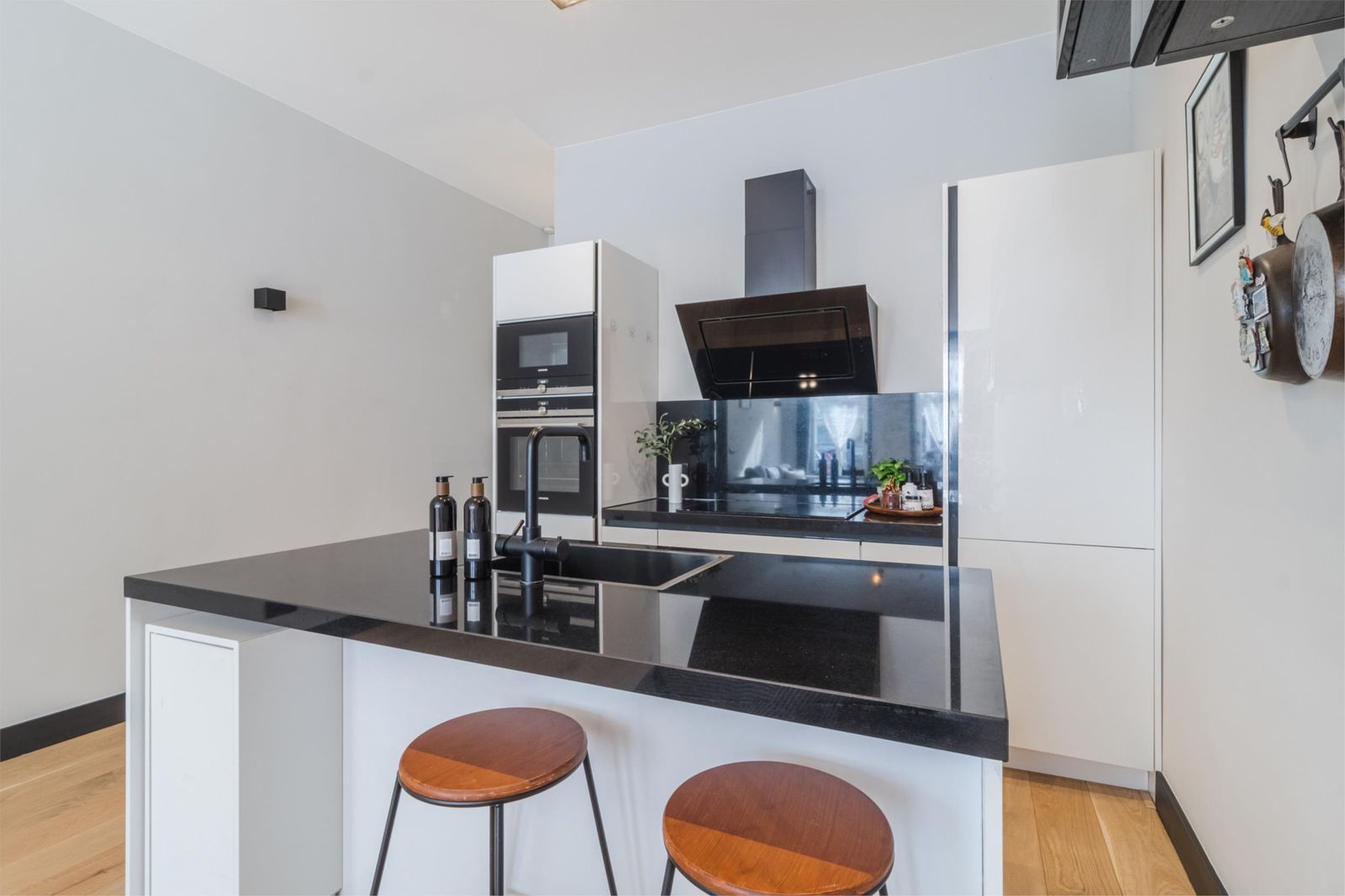 -Royale woonkamer (ca. 9.20 x 3.85) met luxe open keuken voorzien van kookeiland, Quooker, inductie kookplaat, design afzuigkap, heteluchtoven, combimagnetron, koelkast, vriezer en vaatwasser.