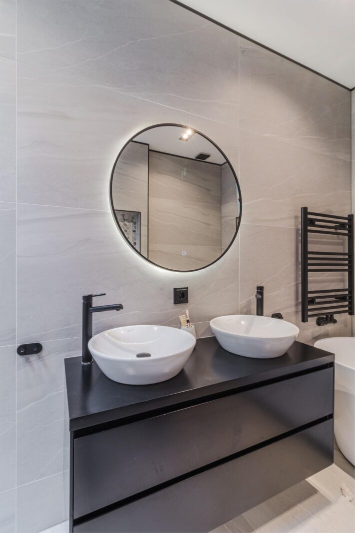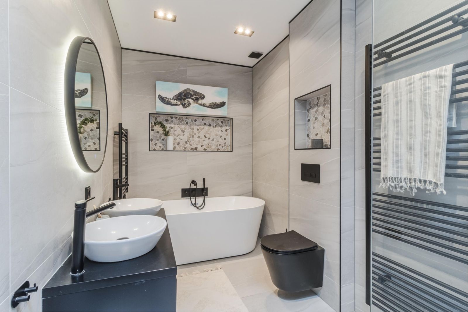-Spacious modern bathroom with bathtub, walk-in shower, and double washbasin