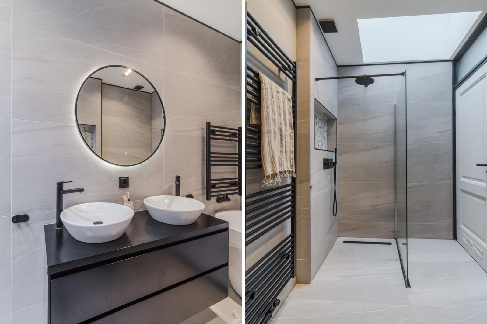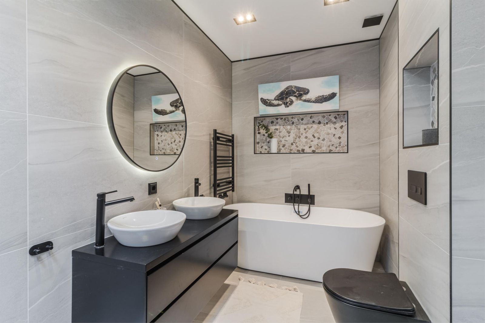 -Ruime moderne badkamer met ligbad, inloopdouche en dubbele wastafel