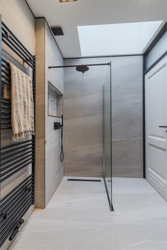 -Luxe moderne badkamer (ca. 4.00 x 1.92) met ligbad, inloopdouche, hangend toilet en wastafelmeubel met dubbele wasbak.