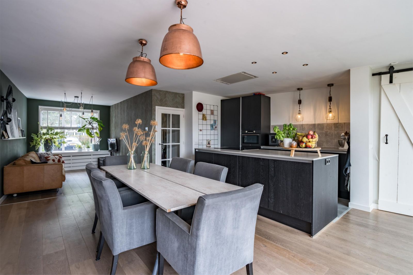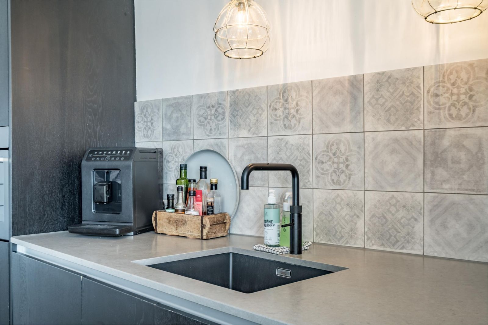 De stoere zwarte houten keuken met ruim kookeiland is uitgerust met een zwarte Quooker-kraan, inductiekookplaat, in het plafond weggewerkte afzuigkap, combi stoom- en heteluchtoven, koel-vriescombinatie en vaatwasser met drie lades. Het kookeiland van 2,4 meter lang beschikt over vier ruime lades en biedt aan de achterzijde extra praktische opbergruimte. Zowel de keuken als het kookeiland zijn afgewerkt met een composiet aanrechtblad.