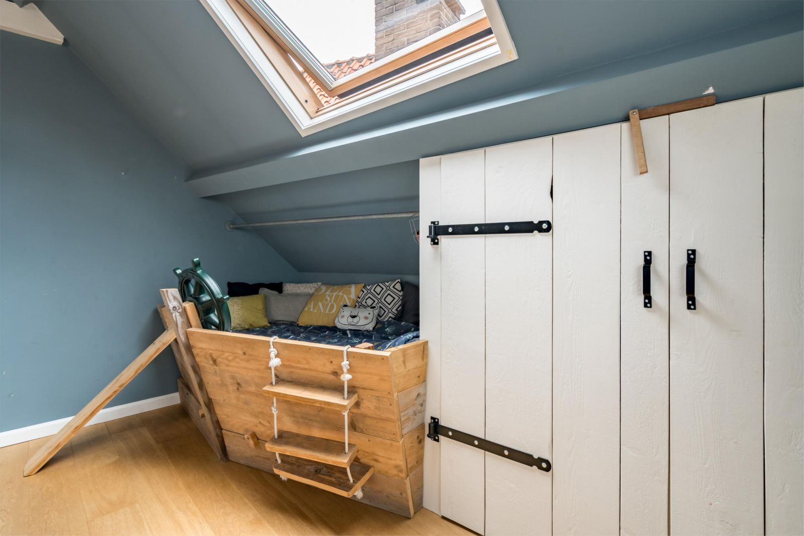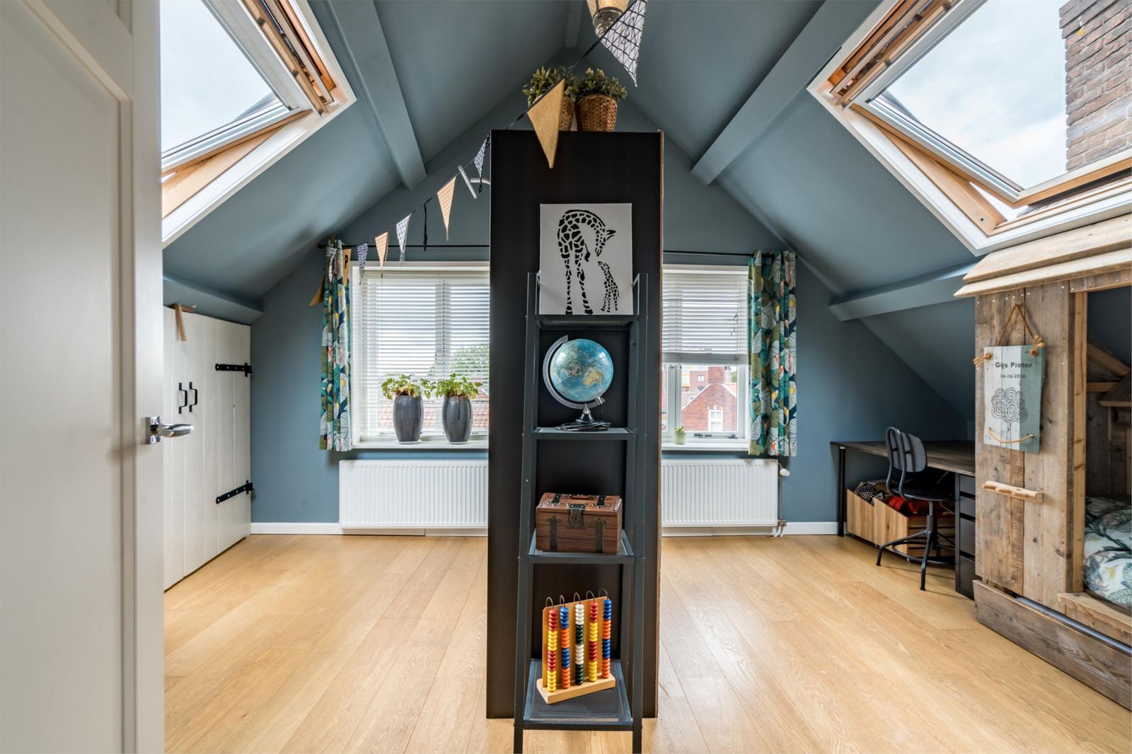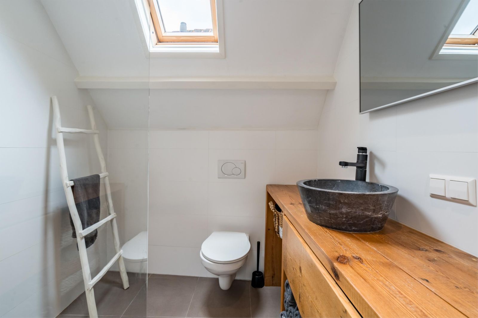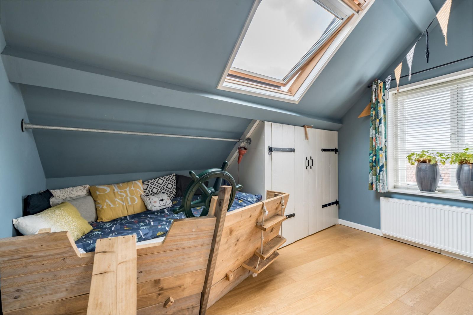 De overloop geeft toegang tot de slaapkamer aan de voorzijde, de betegelde badkamer met toilet en douche én de grote slaapkamer aan de achterzijde. Van deze slaapkamer kunnen eenvoudig twee slaapkamers worden gemaakt. Dankzij de twee grote Velux-dakramen komt er veel natuurlijk licht binnen.