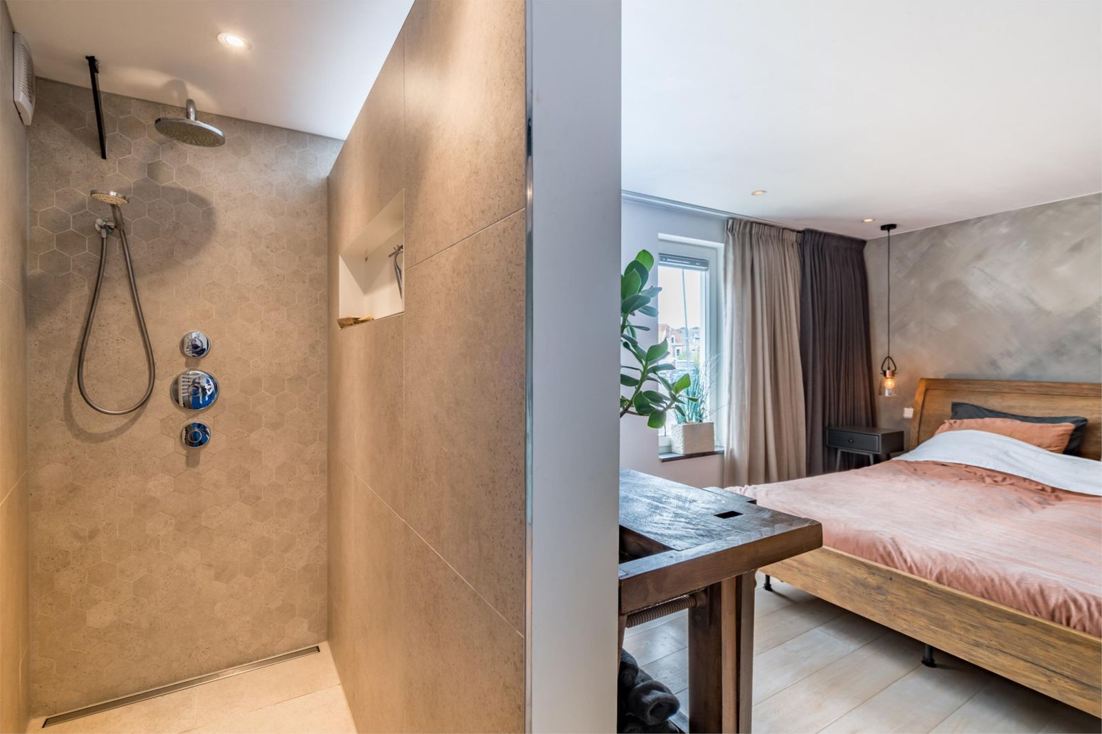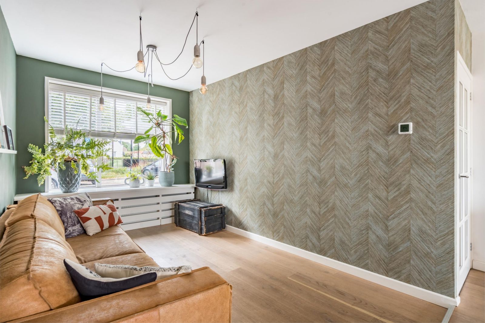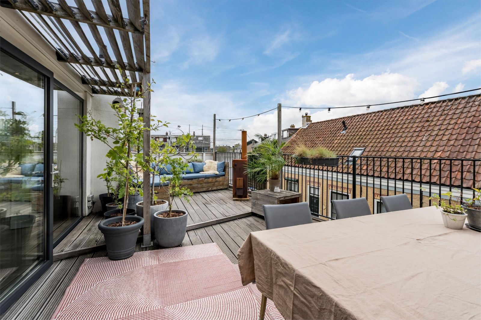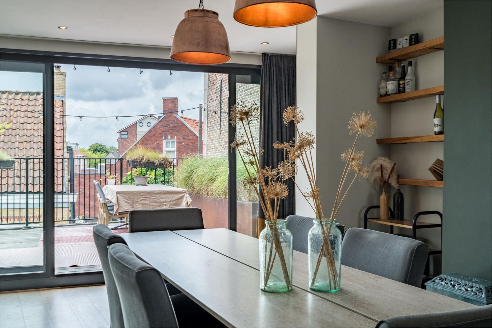 De sfeervolle leefruimte bestaat uit een woonkamer aan de voorzijde en een keuken met eetkamer aan de achterzijde. De achterzijde is voorzien van een grote glazen pui met twee openslaande deuren die een directe verbinding vormt met het ruime en zonnige dakterras. Dankzij de gunstige ligging kun je hier al vroeg in het voorjaar heerlijk buiten zitten.